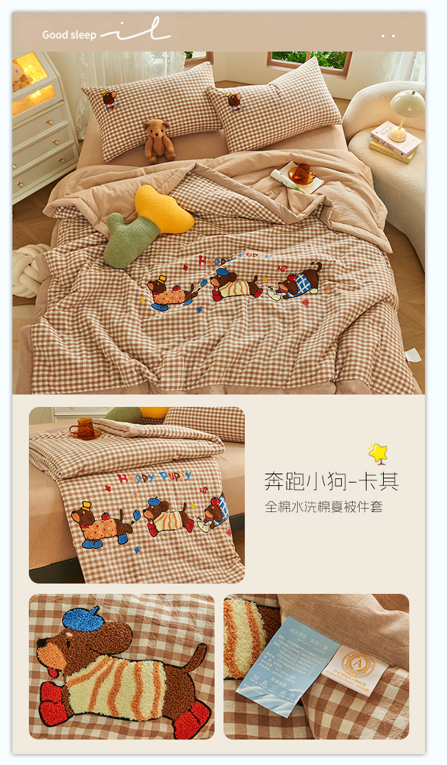 • 91家纺网 家纺一手货源 找家纺 徕米家居  2025新款色织全棉纯棉绣花夏被夏凉被空调被四件套 奔跑小狗-卡其