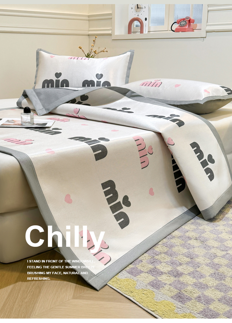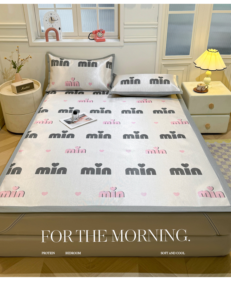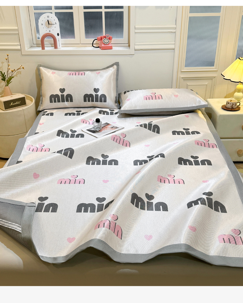 LIFE.丽芙 2025春夏季新品数码印花冰藤凉席平铺冰丝凉席印花小清新绑带款三件套(风格一) 甜心粉