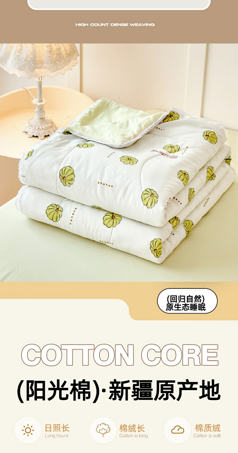 当前位置: 91家纺网 > 商品网购 > 被子 > 夏被 > 仁凯家纺 2025新款A类针织棉双层纱100%新疆棉花花边夏凉被(包检测)(提供买家秀) 倾心南瓜