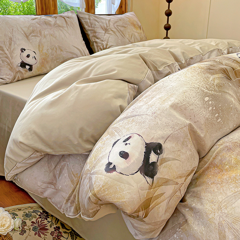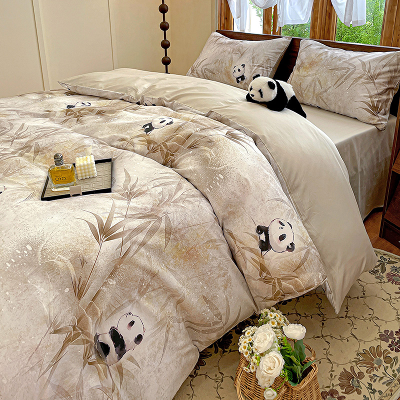 耀悦家纺 2025年60支纯棉印花四件套长绒棉被套床单 熊猫竹景