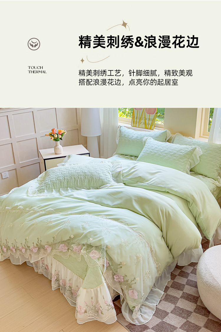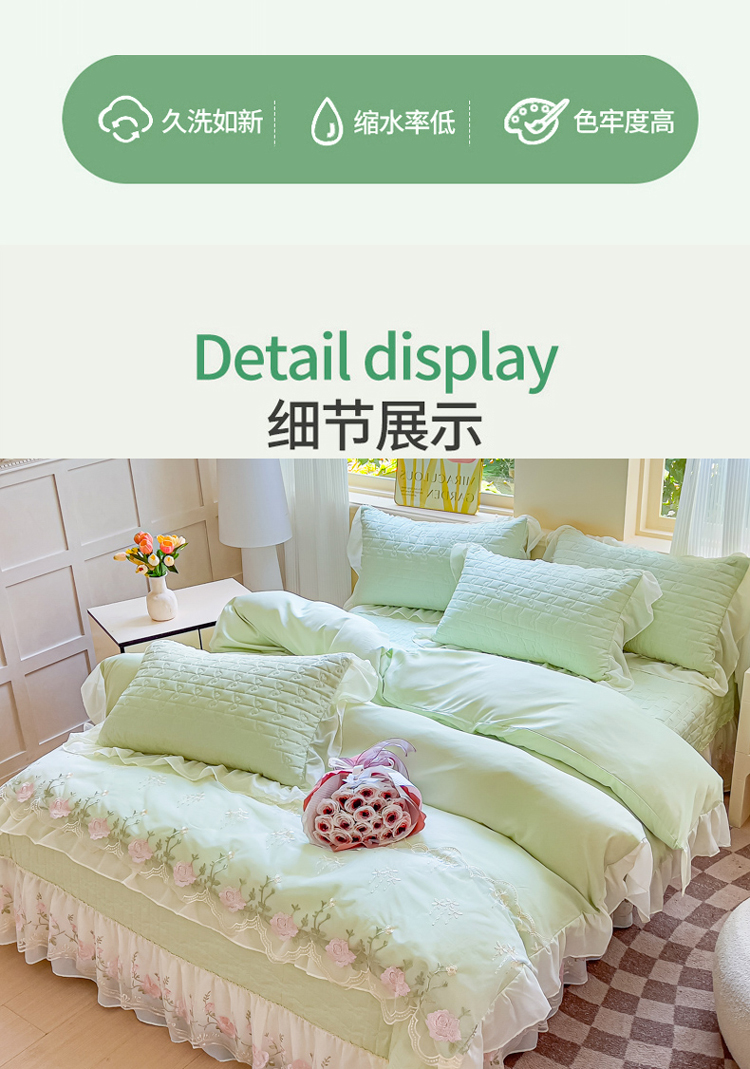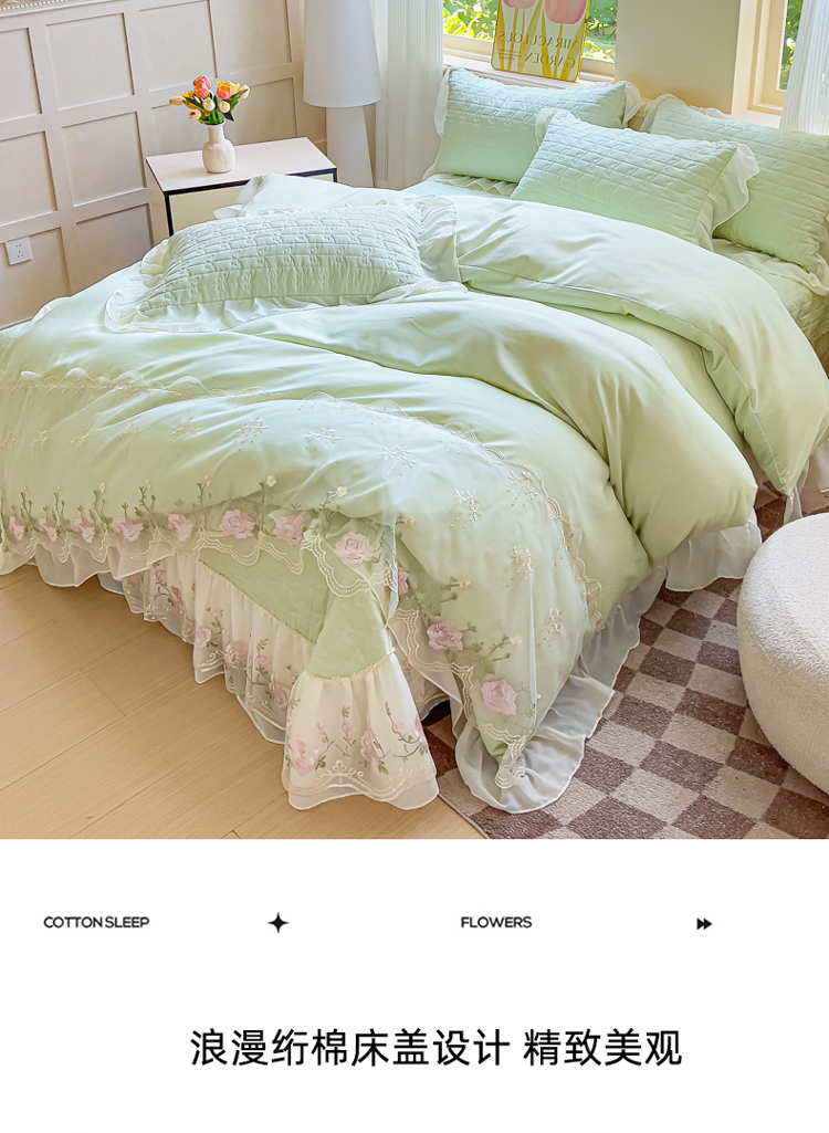 商品名称:漫布云家纺2025春夏韩版法式公主风水洗棉床盖款多功能被套 夏被床盖四件套多功能二合一水洗棉夹泡泡棉小竺棉棉床裙款 花恋-奶油绿