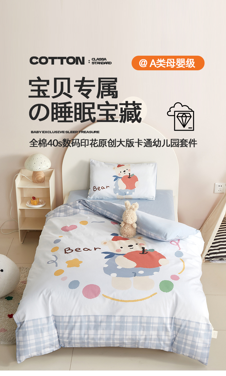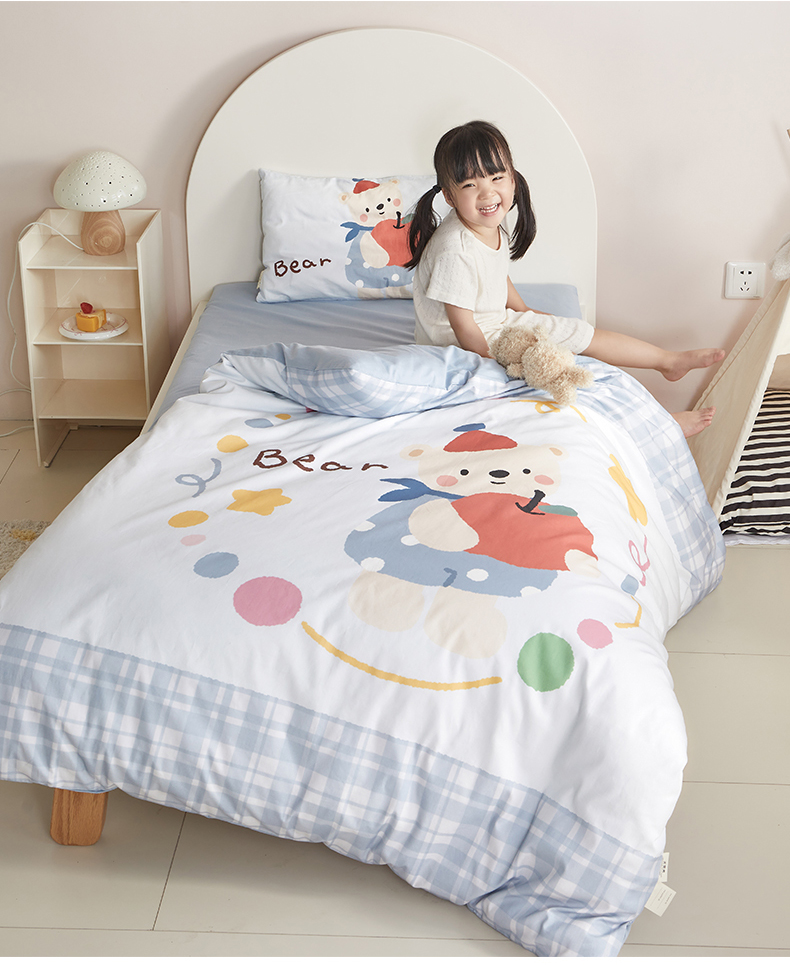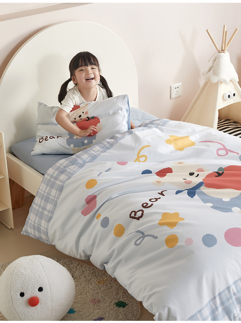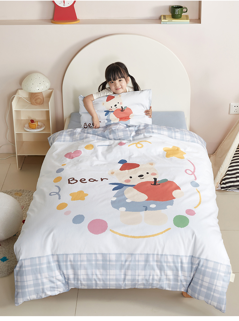 当前位置: 91家纺网 > 商品网购 > 床品套件 > 多件套 > 多件套 > 荷马之梦 2025新款学院系列—A类32s水洗棉贴布绣原创卡通拼接儿童幼儿园套件 苹果熊
