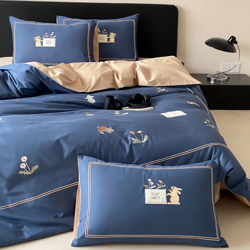 商品名称:初拾 2025新款100s全棉纯棉治愈系绣花四件套-雏菊兔 雏菊兔-藏青