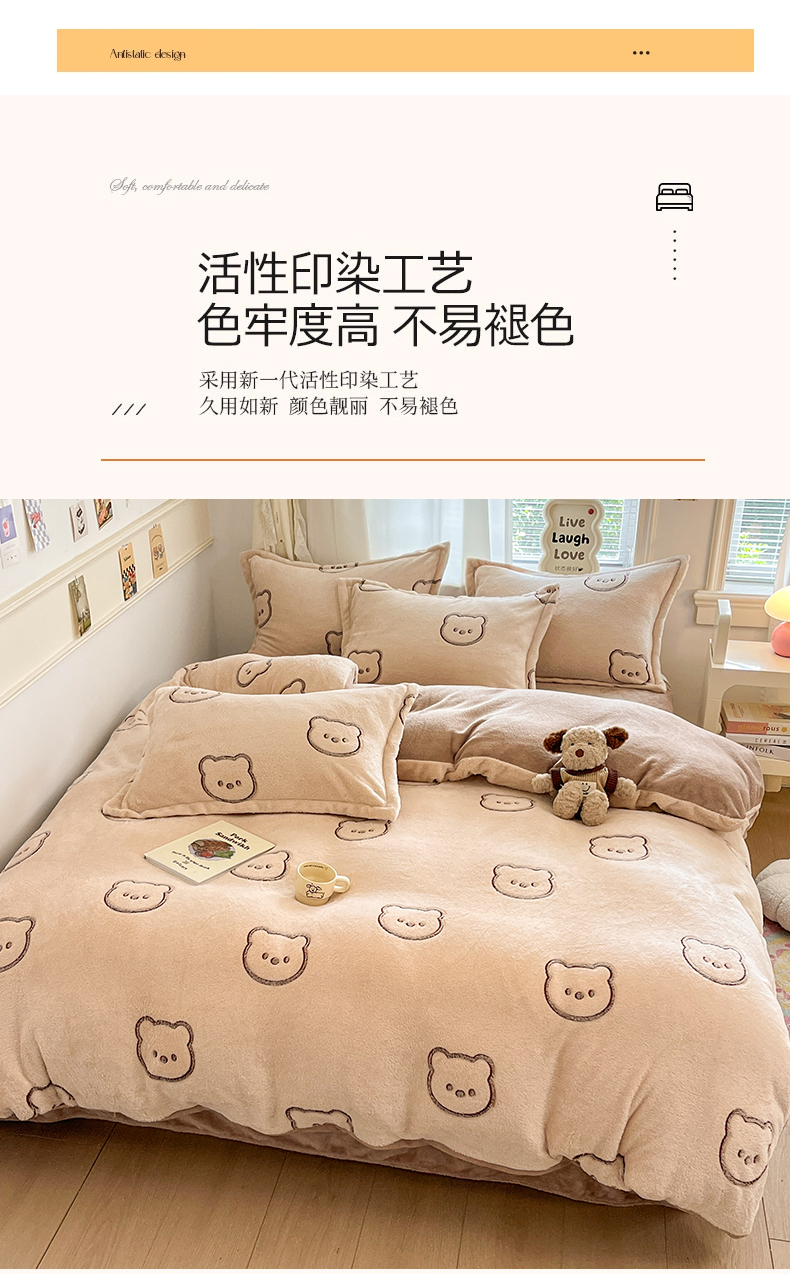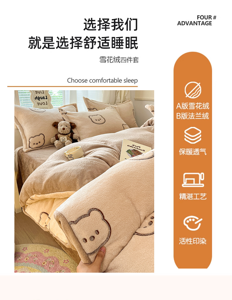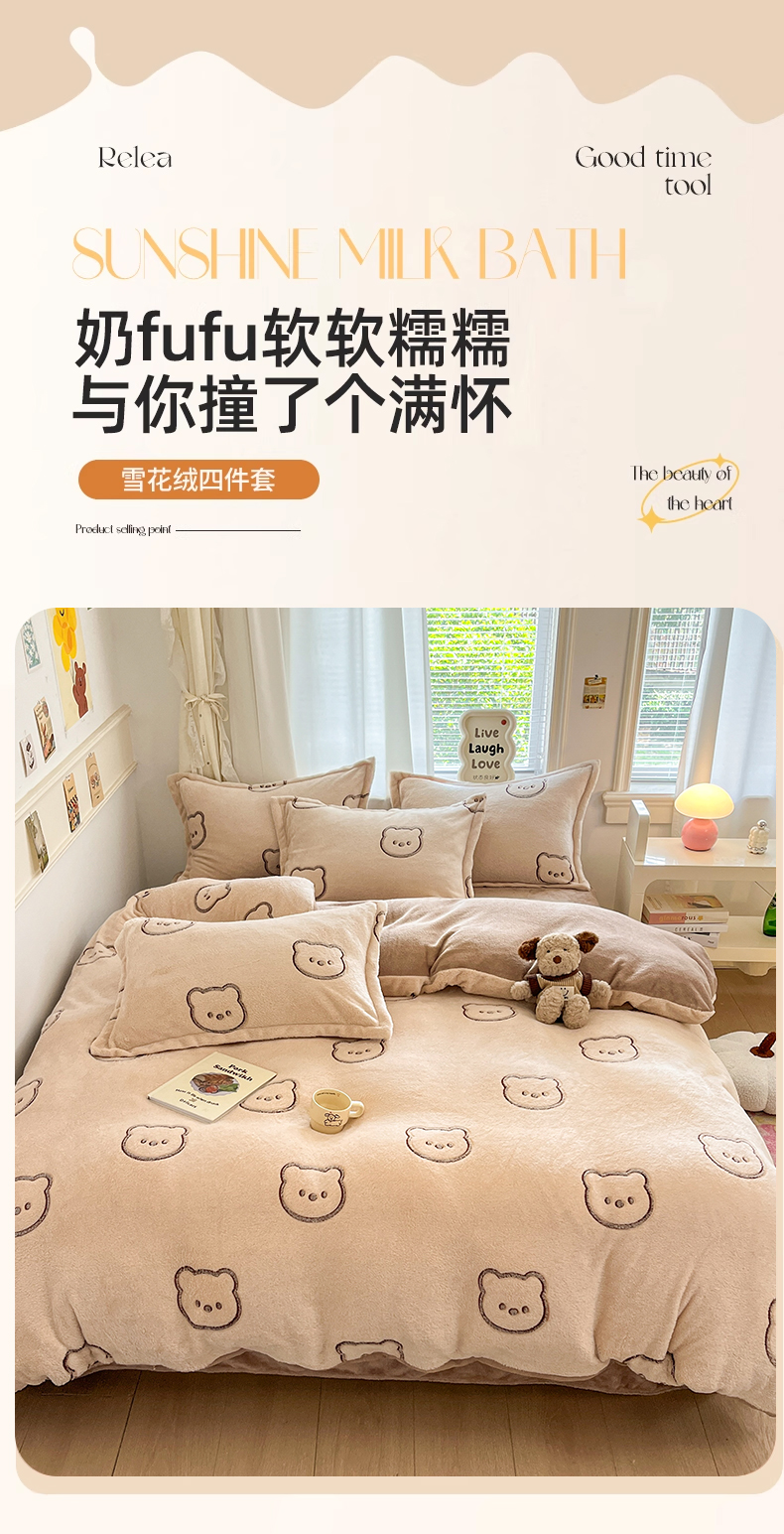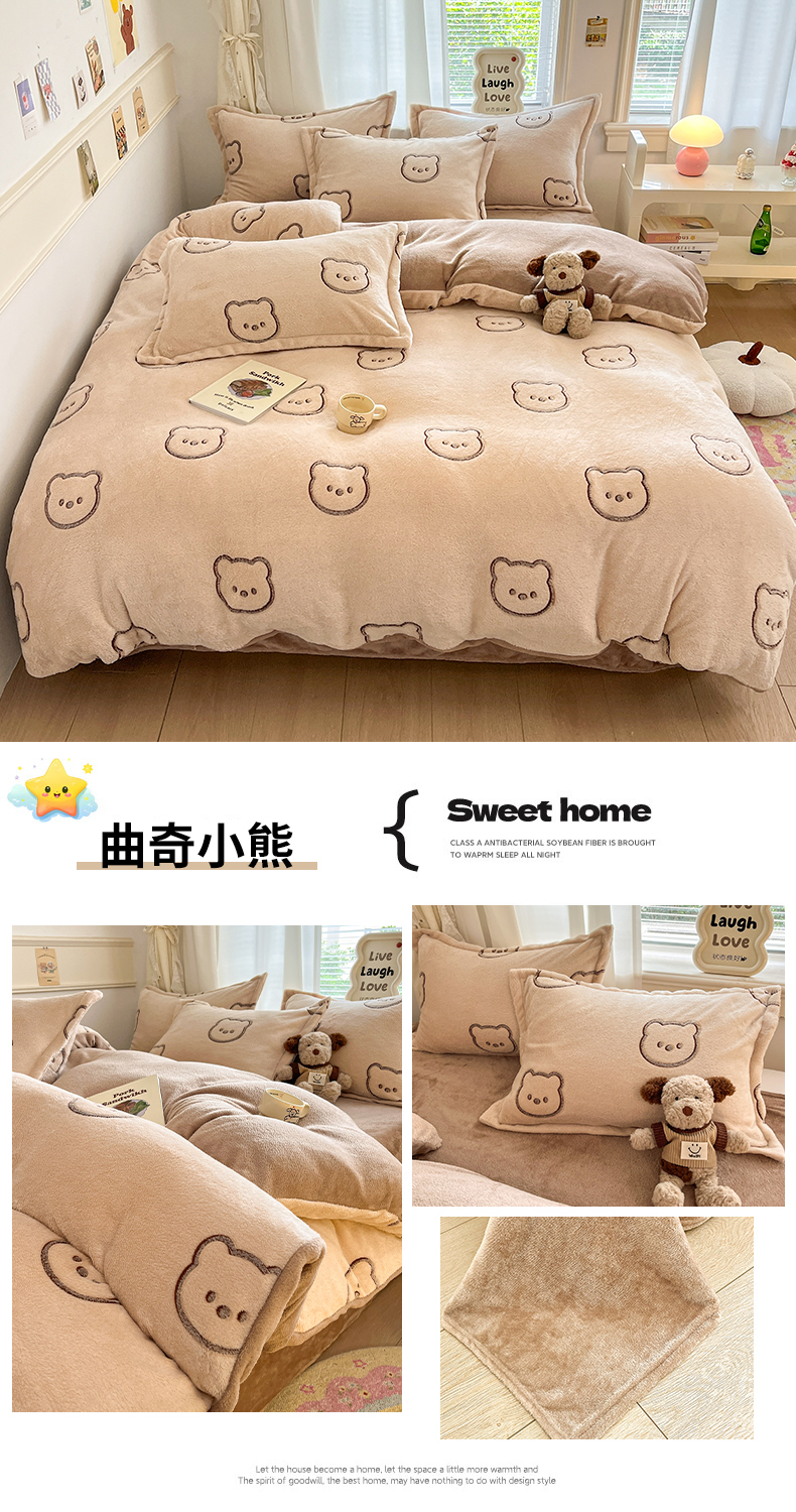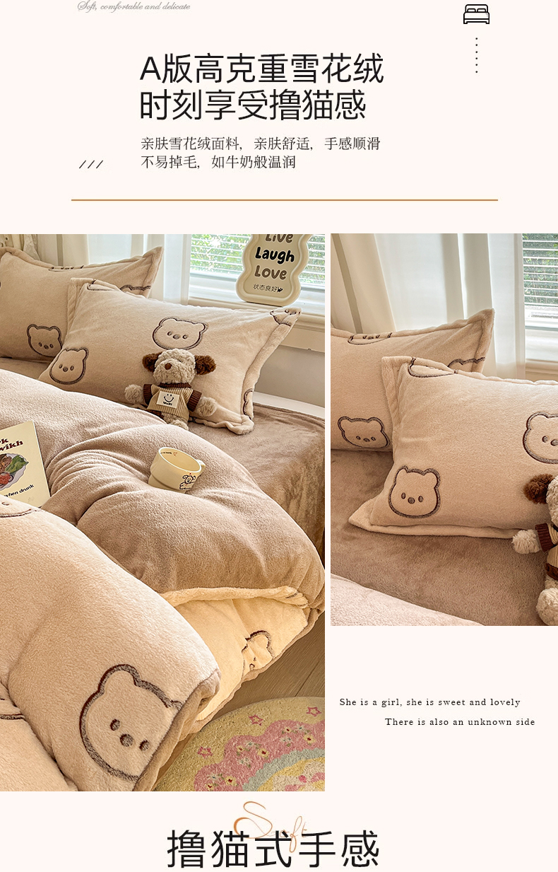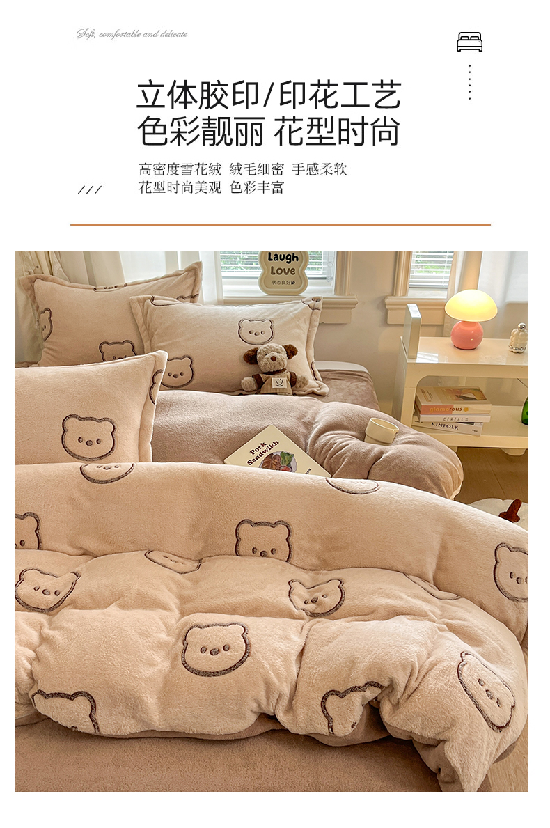 当前位置: 91家纺网 > 商品网购 > 床品套件 > 四件套 > 法莱绒四件套 > 川悦生活2025新款立体雪花绒印花大床四件套系列二场景二 曲奇小熊