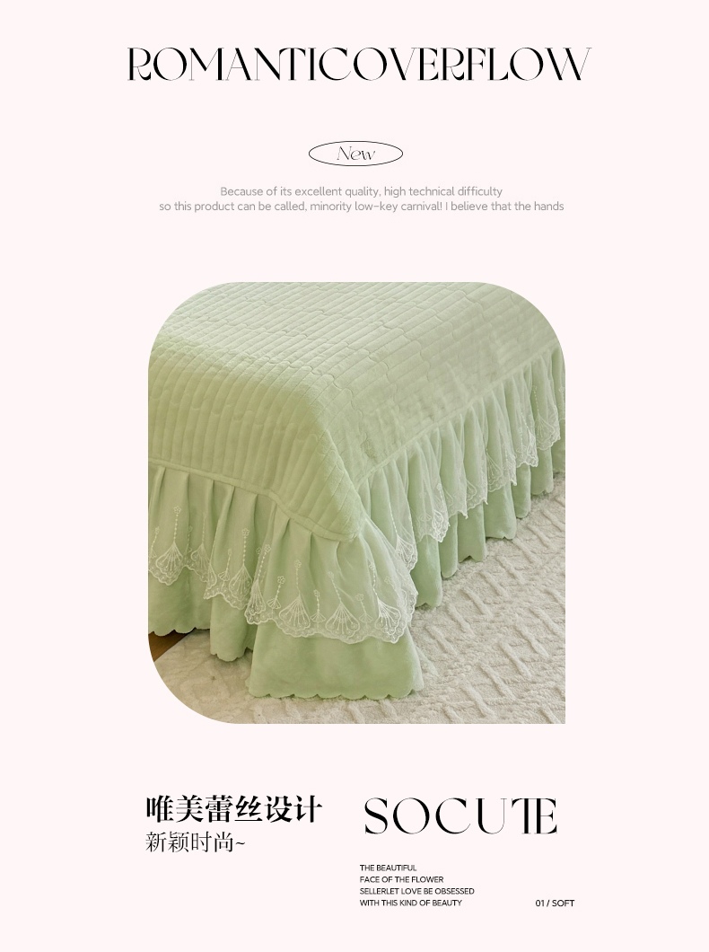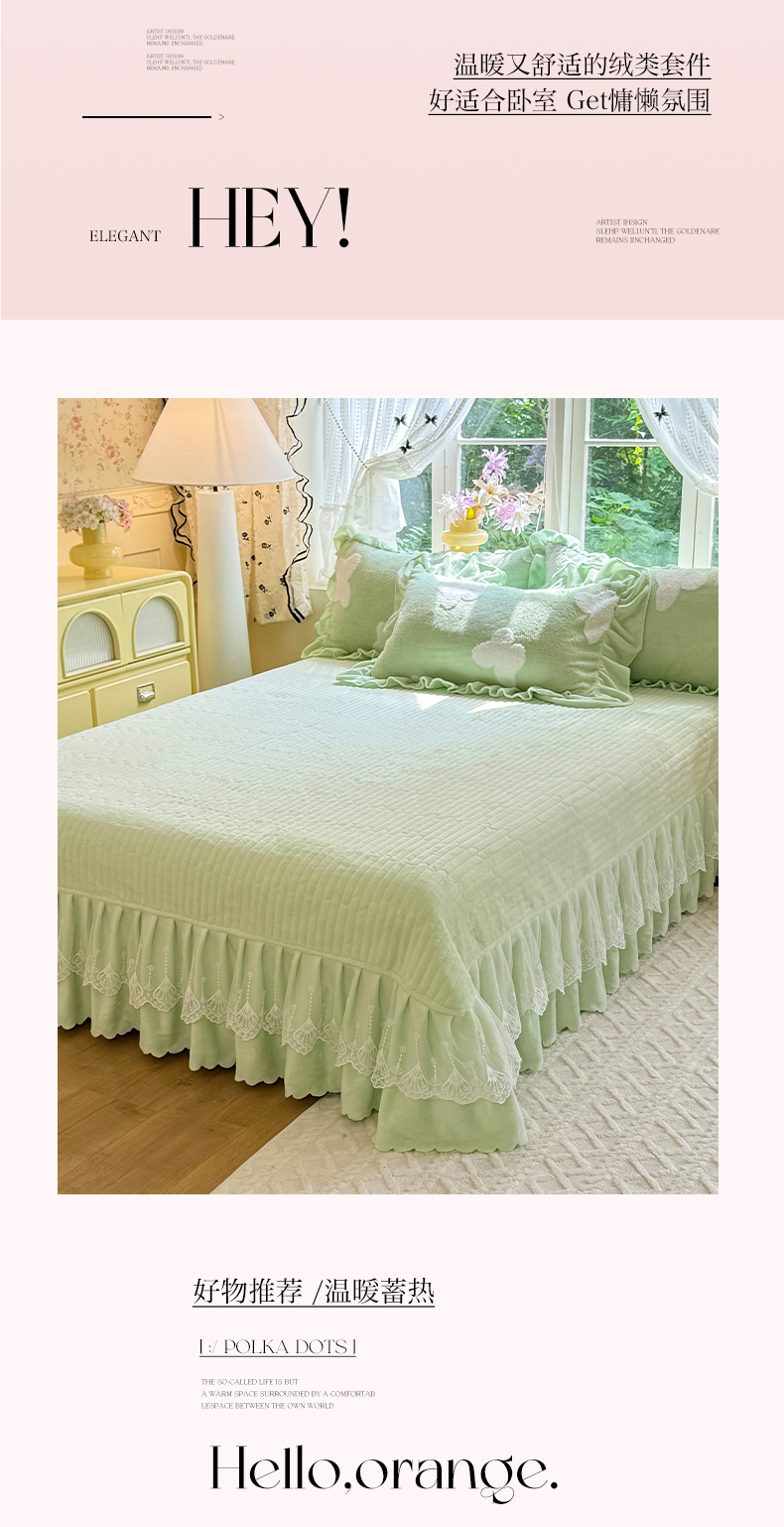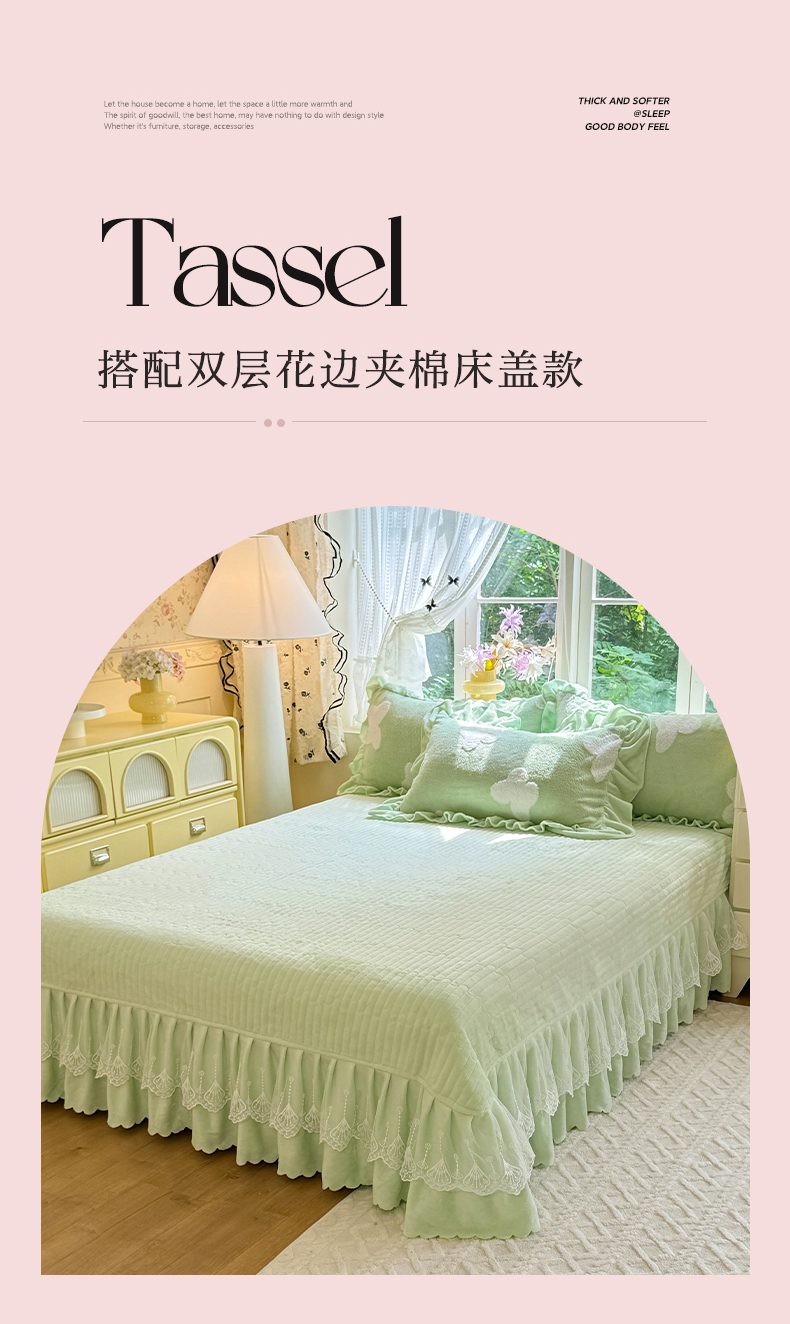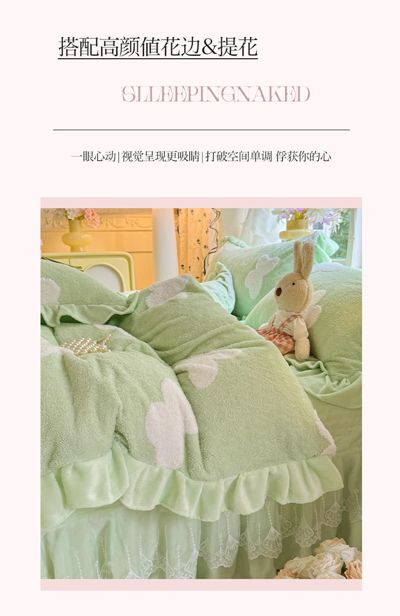 商品名称:唐人居 2025新款高克重阳离子牛奶绒花边夹棉床盖四件套 蝶恋花-果绿