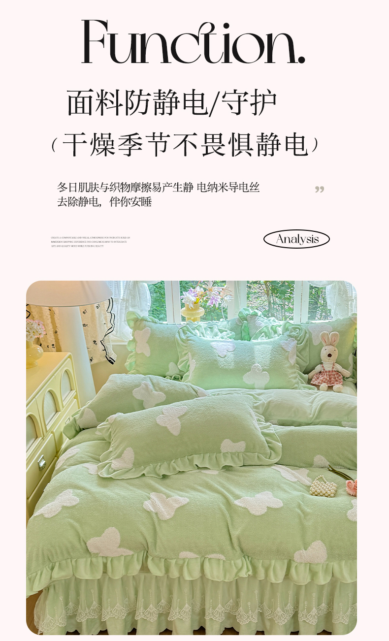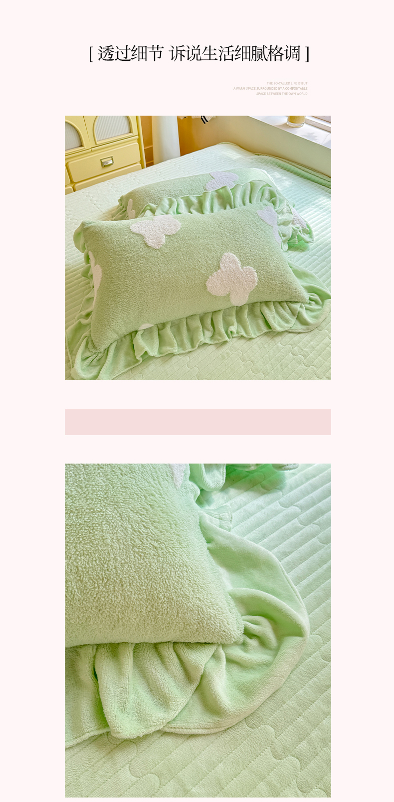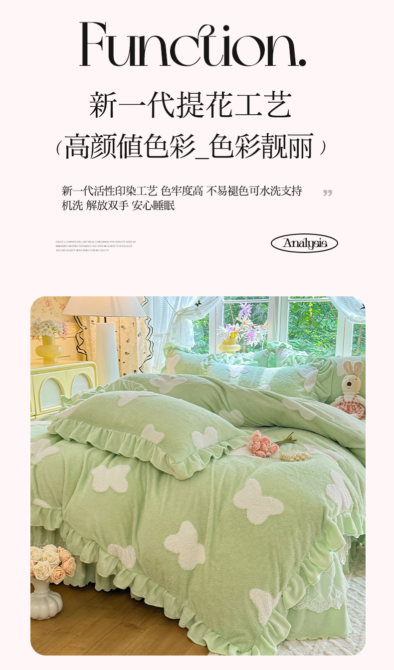 商品名称:唐人居 2025新款高克重阳离子牛奶绒花边夹棉床盖四件套 蝶恋花-果绿