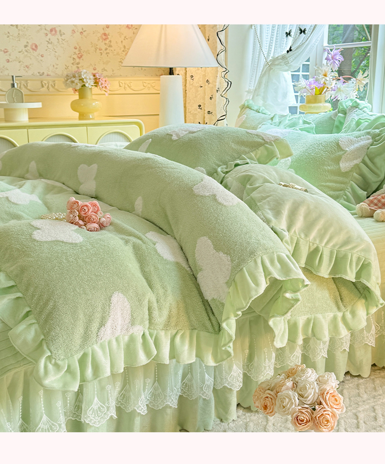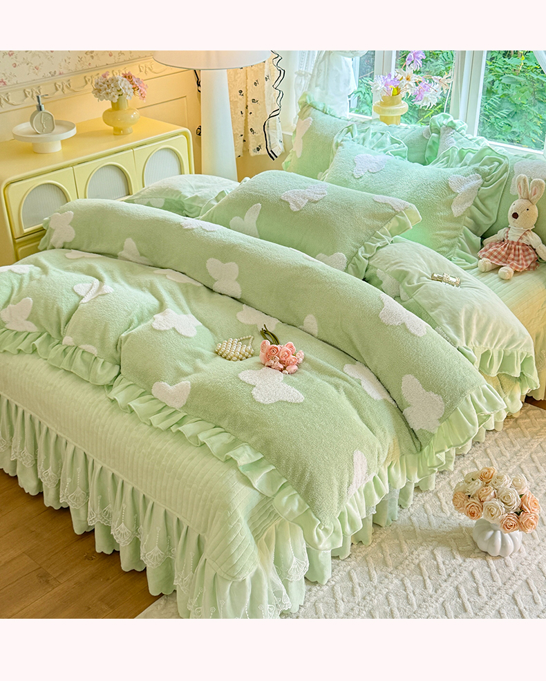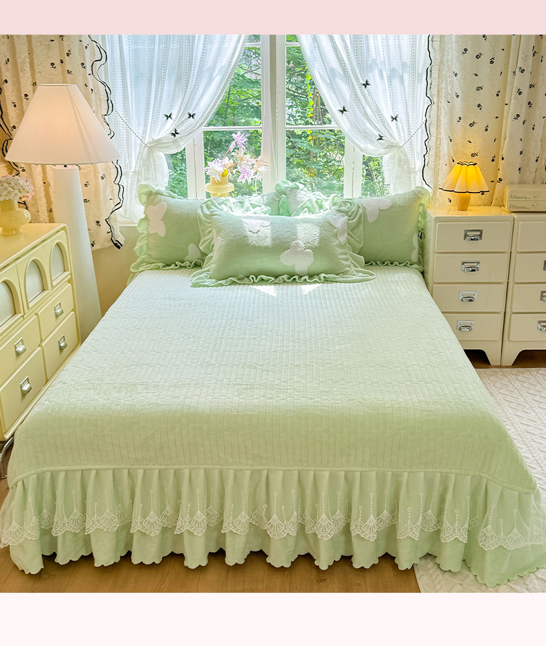 唐人居 2025新款高克重阳离子牛奶绒花边夹棉床盖四件套 蝶恋花-果绿