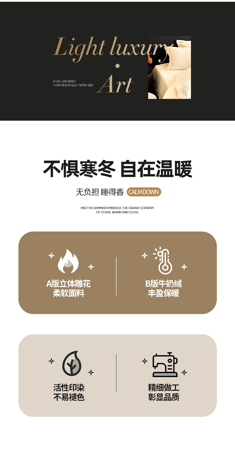 (总)金阳光家纺 2024新款立体雕花牛奶绒四件套,豆沙色,灰色,奶茶棕,浅蓝色,浅绿色,浅驼色,浅玉色,浅紫色