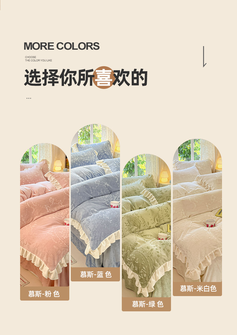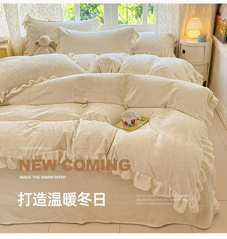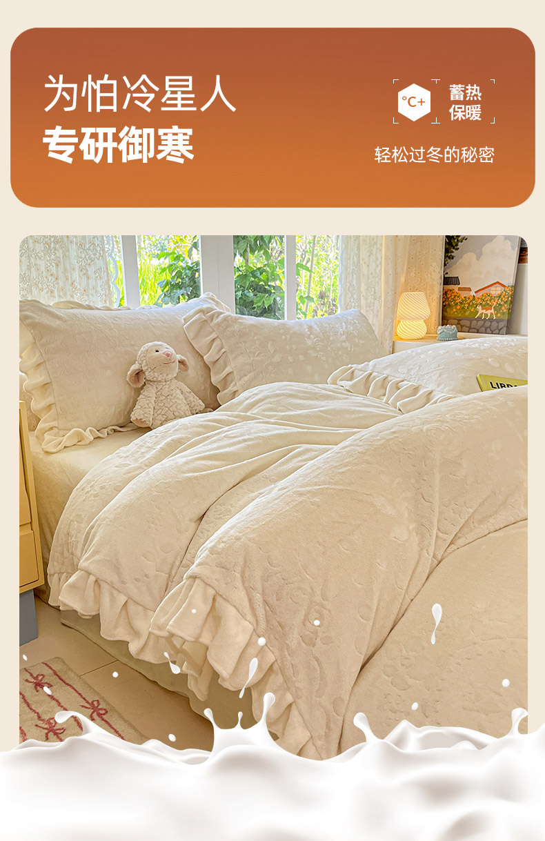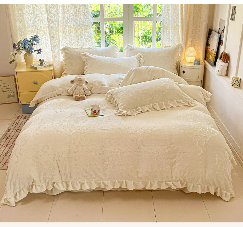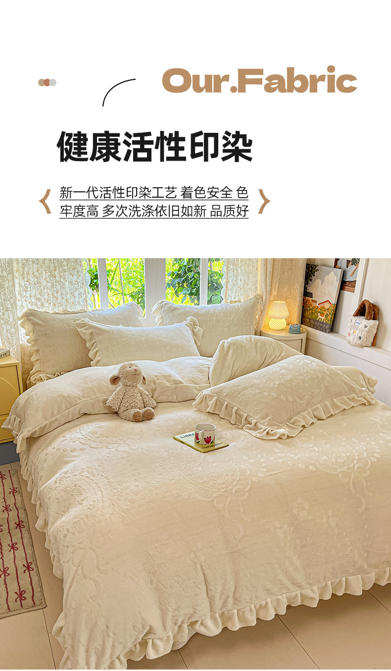 当前位置: 91家纺网 > 商品网购 > 床品套件 > 四件套 > 牛奶绒四件套 > (总)金阳光家纺 2025新款A类花边款法式风立体雕花牛奶绒四件套-慕斯系列