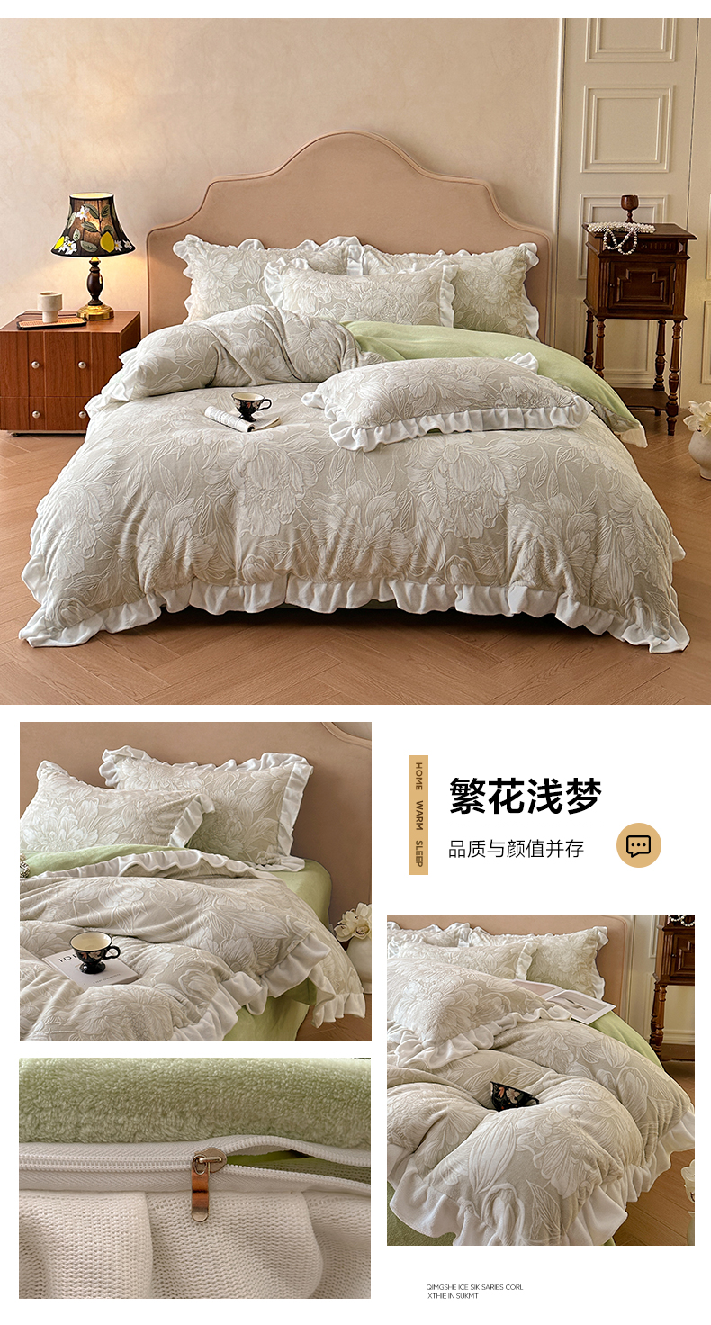 (总)澳梵家居 2025新款雕花牛奶绒韩版四件套-竹影柔柔,竹影柔柔,灰绿蝴蝶结,灰绿樱桃,卡其叶影,绿色叶影,漫调花语-粉,漫调花语-绿,玫瑰蝶语-蓝,玫瑰蝶语-绿,奶芙蝴蝶结,糖霜玫瑰-卡其