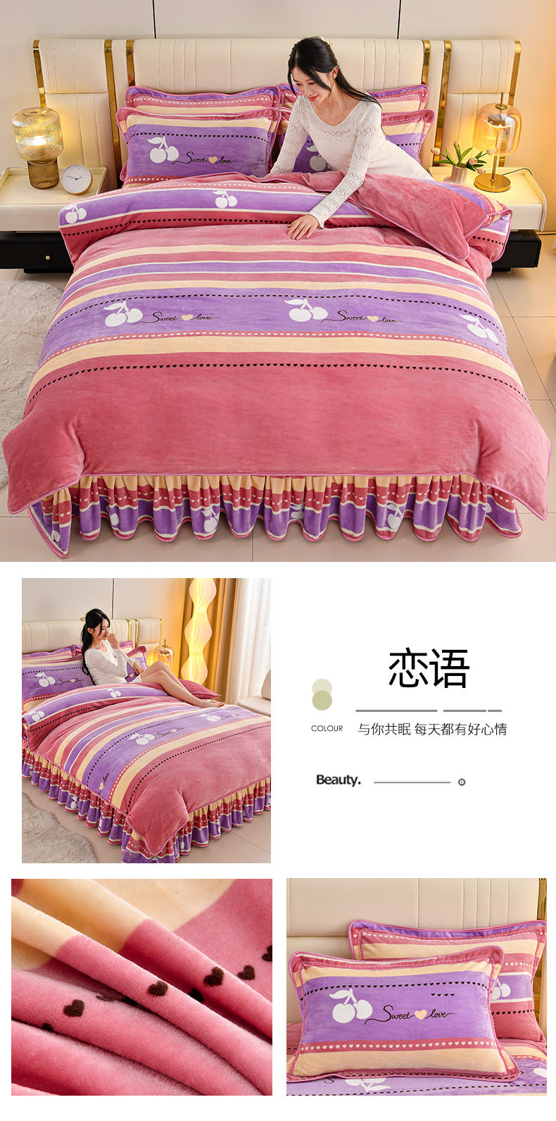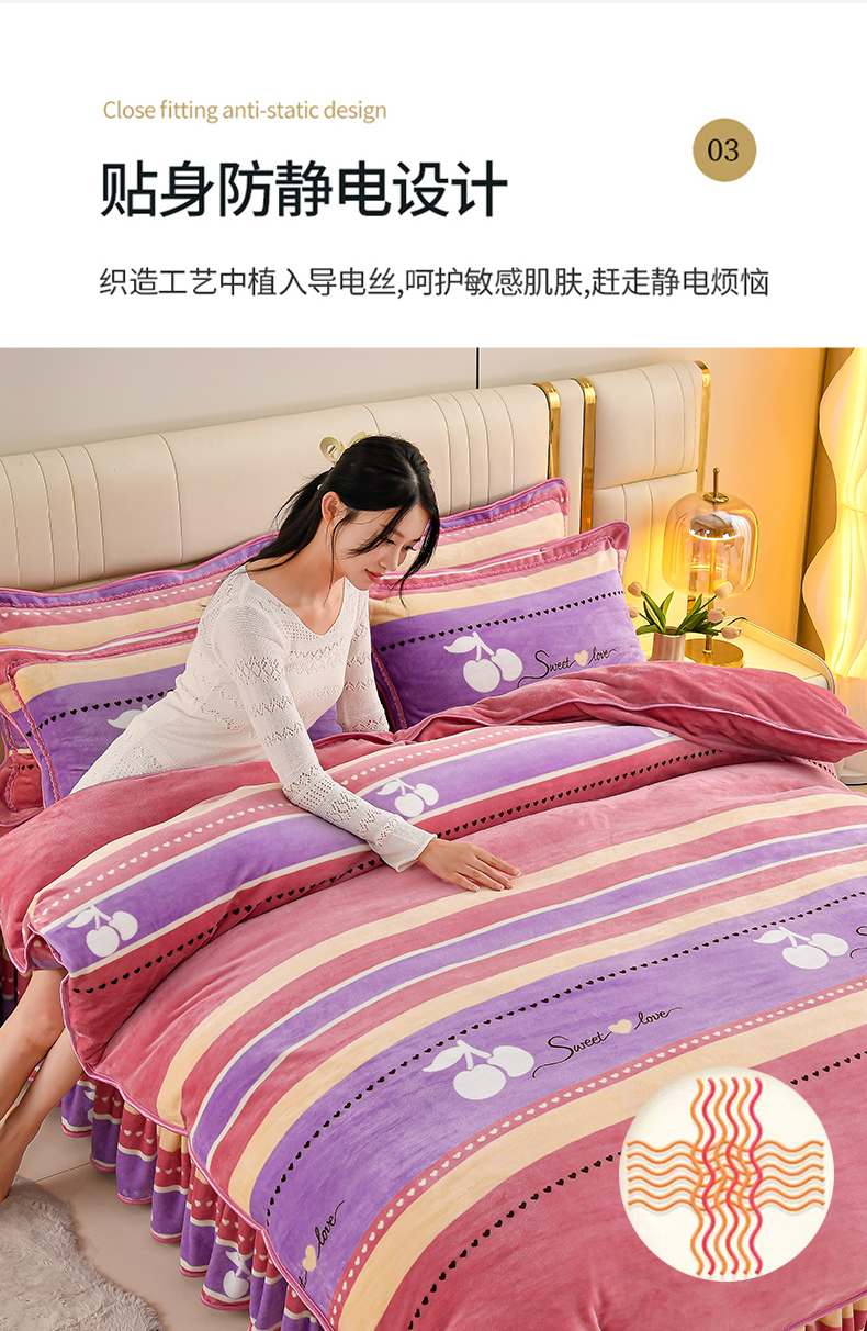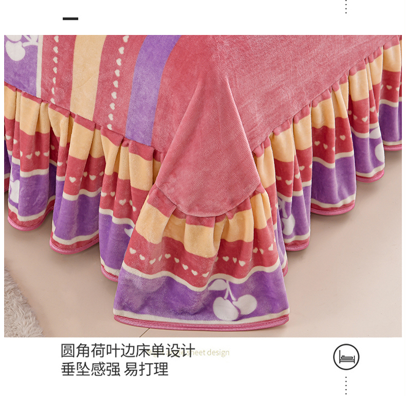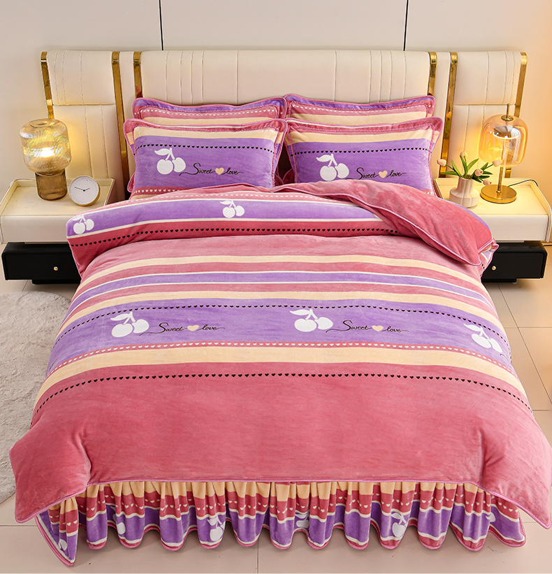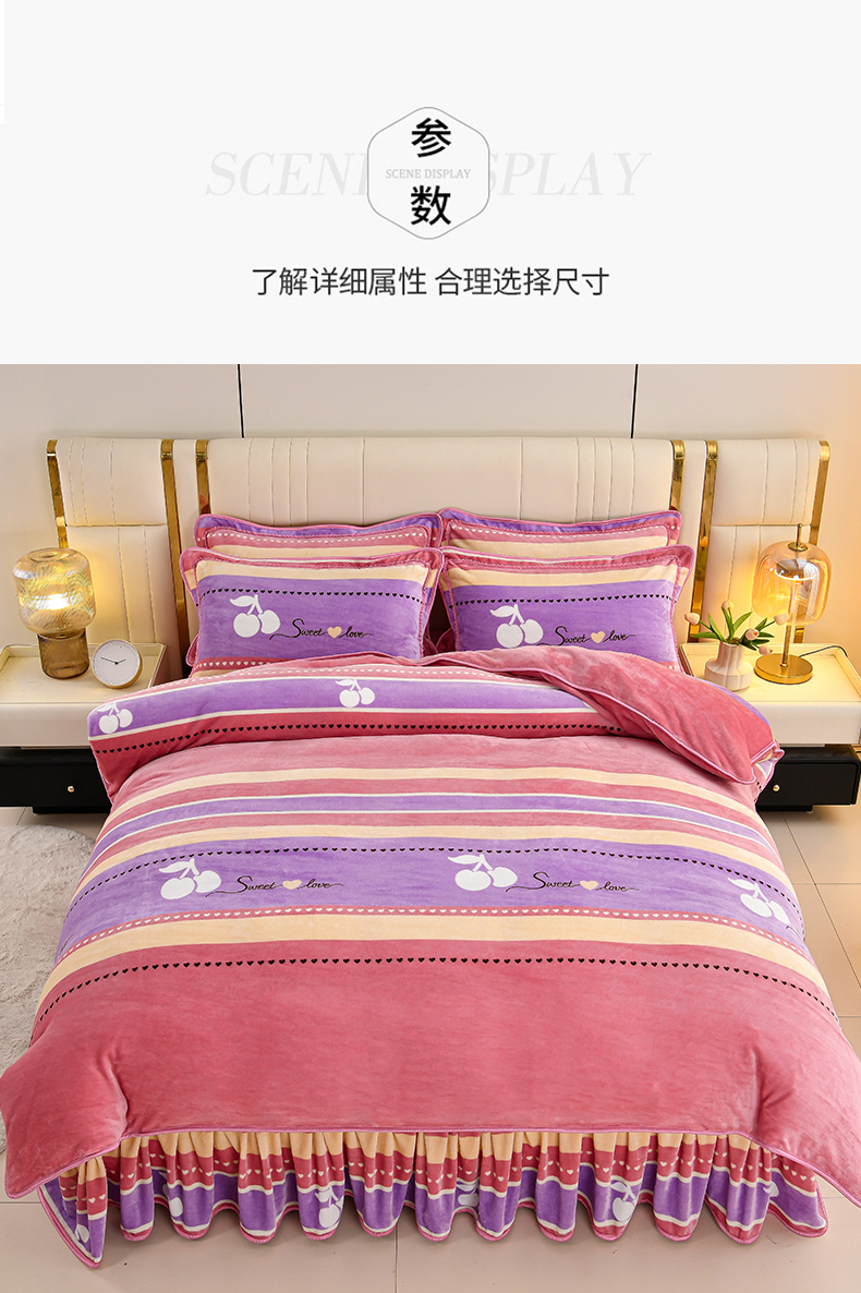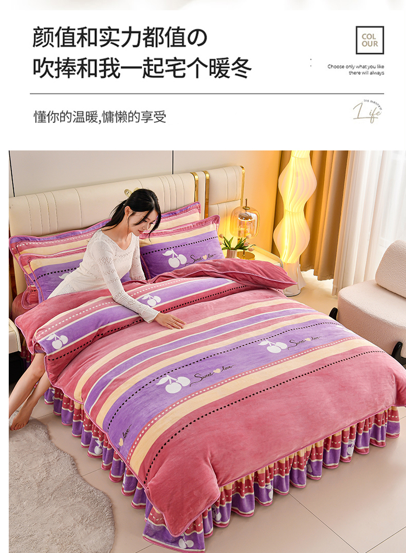商品名称:绒品荟家纺 2025新款8.5斤加厚牛奶绒金貂绒法莱绒四件套三件套冬季法兰绒床裙款高克重恋语