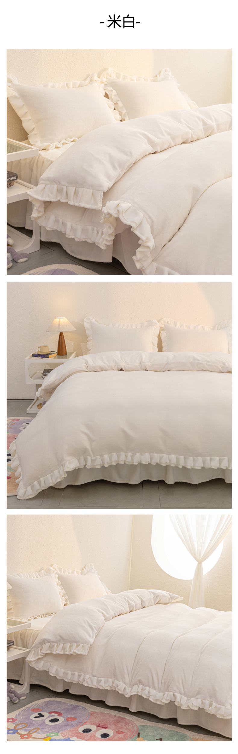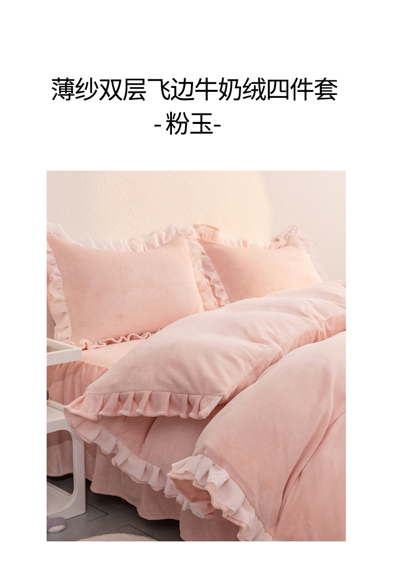 当前位置: 91家纺网 > 商品网购 > 床品套件 > 四件套 > 牛奶绒四件套 > 恩和家纺 2025新款白色薄纱双层飞边牛奶绒四件套 粉玉