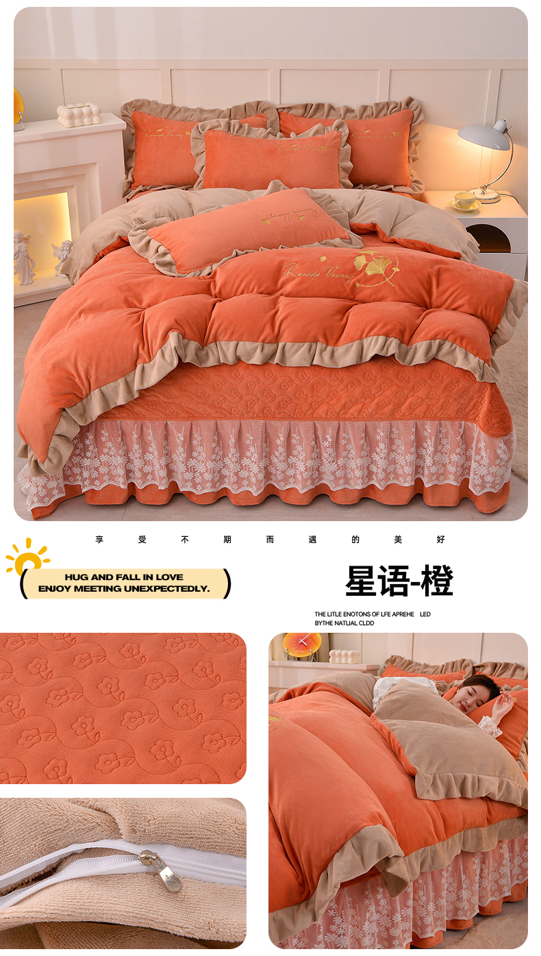 商品名称:湘雪家居 2025新款高克重纯色刺绣牛奶绒床盖款星语系列四件套-提供买家秀 星语款-橙橘色