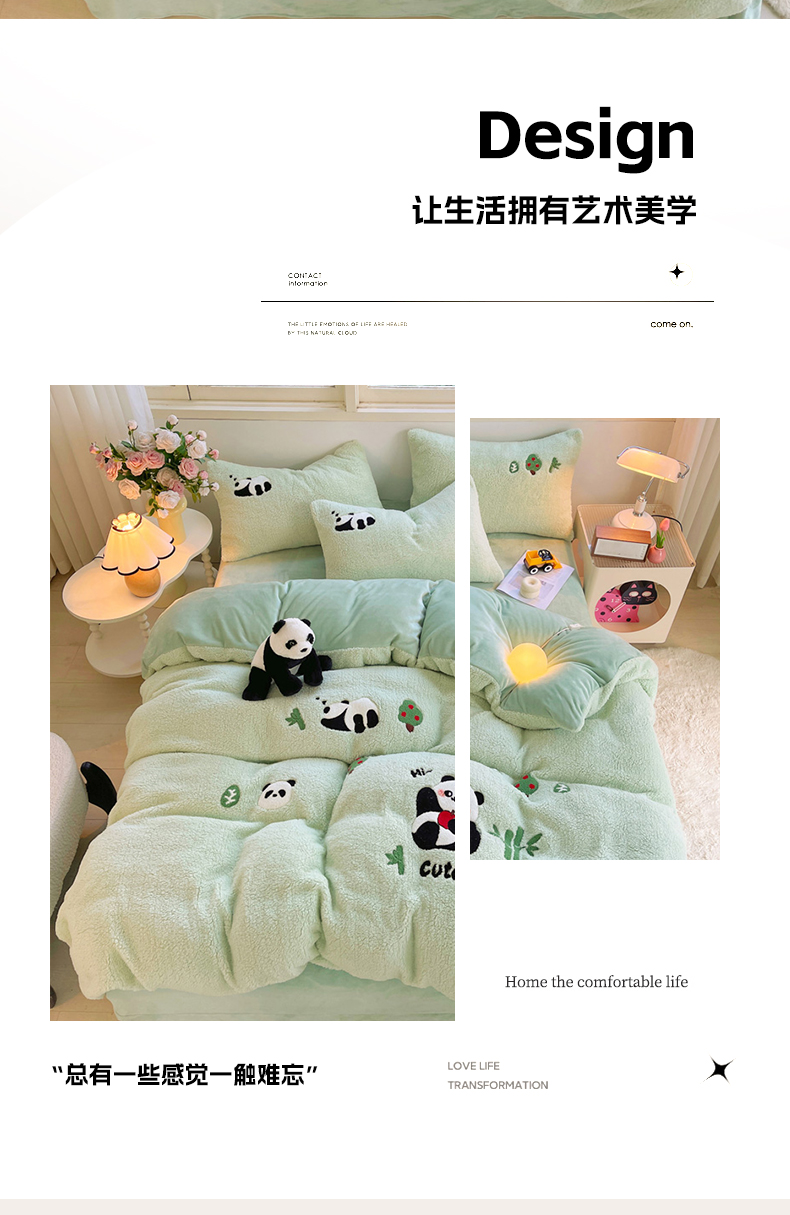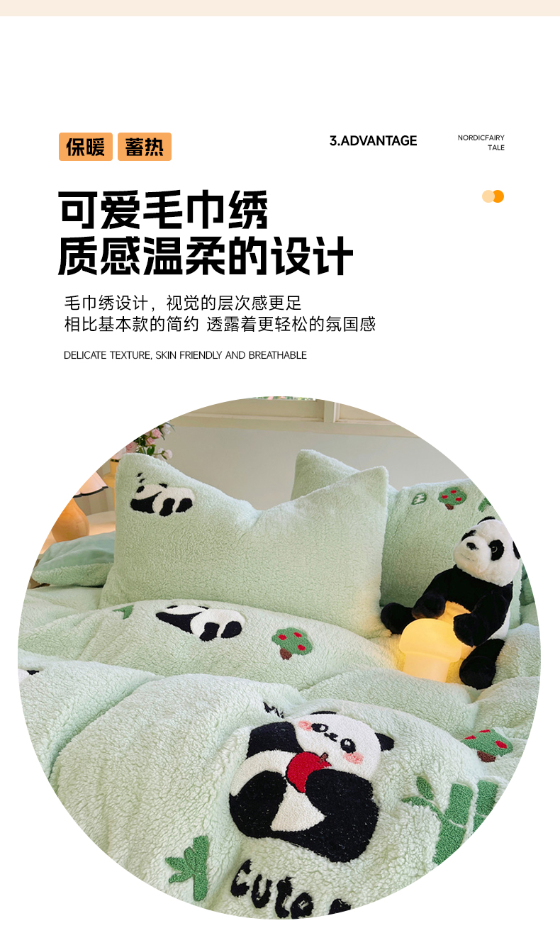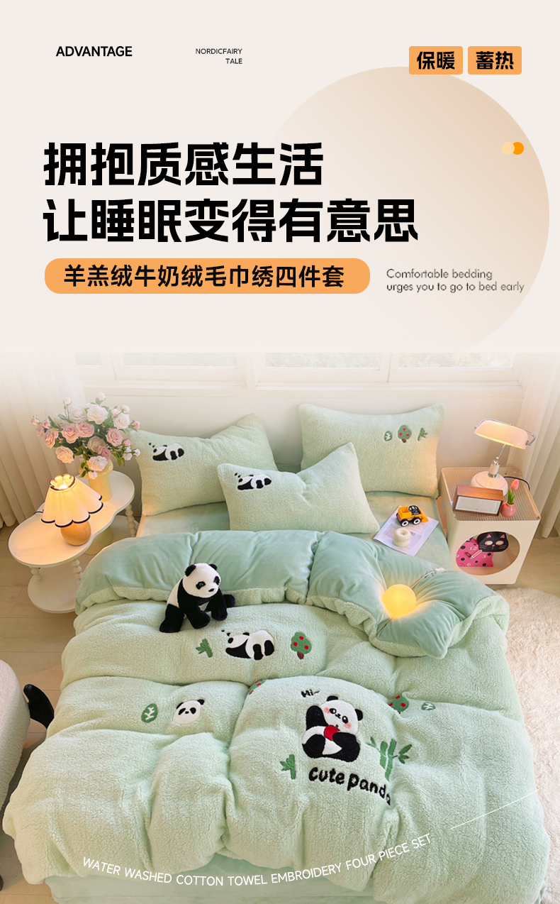 商品名称:牵依 2025新款羊羔绒牛奶绒毛巾绣四件套 熊猫乐园