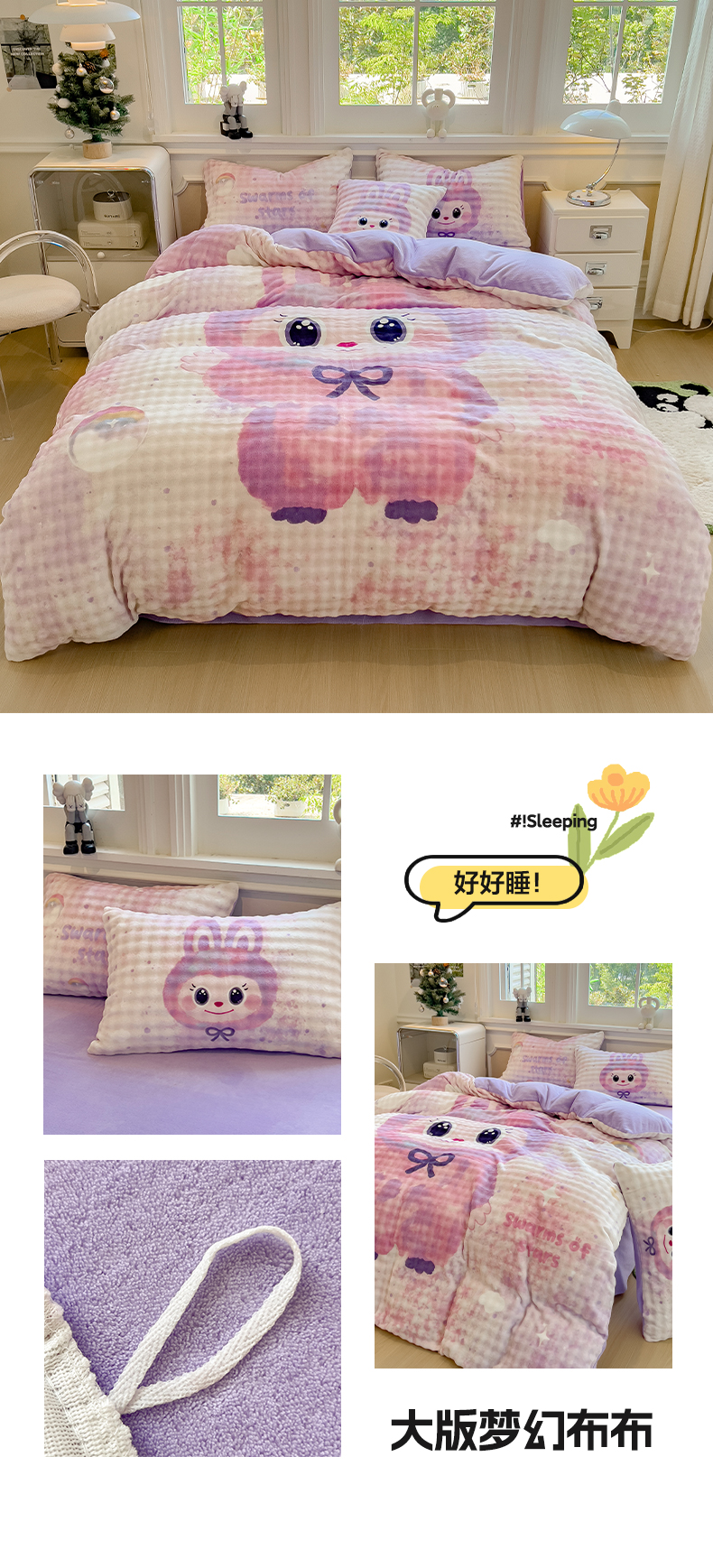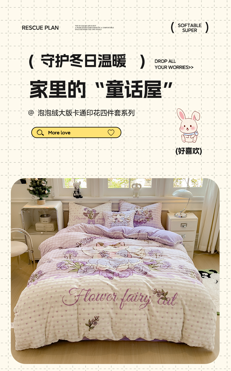 (总)摩妮卡 2025新款小清新加厚260克牛奶绒泡泡绒四件套,甜系兔兔,幽香恋曲,软萌萌小兔,洛丽兔,紫韵美乐蒂,萌兔时光,凯蒂小熊,软萌小猫,暮雅,快乐每一天,花园狗,奶蓝玉桂狗,小兔甜甜酱