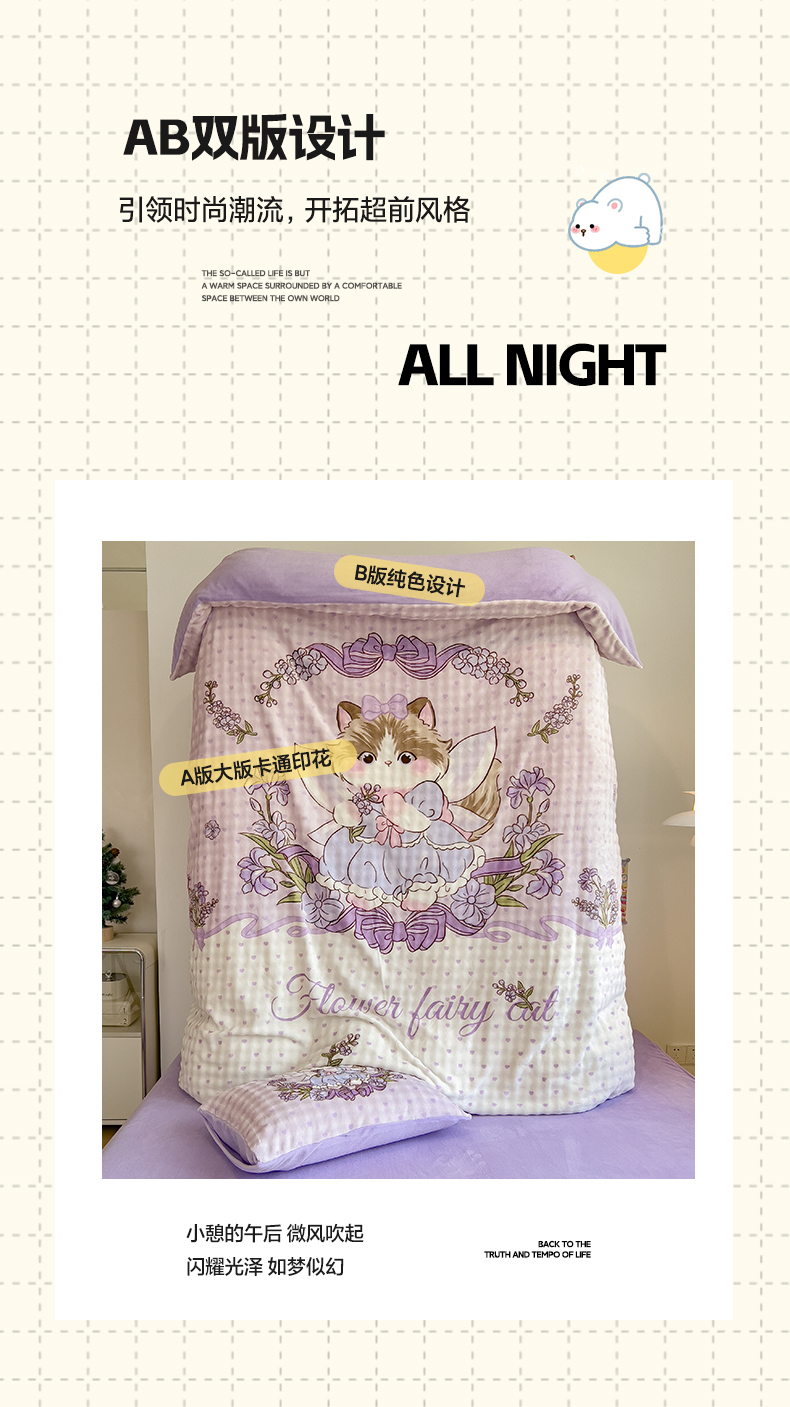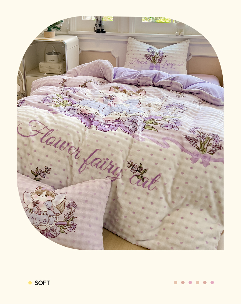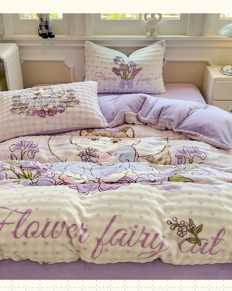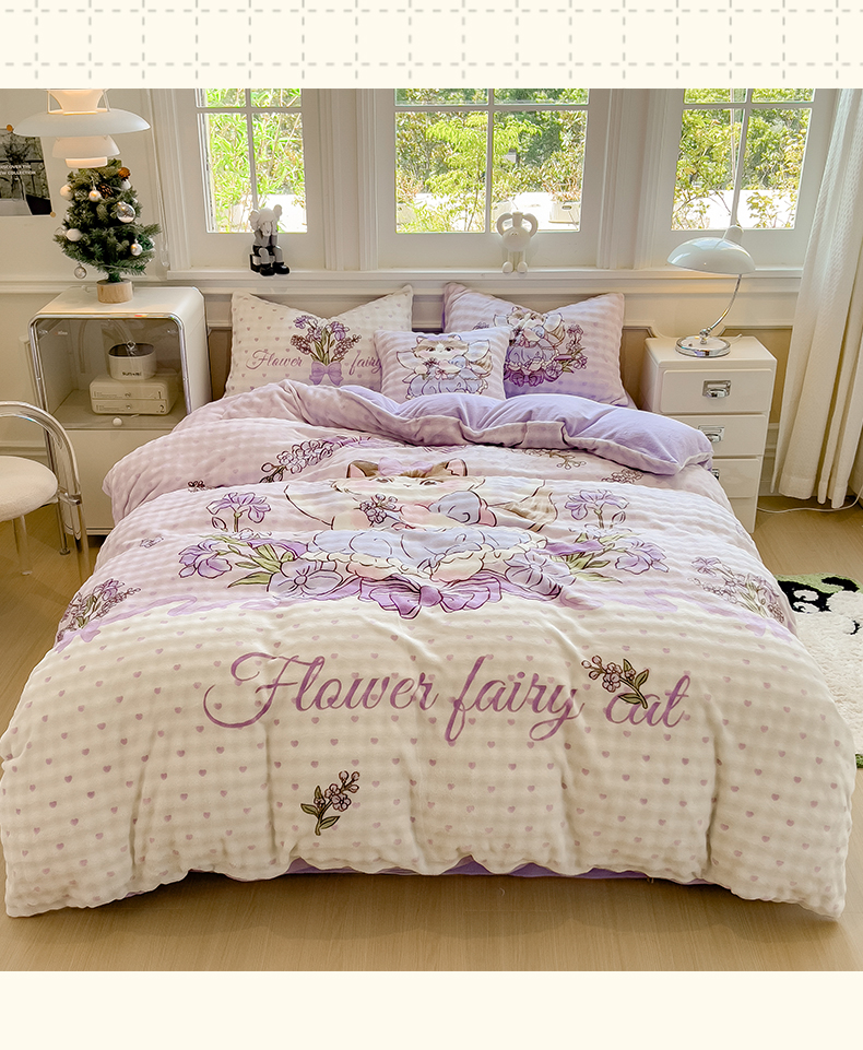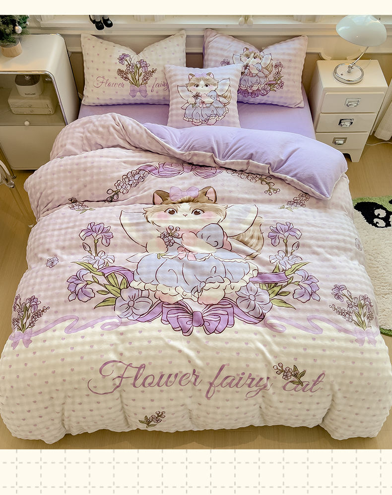摩妮卡 2025新款亲肤舒适泡泡绒大版卡通印花五件套 大版猫咪公主