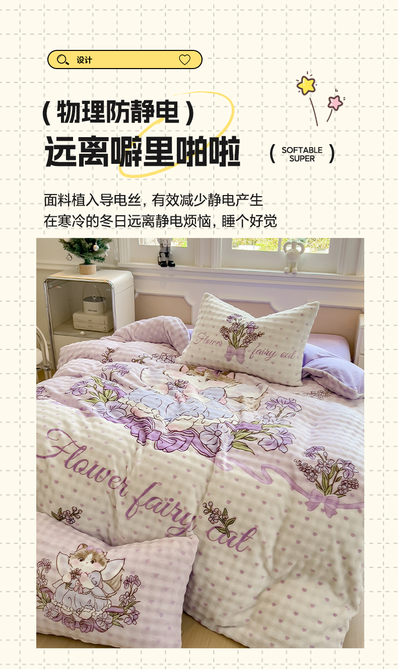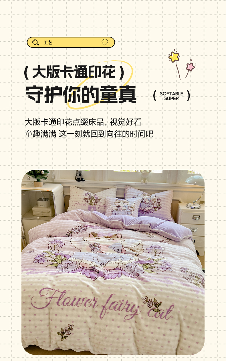 商品名称:摩妮卡 2025新款亲肤舒适泡泡绒大版卡通印花五件套 大版猫咪公主