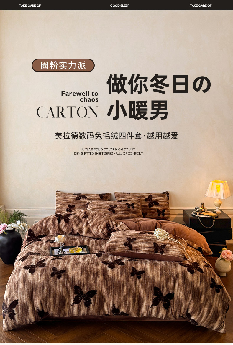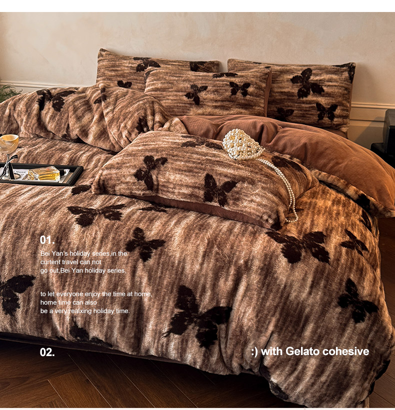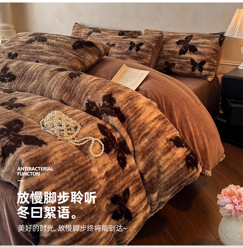 商品名称:吾诺家居2025新款美拉德260克兔毛四件套数码四件套牛奶绒四件套 焦糖蝶舞