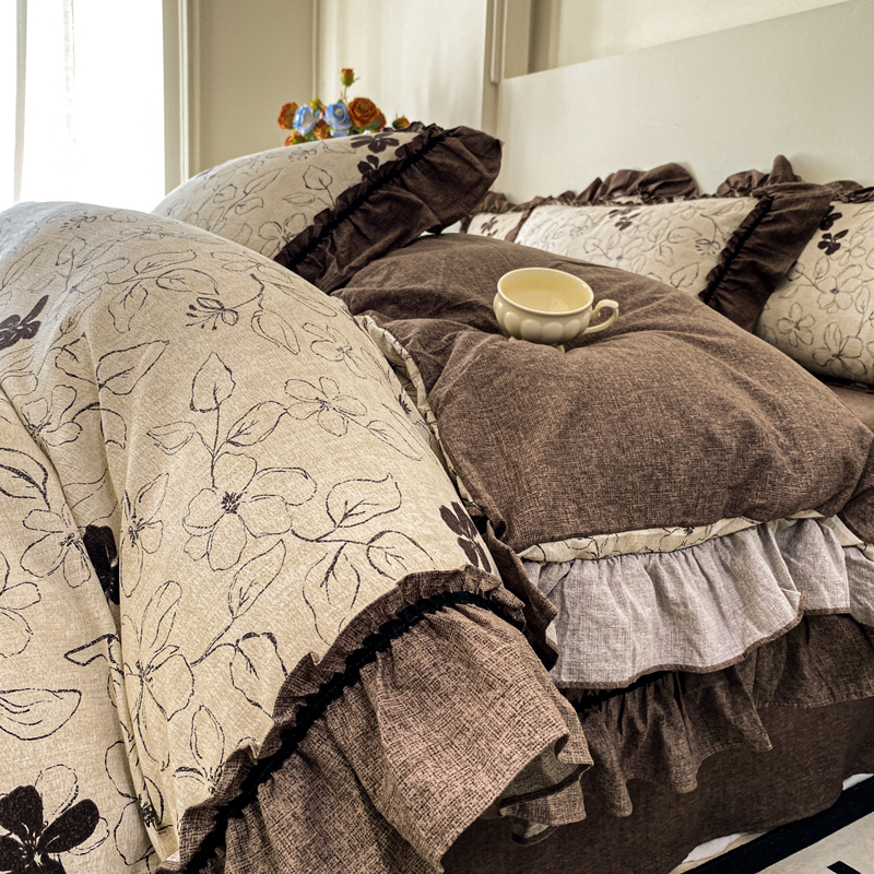梦纤绒 2025新款复古风亚麻原麻花边四件套 棕篱