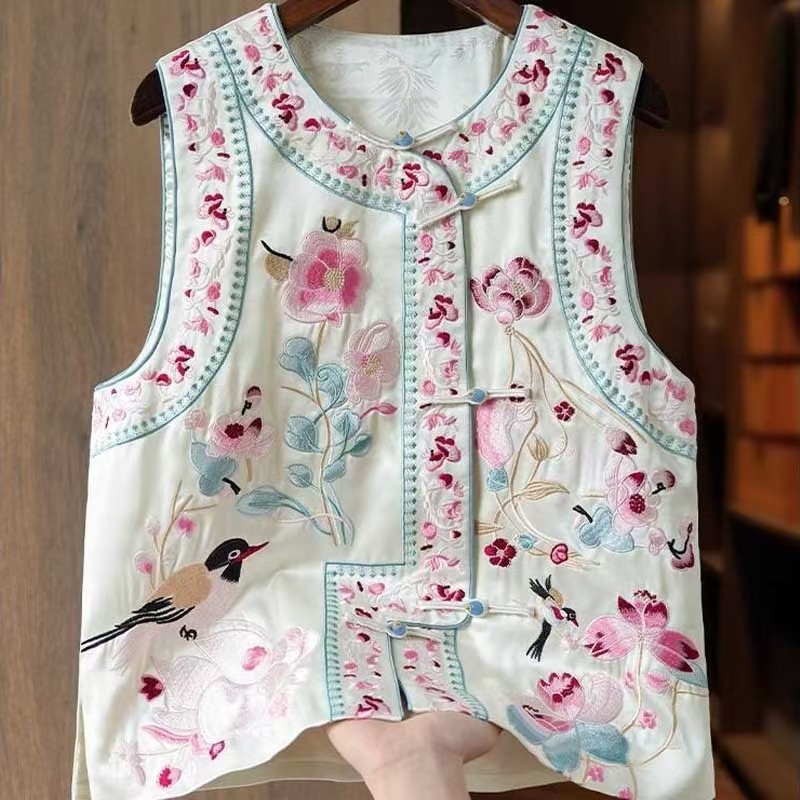 洛兰沙家居馆【只代发】【只代发】 2025新款复古织锦缎细纱棉麻拼接马甲背心刺绣中式盘扣上衣 52