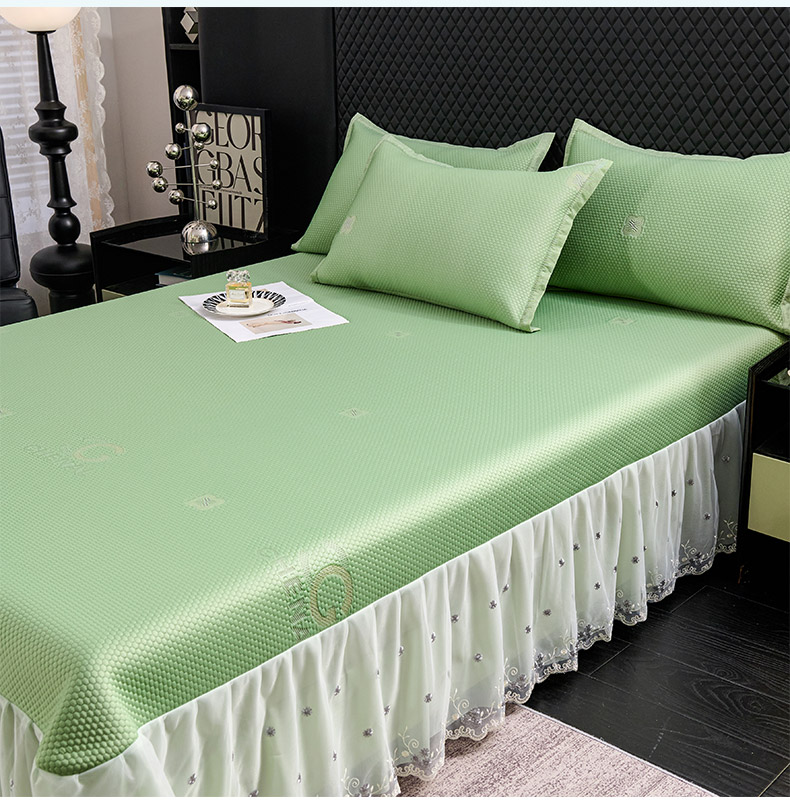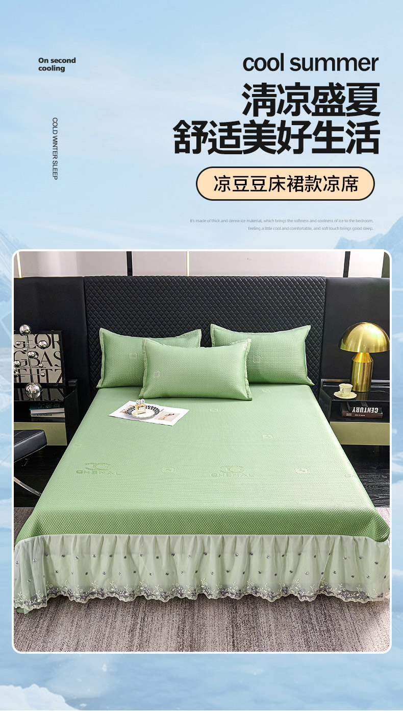商品名称:梵克保罗 2025新款凉感因子母婴级凉感丝豆豆席床裙款 床裙樱桃-水绿