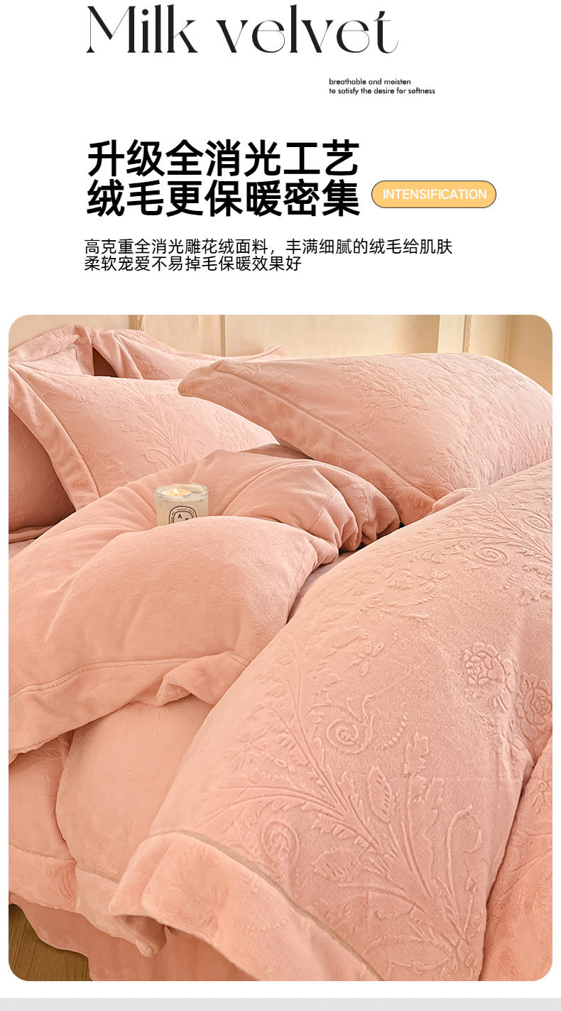 (总)孟鑫家纺 2025新款加厚全消光雕花牛奶绒床盖四件套-维纳斯系列,豆沙,奶昔白,香芋紫,樱花粉