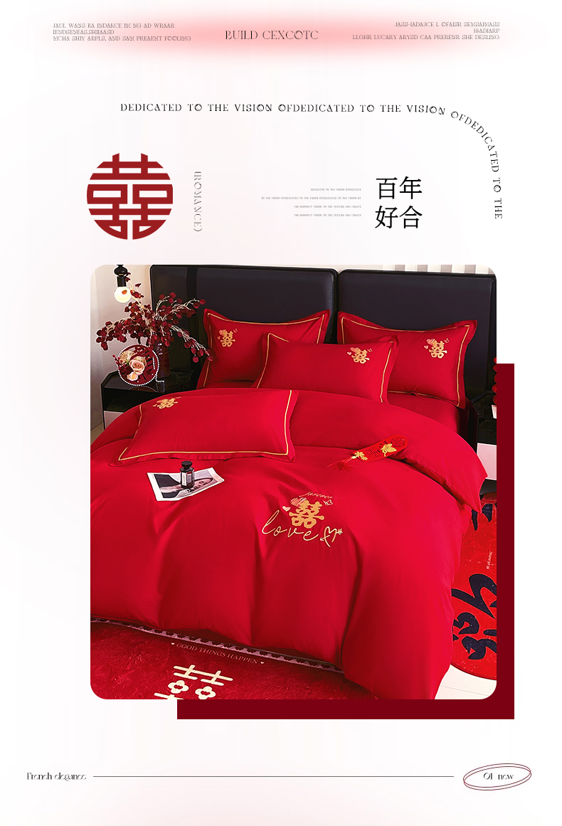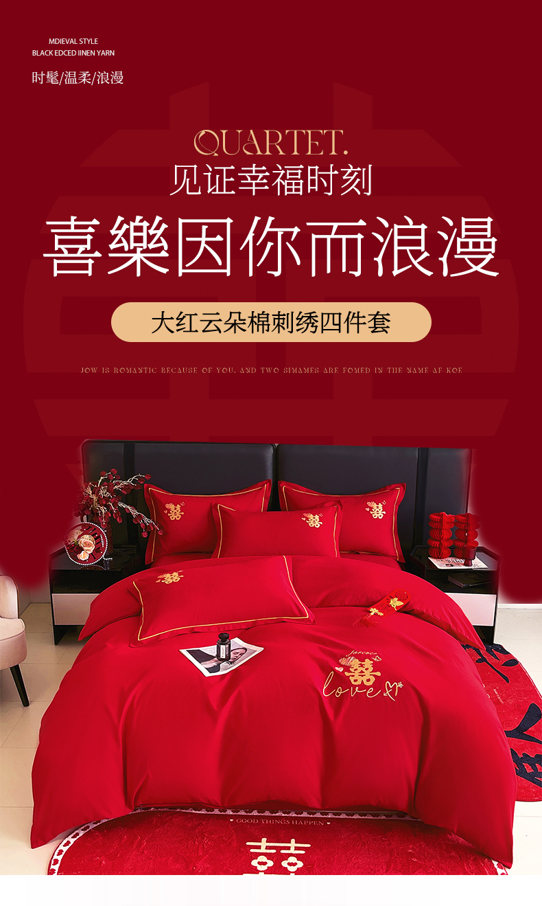当前位置: 91家纺网 > 商品网购 > 床品套件 > 四件套 > 婚庆四件套 > 艾橙家纺 2025新款大红云朵棉刺绣婚庆系列四件套 喜结良缘