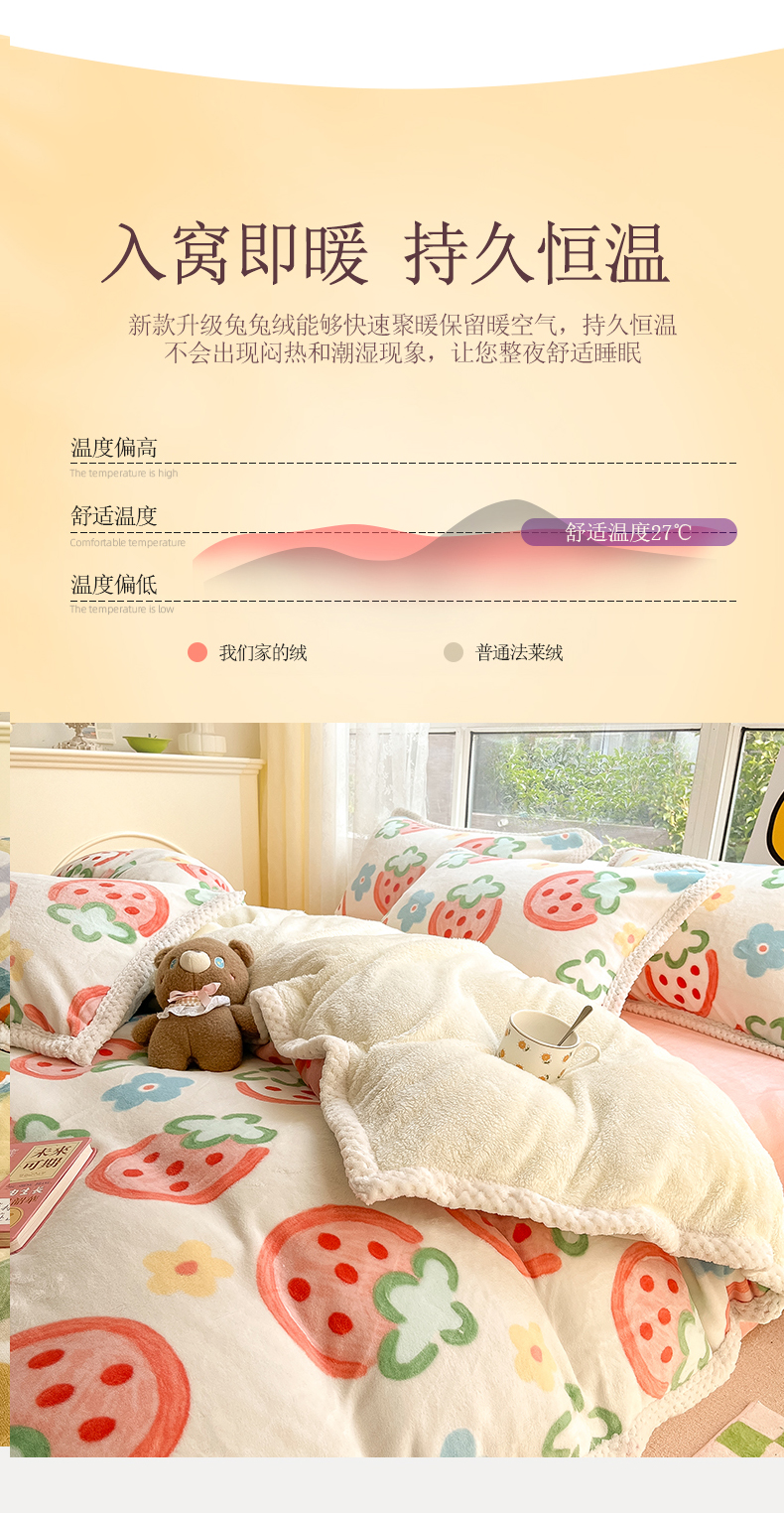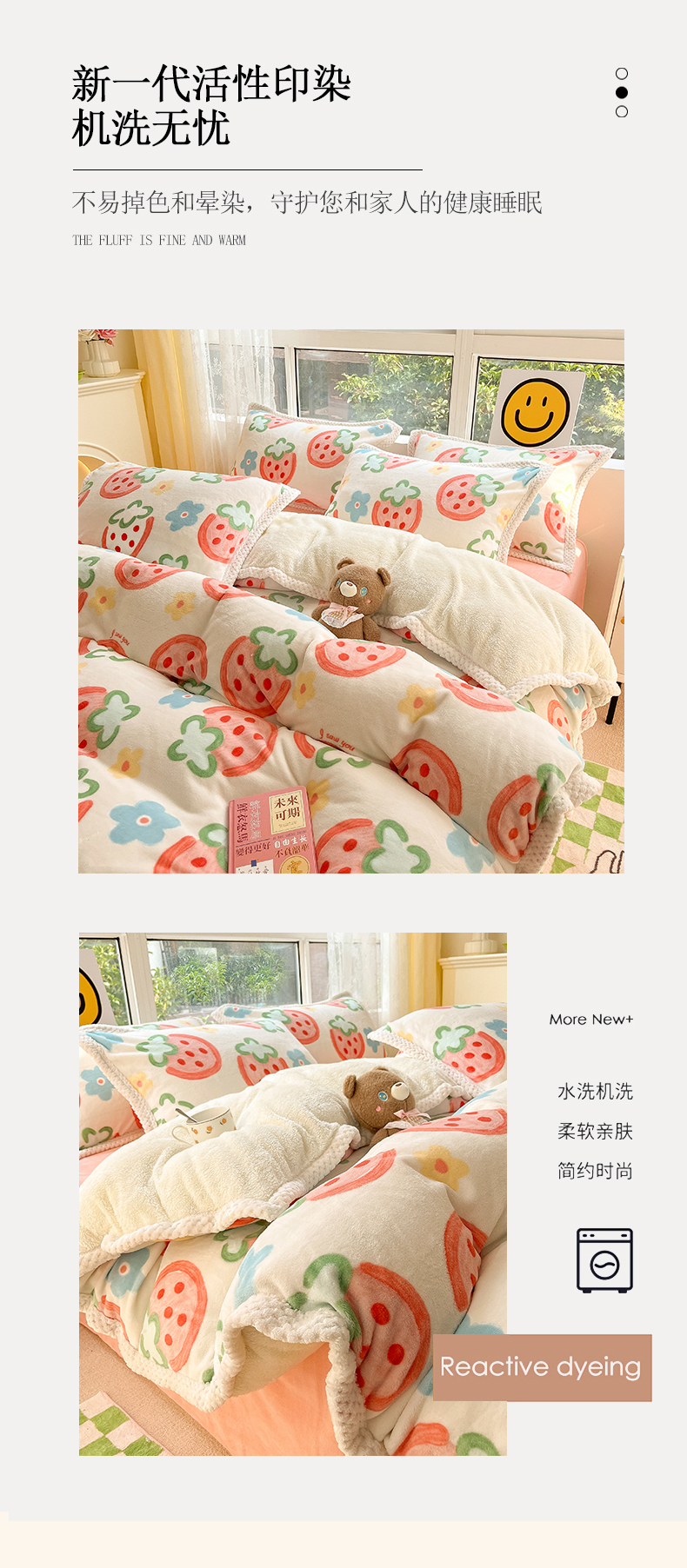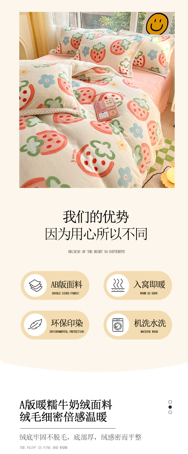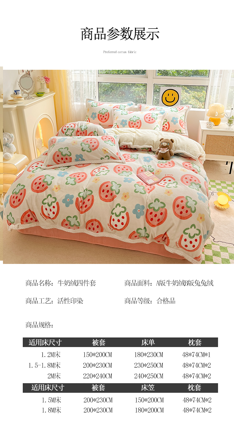 商品名称:琪格格纺织 2025新款A牛奶绒B兔兔绒保暖印花四件套 大包边绒海盐草莓