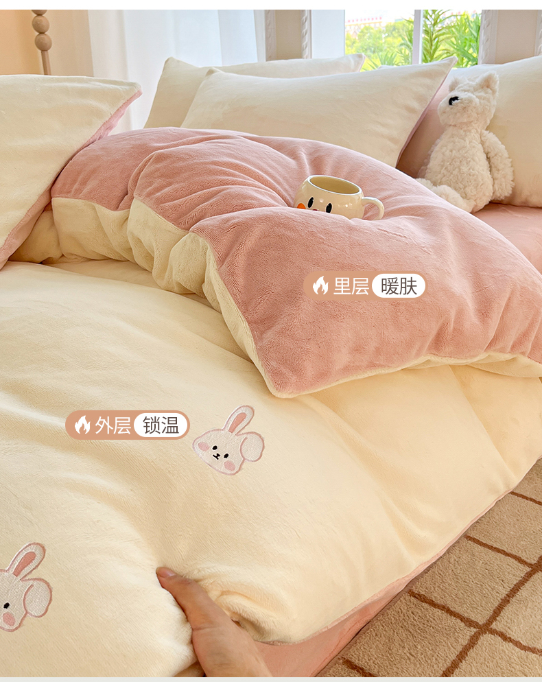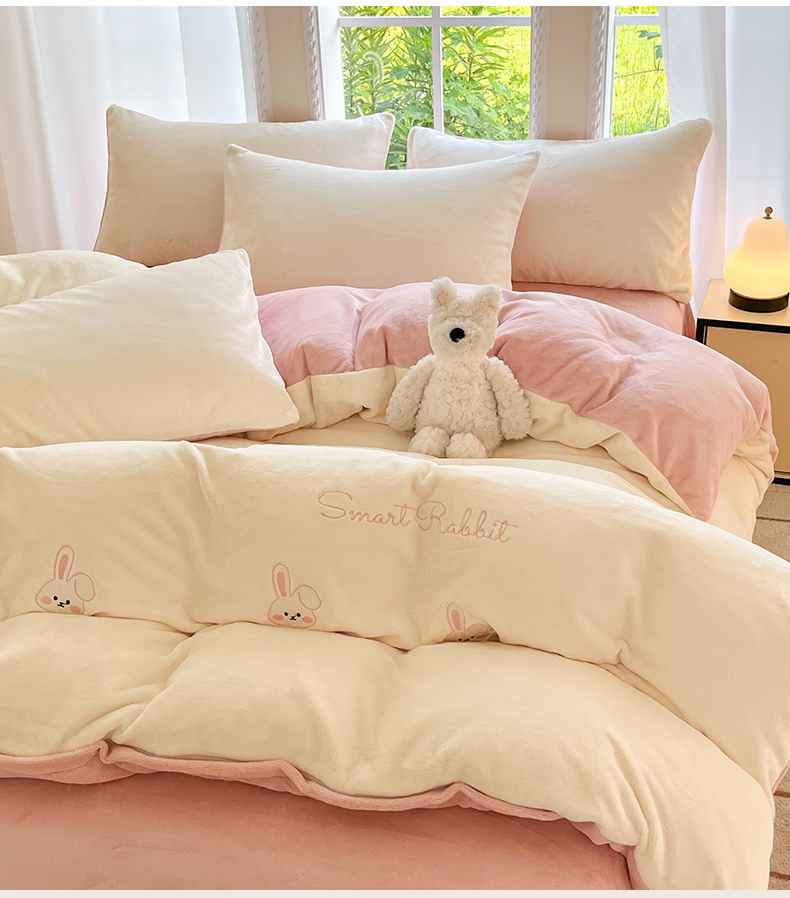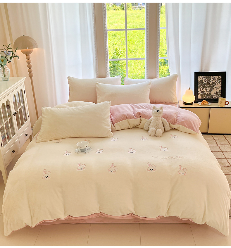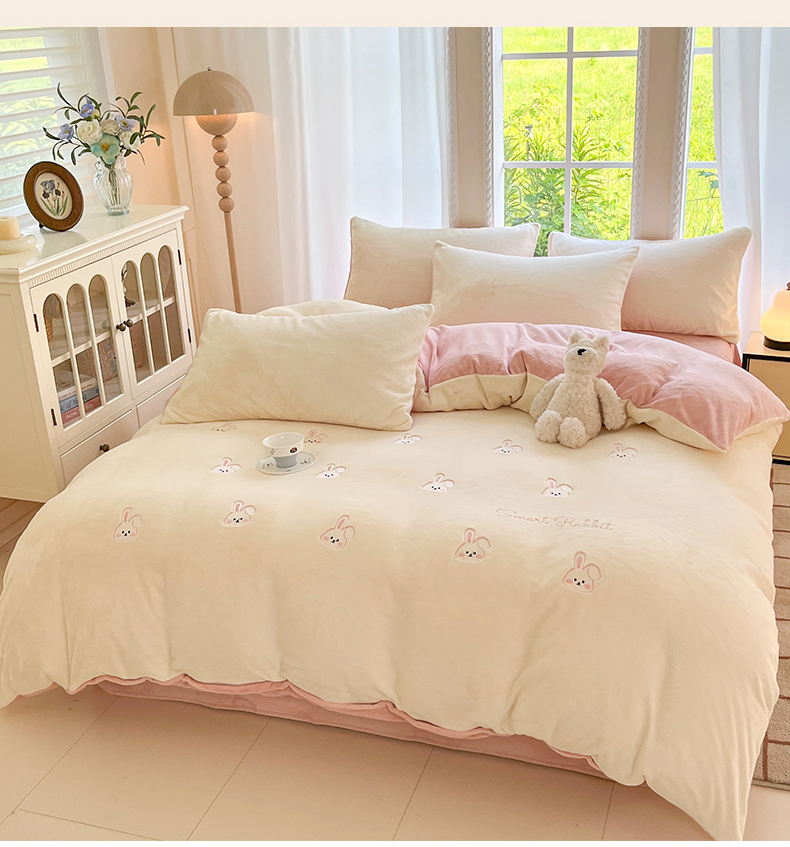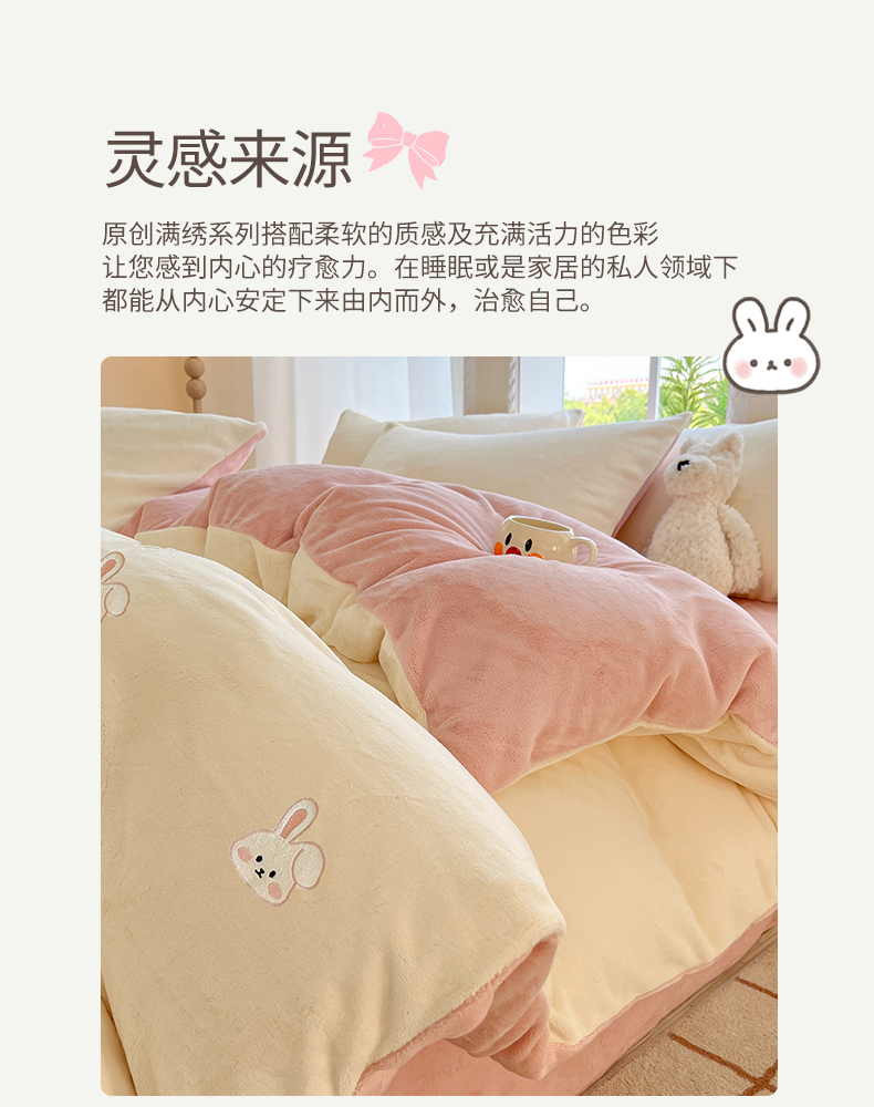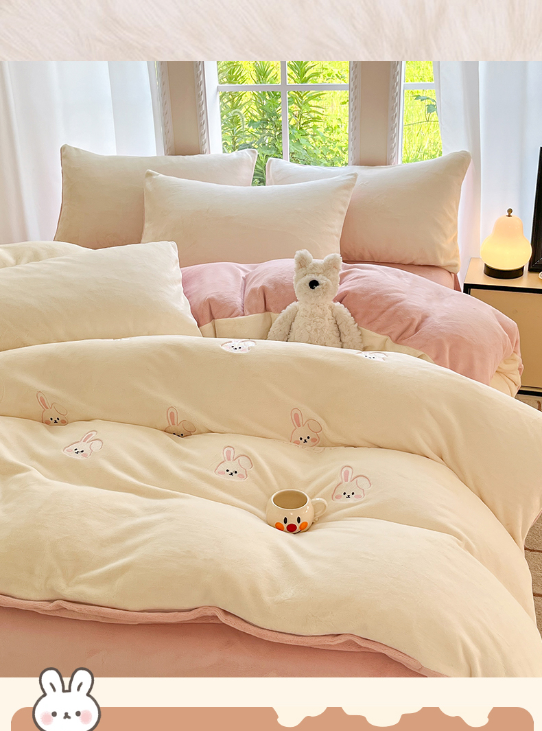云棉坊 2025新款高克重牛奶绒四件套-满绣系列 可爱兔-奶白粉