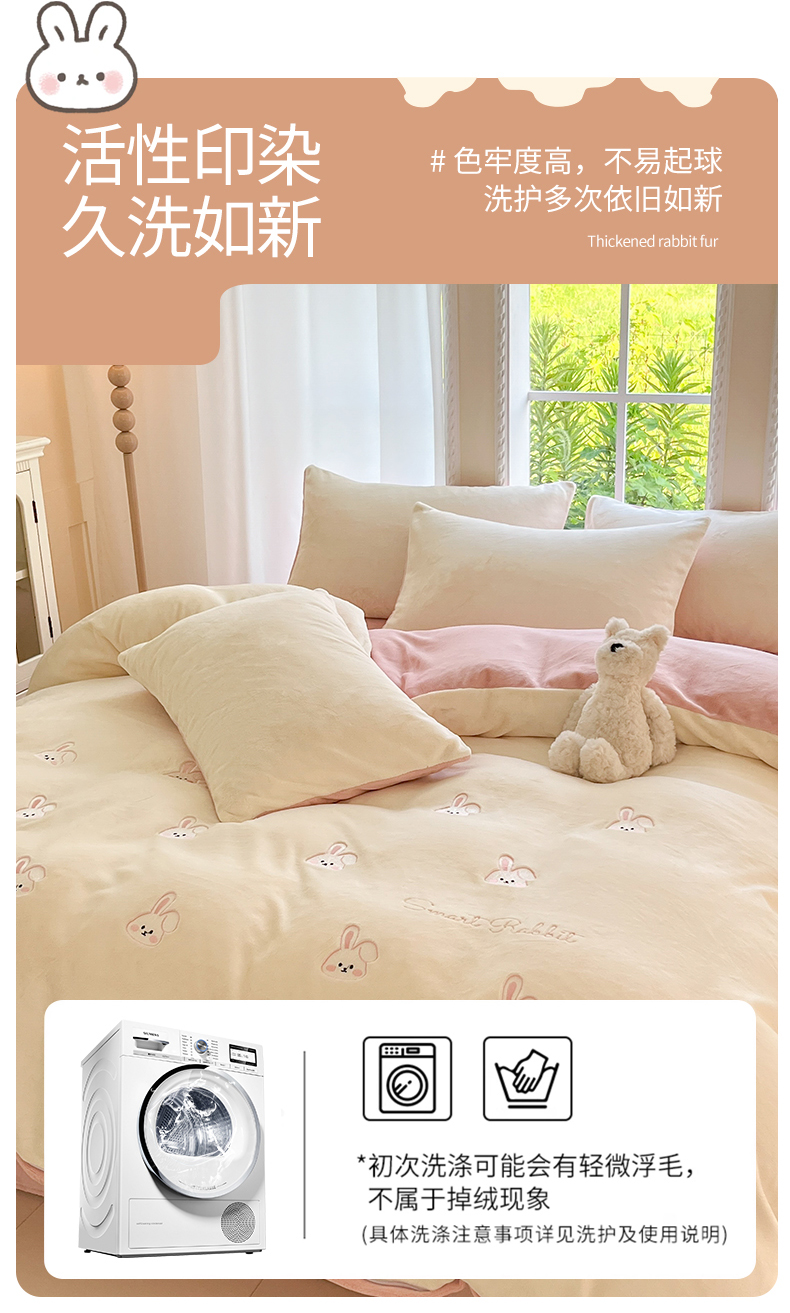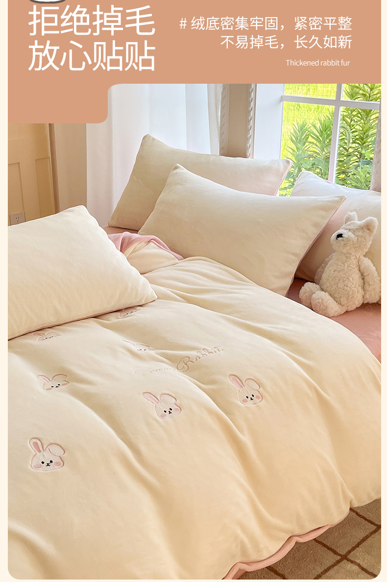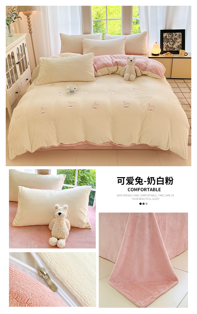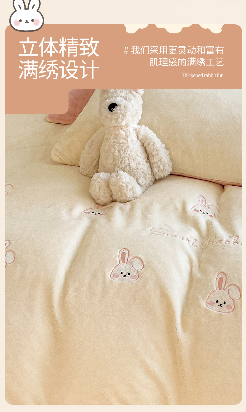 商品名称:云棉坊 2025新款高克重牛奶绒四件套-满绣系列 可爱兔-奶白粉