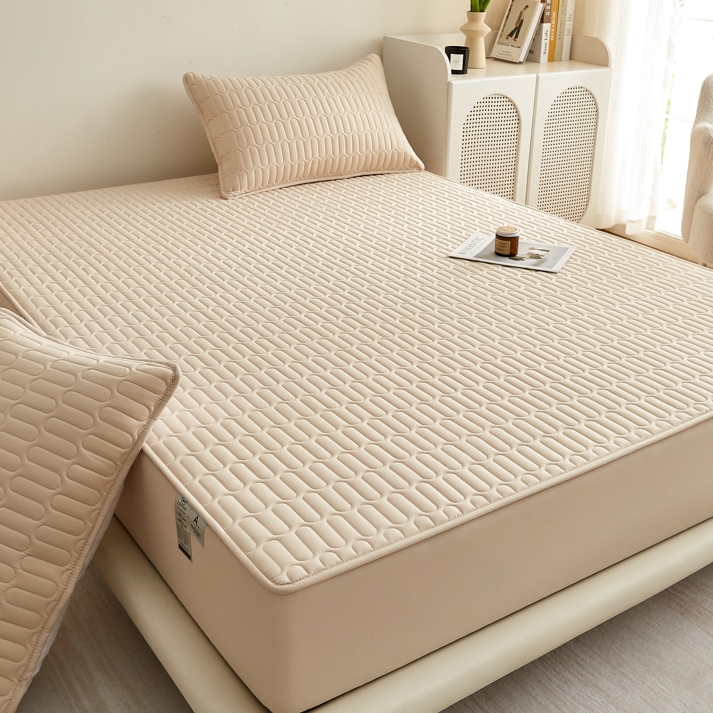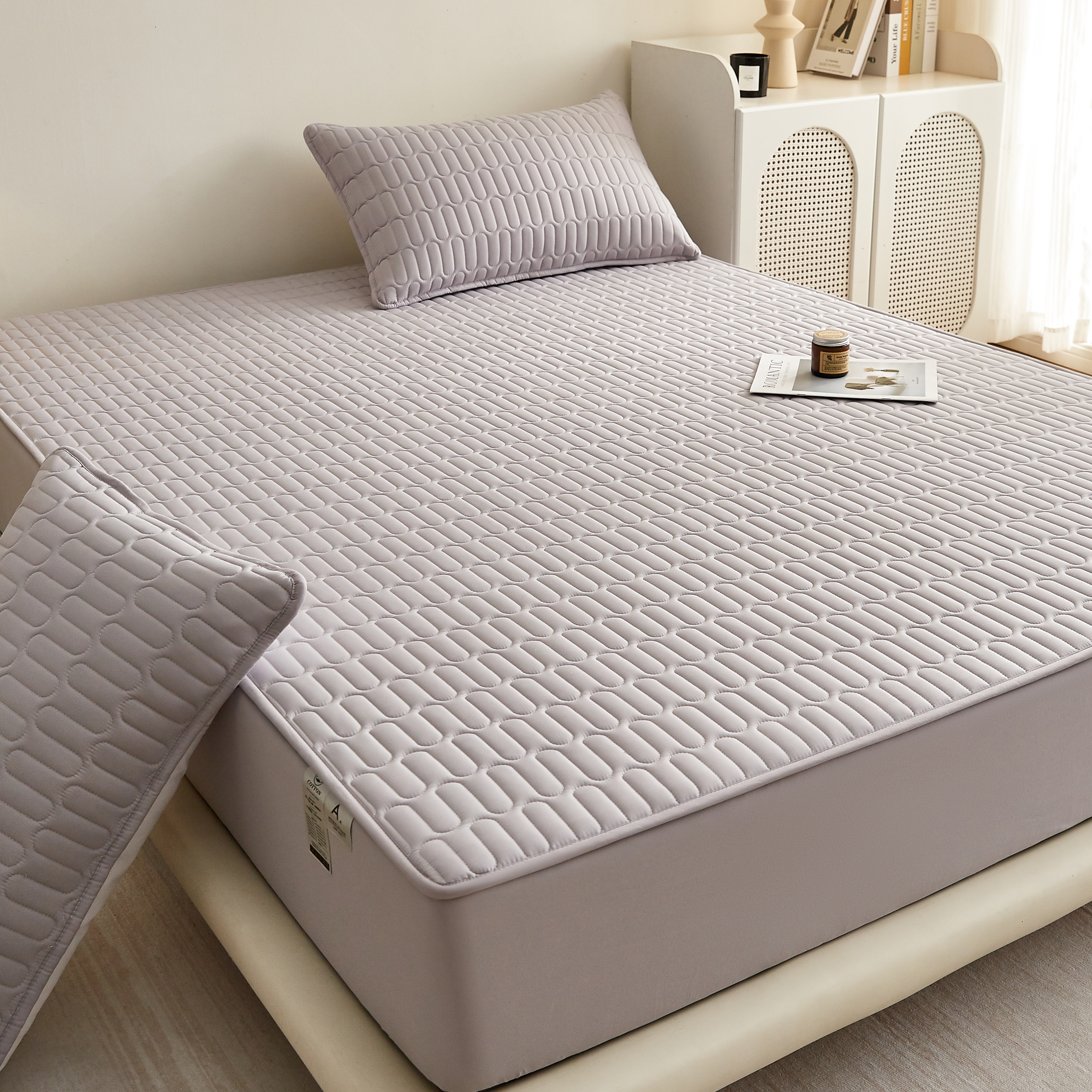 2023新款 印花A类水洗亲肤棉绗绣加厚夹棉防水床笠 优雅白,优雅白