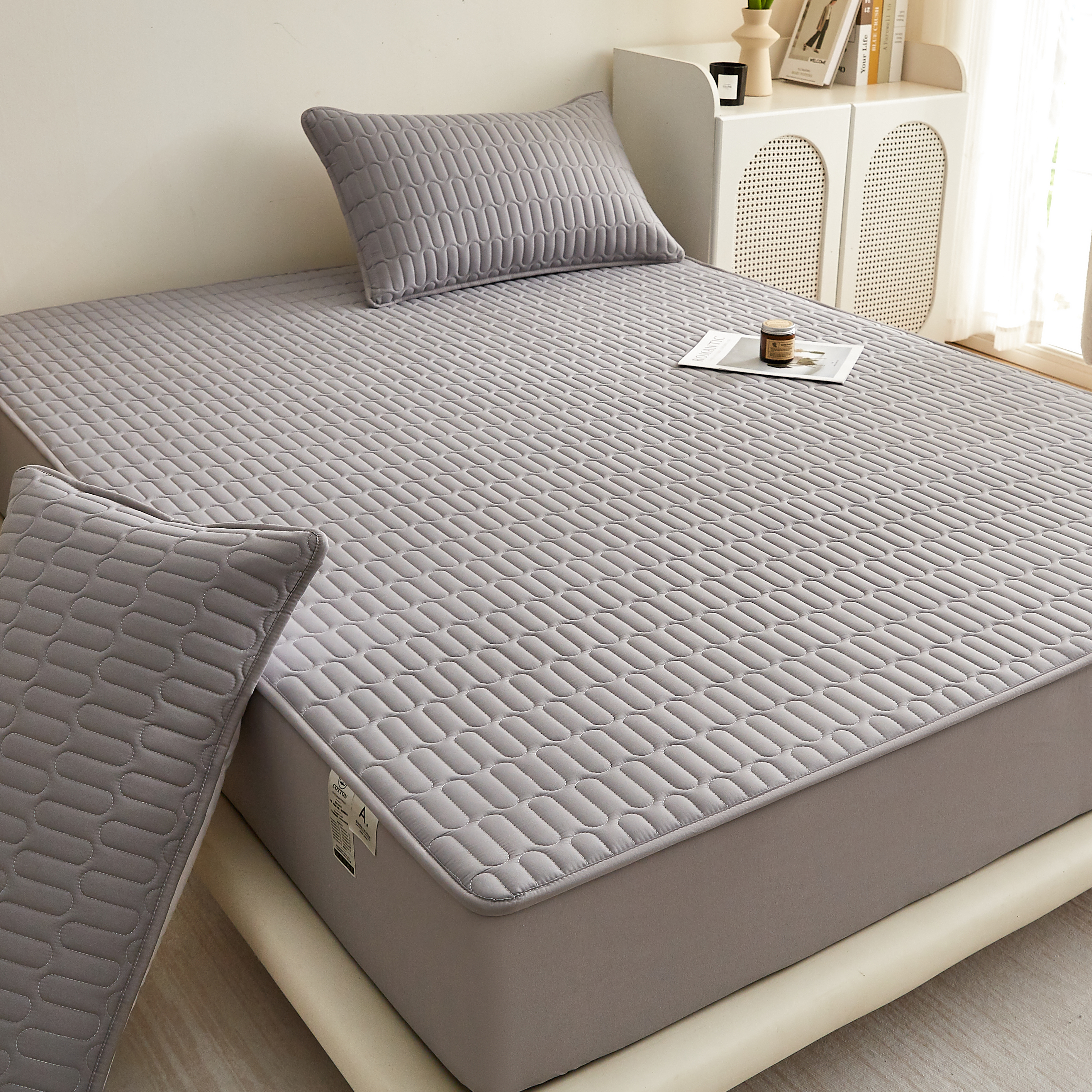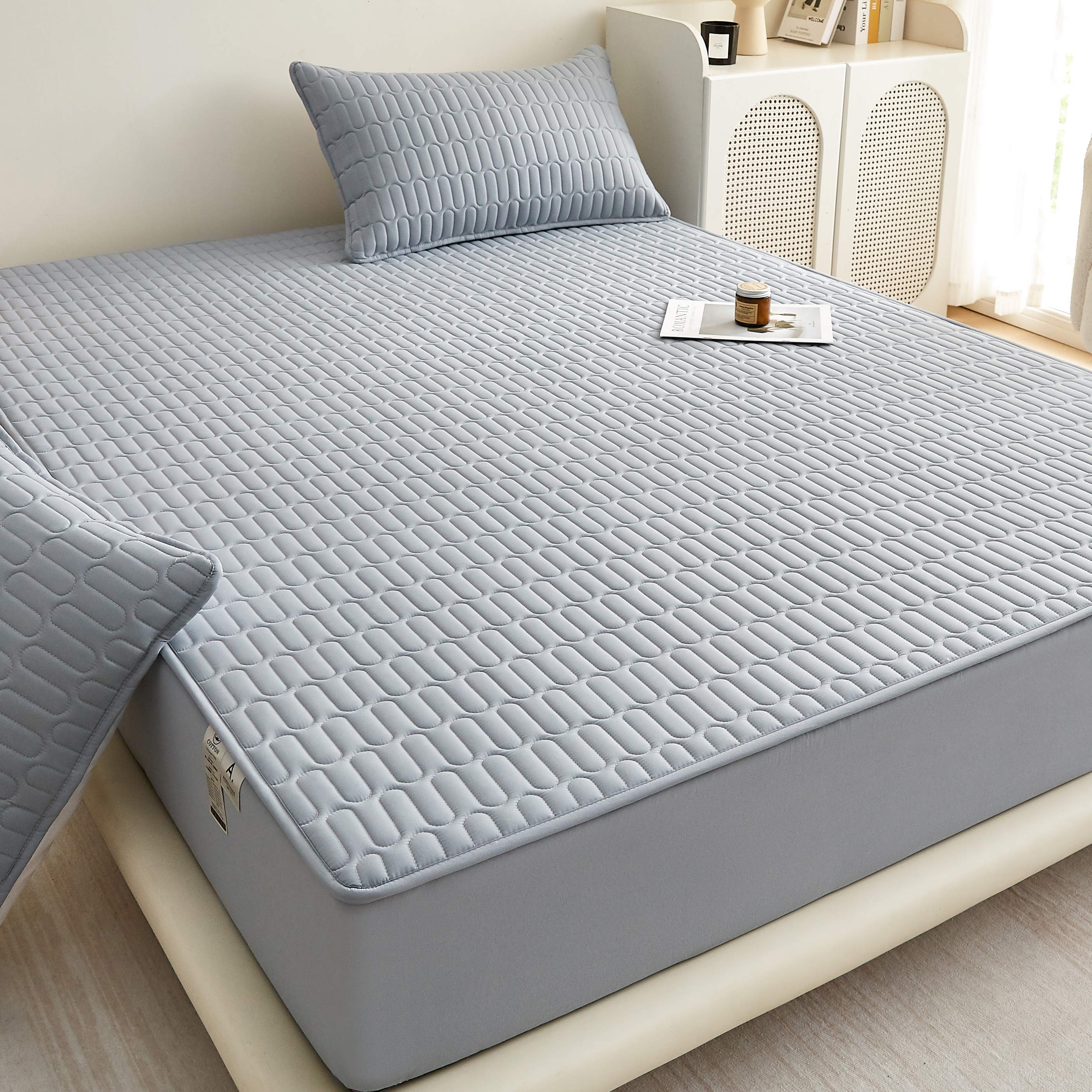2023新款 印花A类水洗亲肤棉绗绣加厚夹棉防水床笠 通银灰,通银灰