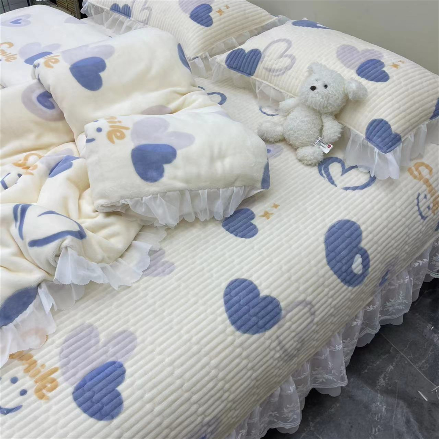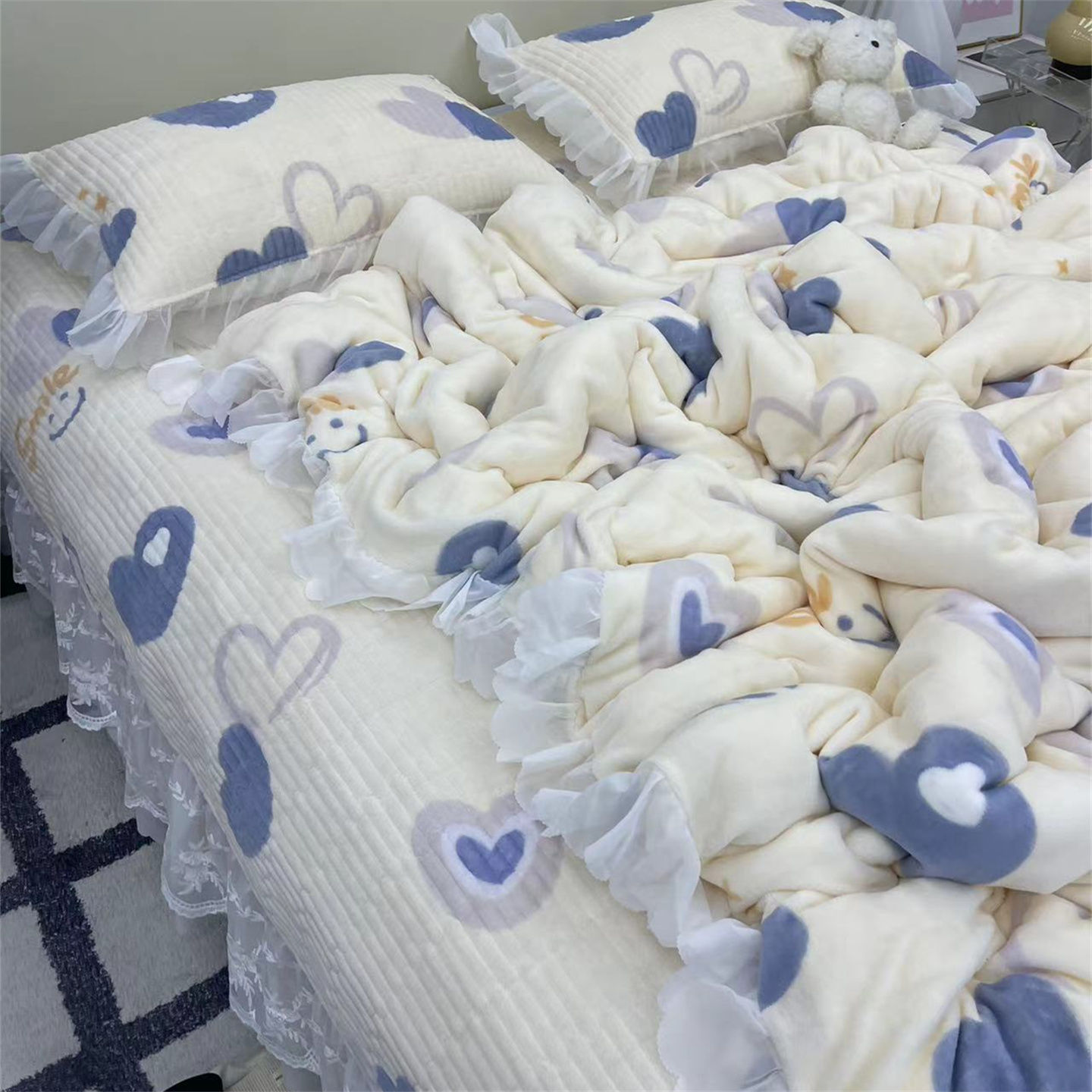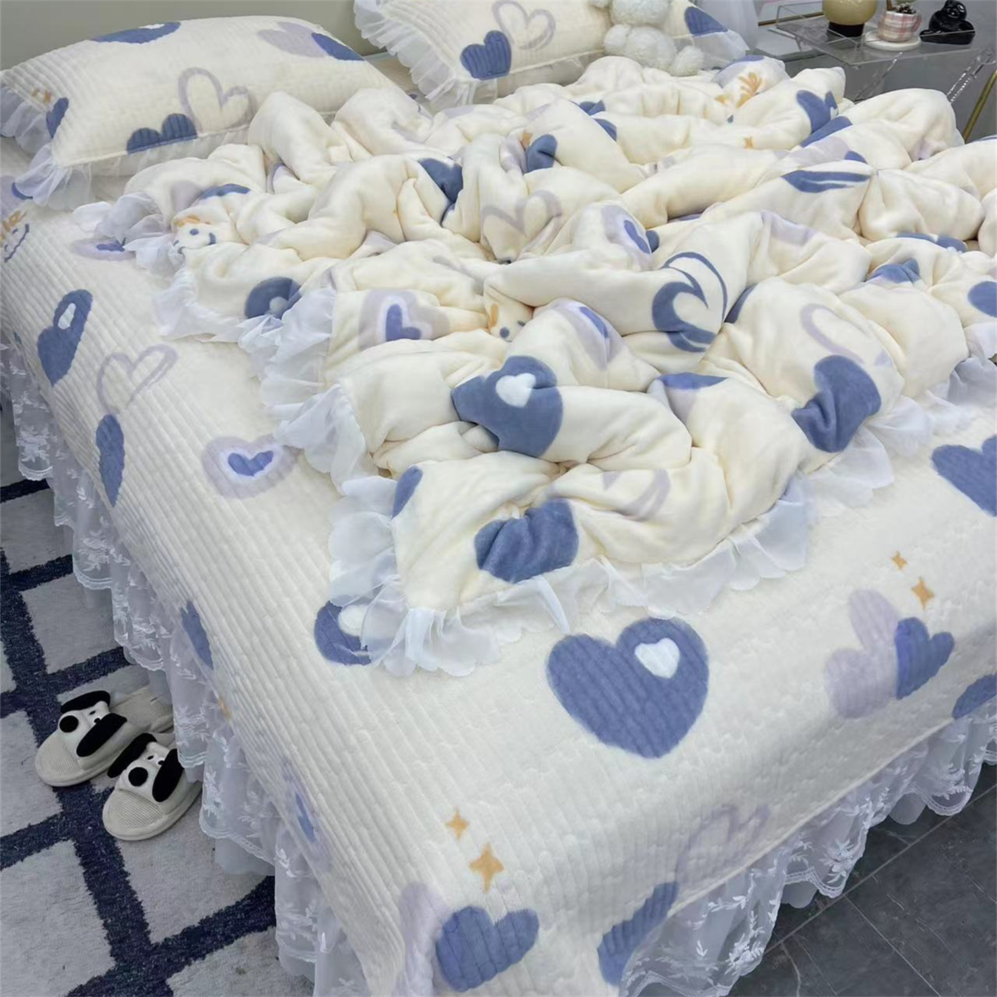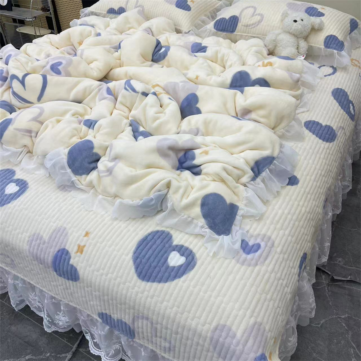 商品名称:禧瑞谷 2025新款冬季牛奶绒双层蕾丝花边床盖三件套床盖四件套 蓝底爱心