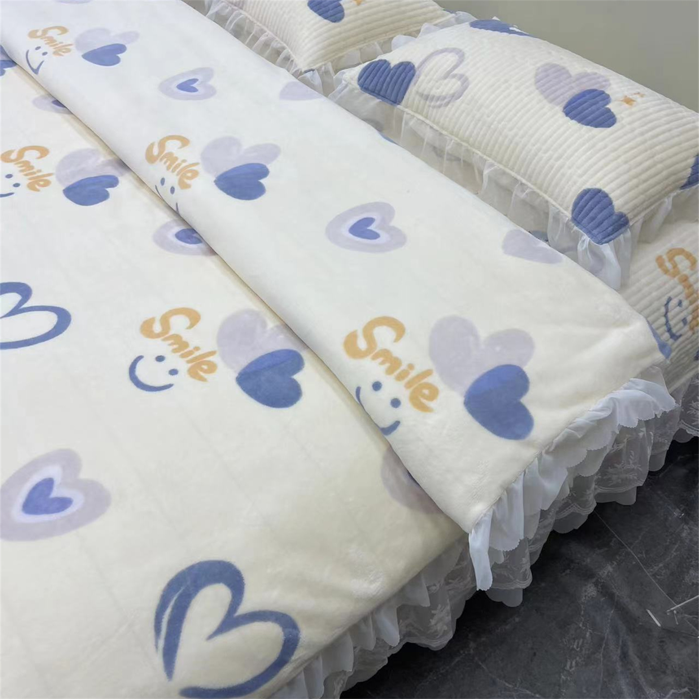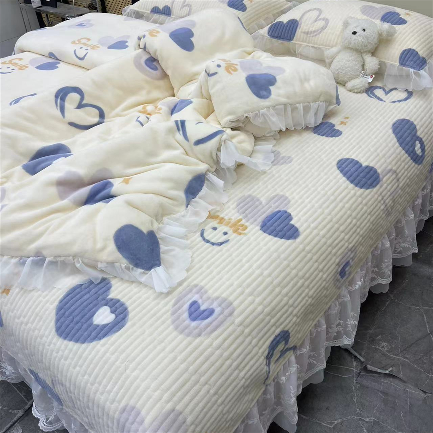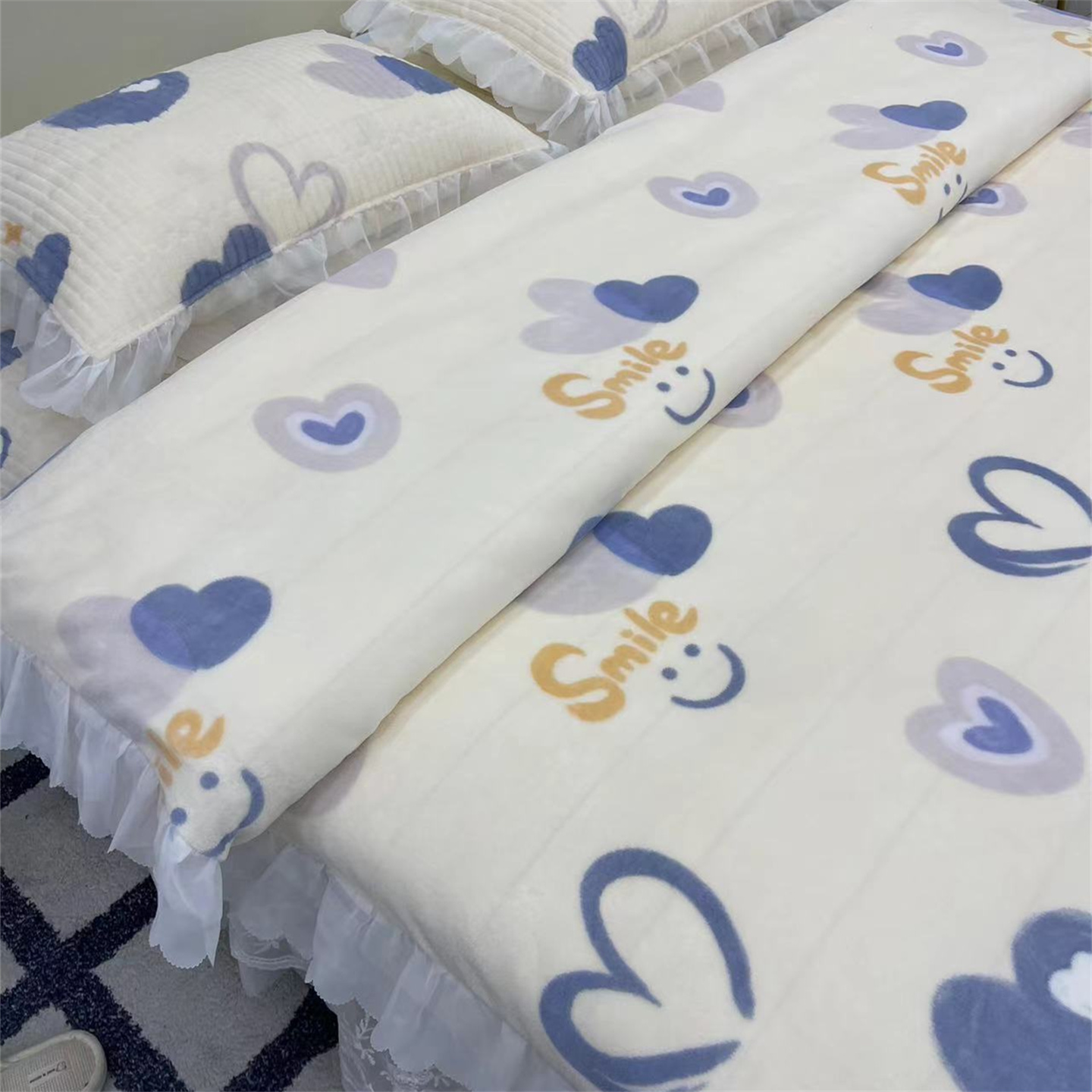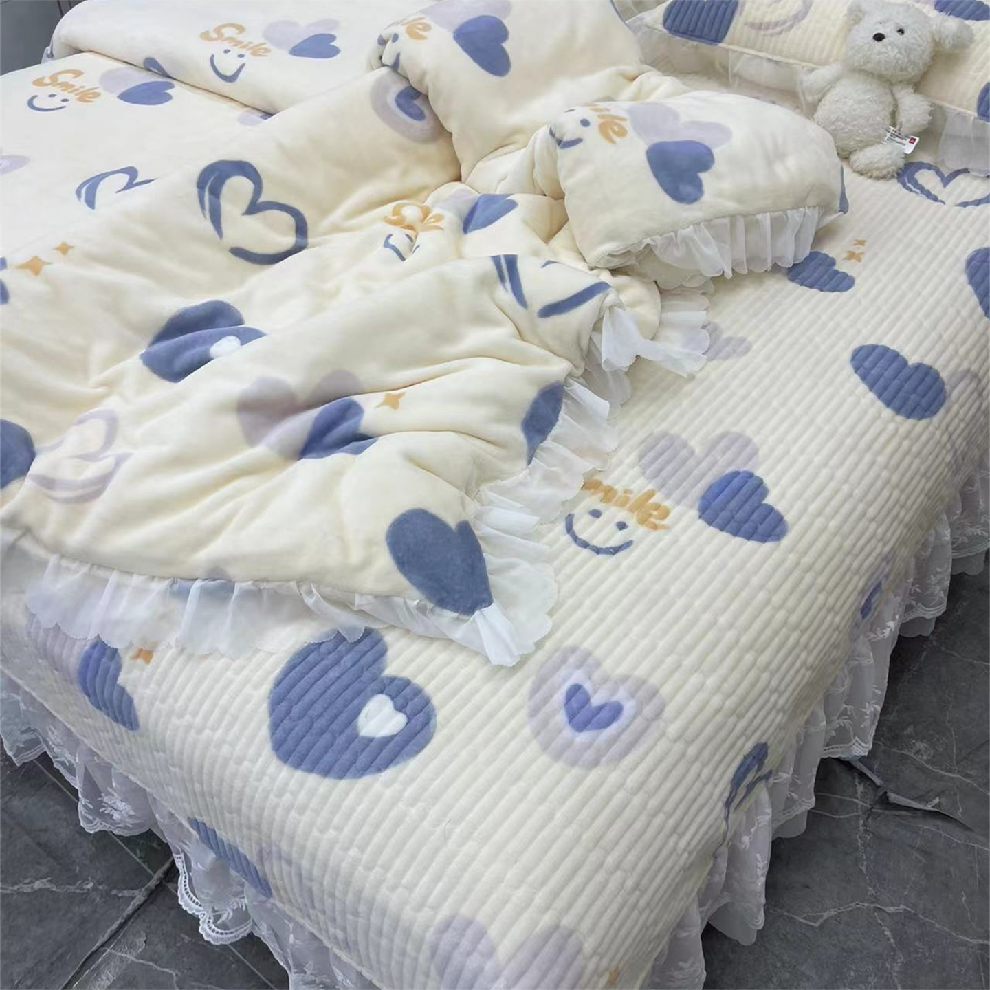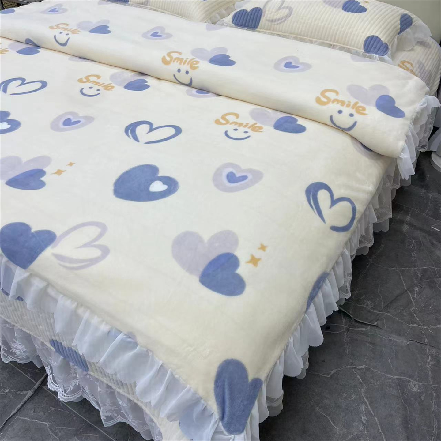 商品名称:禧瑞谷 2025新款冬季牛奶绒双层蕾丝花边床盖三件套床盖四件套 蓝底爱心