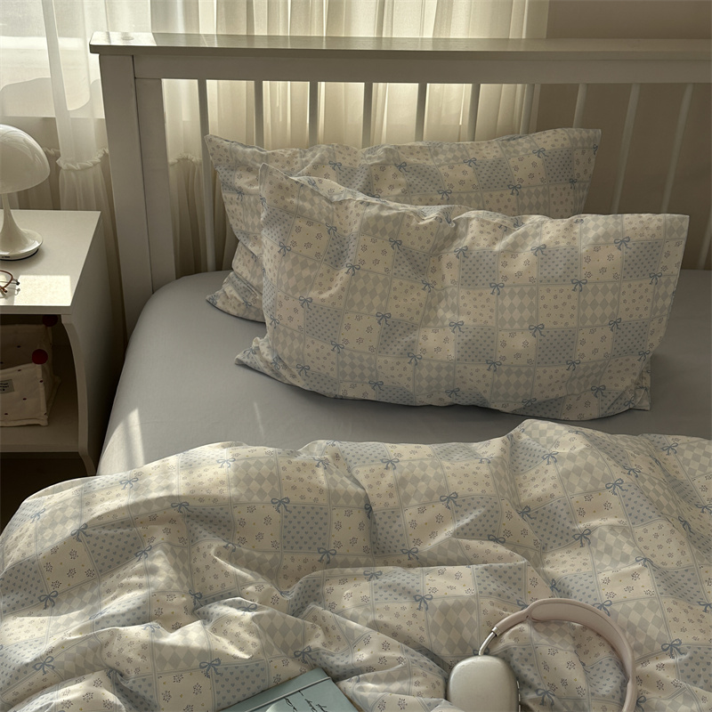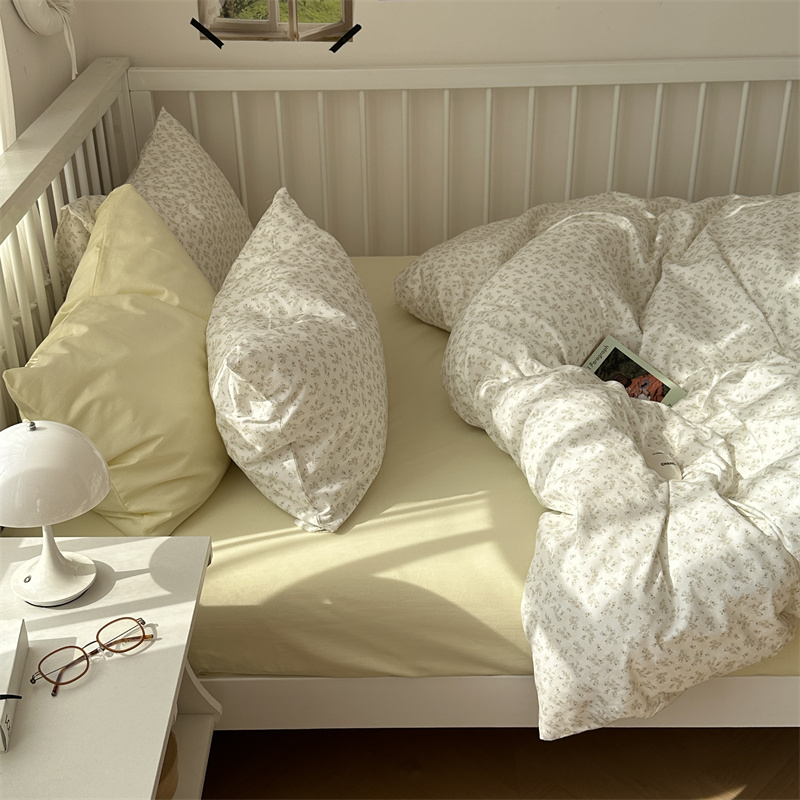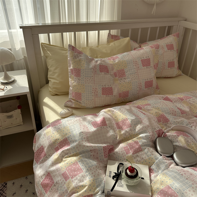 商品名称:尺素 2025新款纯棉卡通ins风四件套可爱少女风全棉被套纯色1.8床笠加大床单学生1.2三件套 清梦--浅黄