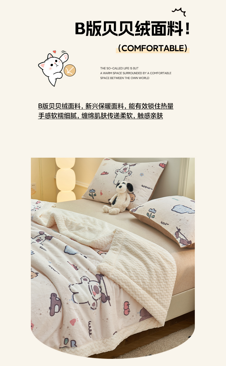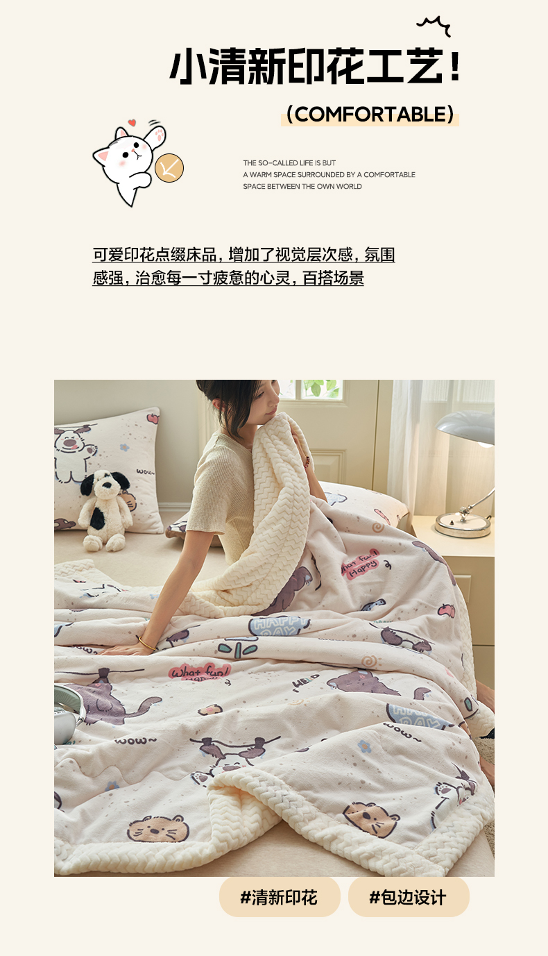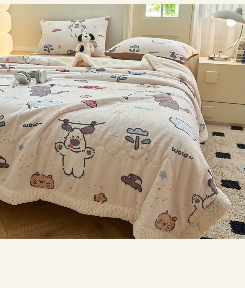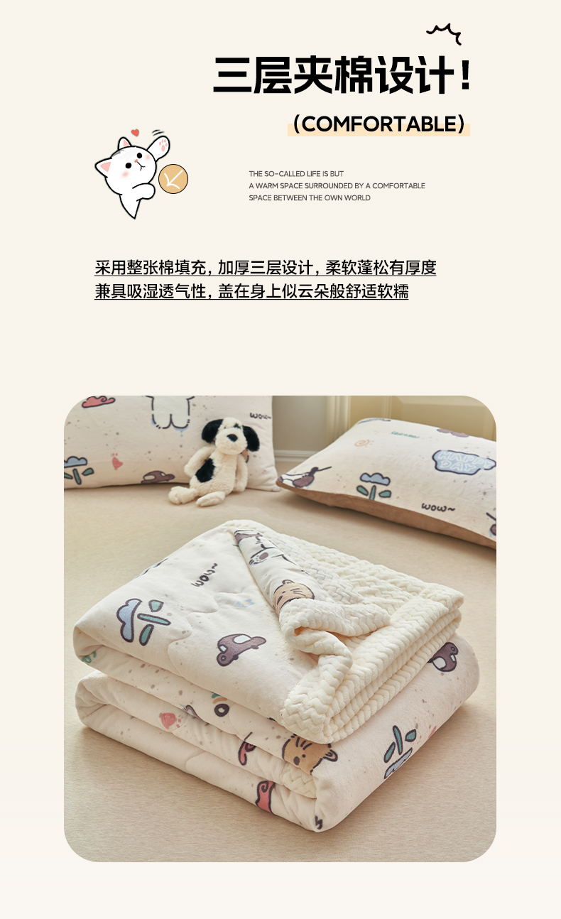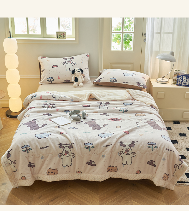 商品名称:晨曦家纺 2025新款加厚保暖牛奶绒贝贝绒三层夹棉毛毯可爱卡通 调皮猫狗