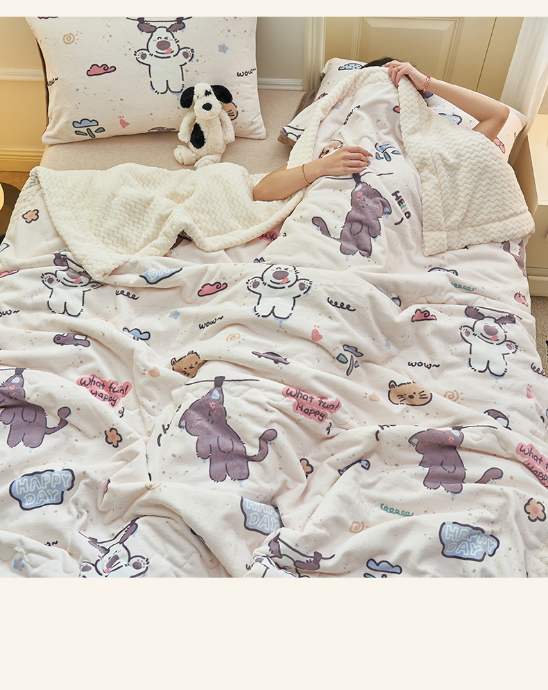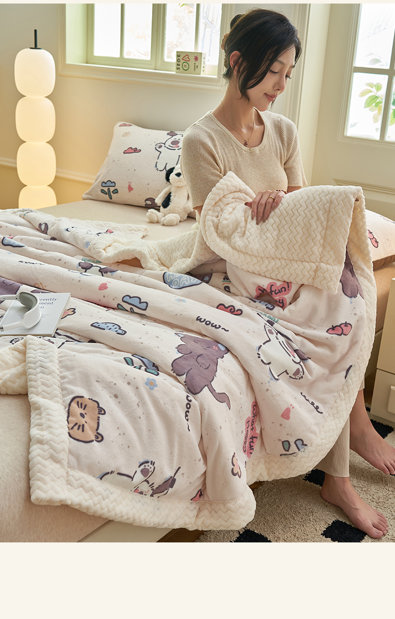 晨曦家纺 2025新款加厚保暖牛奶绒贝贝绒三层夹棉毛毯可爱卡通 调皮猫狗