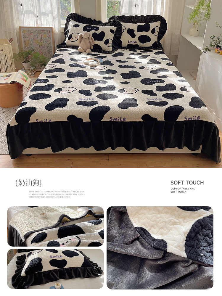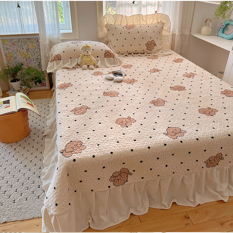红嘴企鹅 2025新款花边加厚牛奶绒单品床盖单件床盖三件套 波点狗