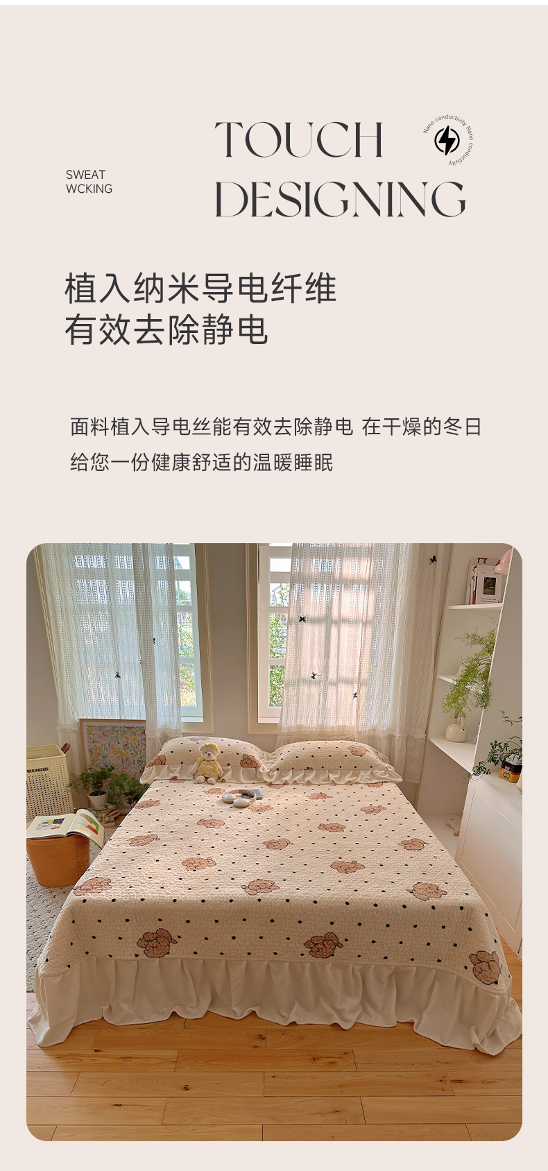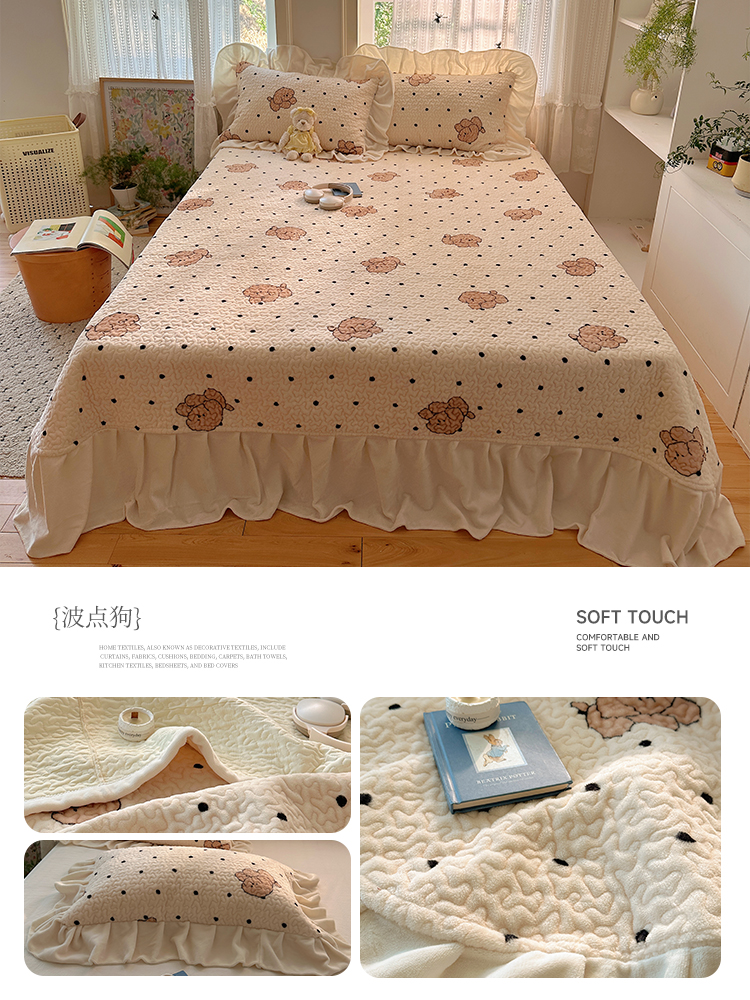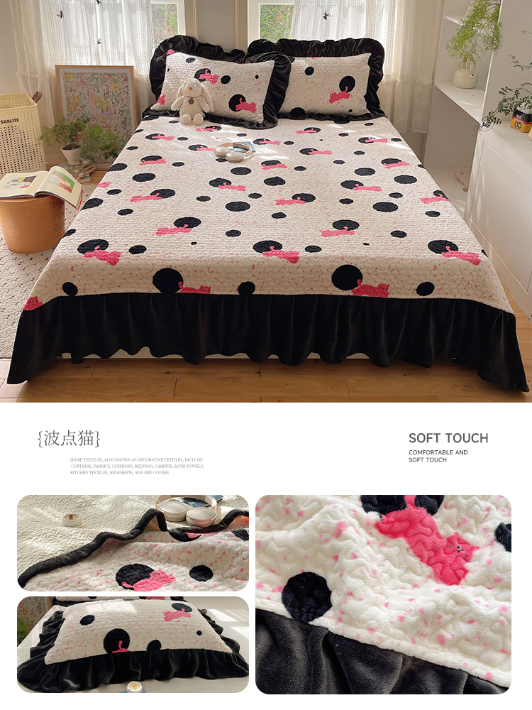 商品名称:红嘴企鹅 2025新款花边加厚牛奶绒单品床盖单件床盖三件套 波点狗