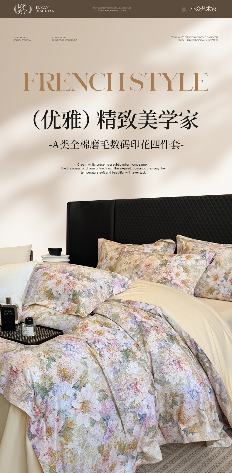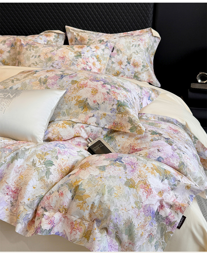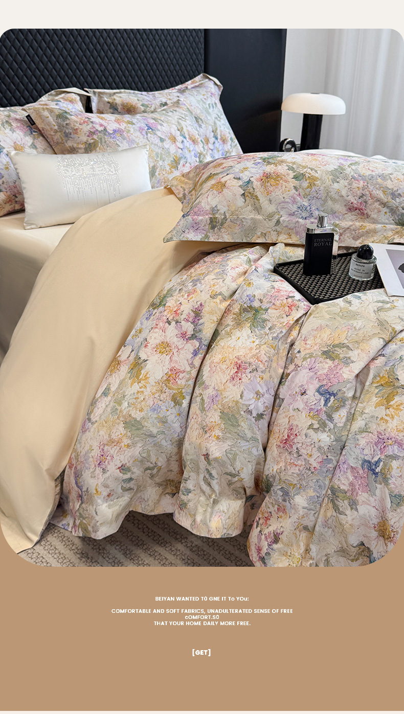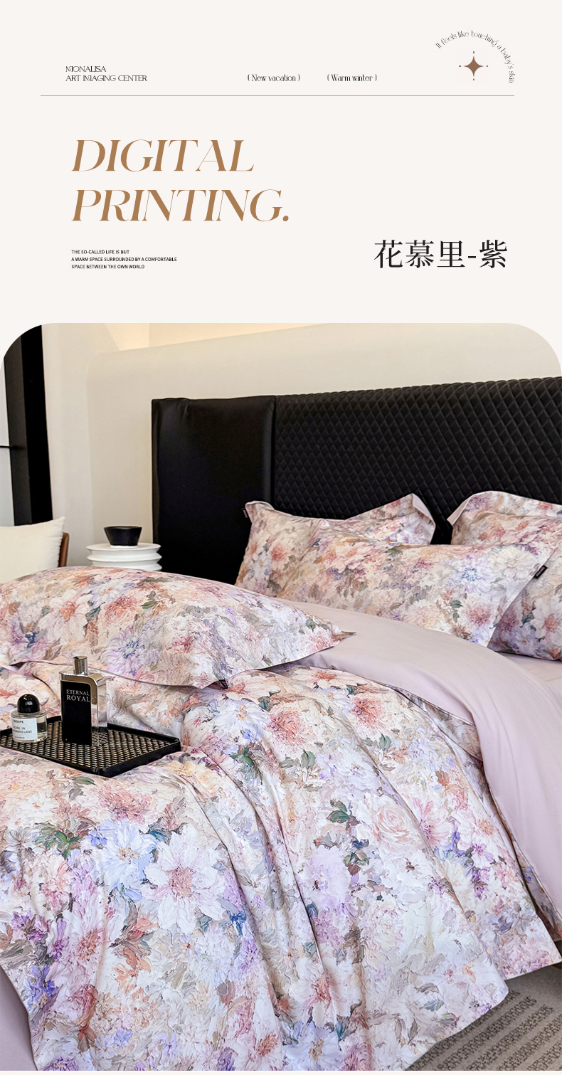 • 91家纺网 家纺一手货源 找家纺 (总)乔利卡沃 2025秋冬季A类加厚全棉磨毛四件套纯棉保暖美式轻奢长绒棉数码印花高端床上用品,花弄影-黄,花弄影-蓝,花弄影-米,花弄影-紫
