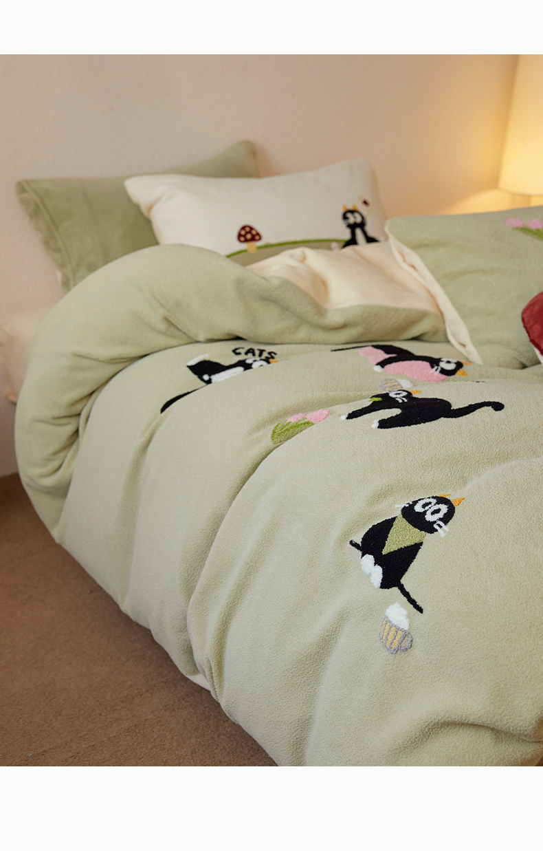 当前位置: 91家纺网 > 商品网购 > 床品套件 > 四件套 > 毛巾绣四件套 > 风向标家纺 2025新款卡通全消光暖呢绒毛巾绣四件套-风格一 炸毛小黑猫-灰绿