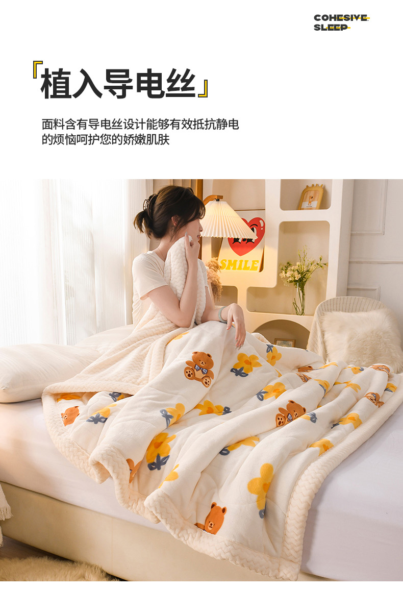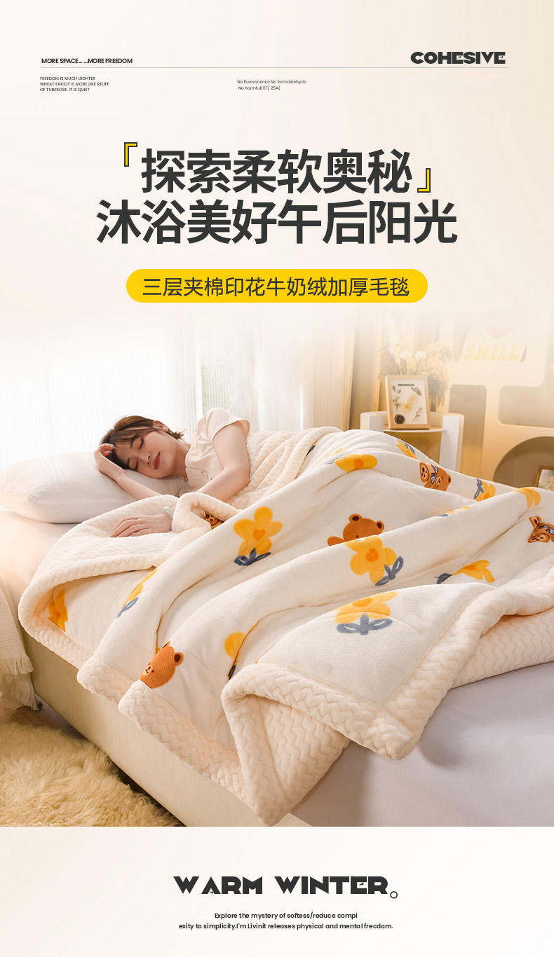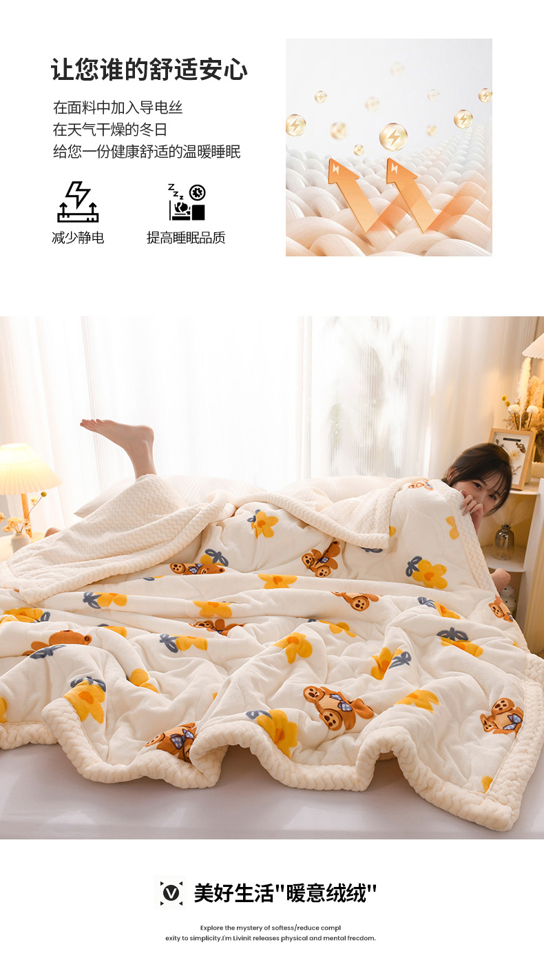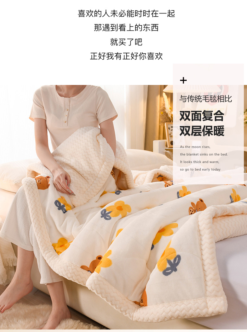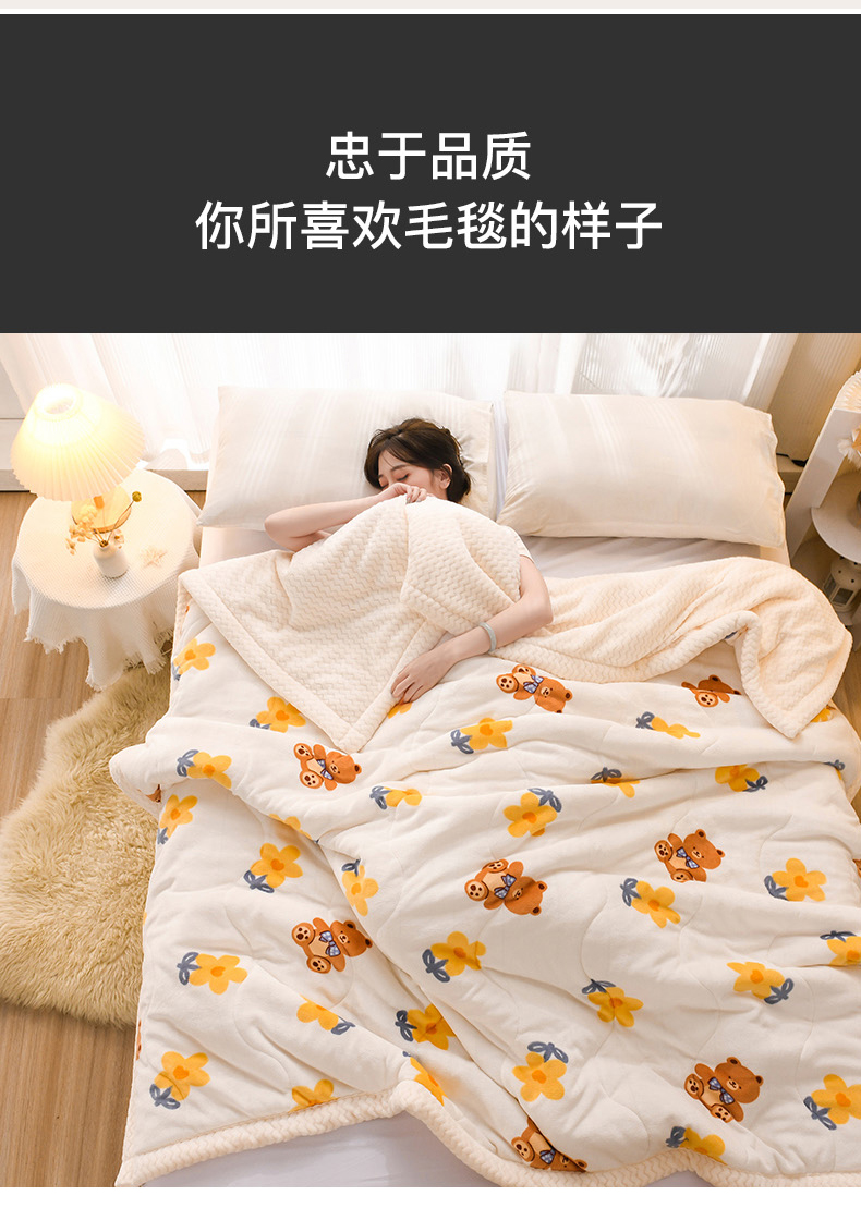 商品名称:印季家纺 2025新款三层夹棉印花牛奶绒毛毯毯子 花朵小熊