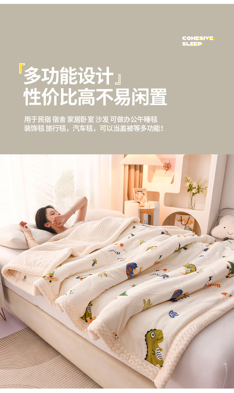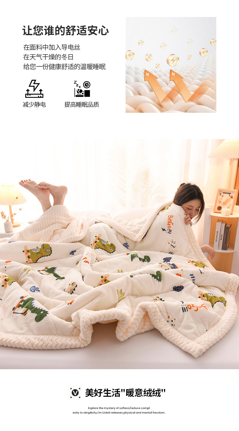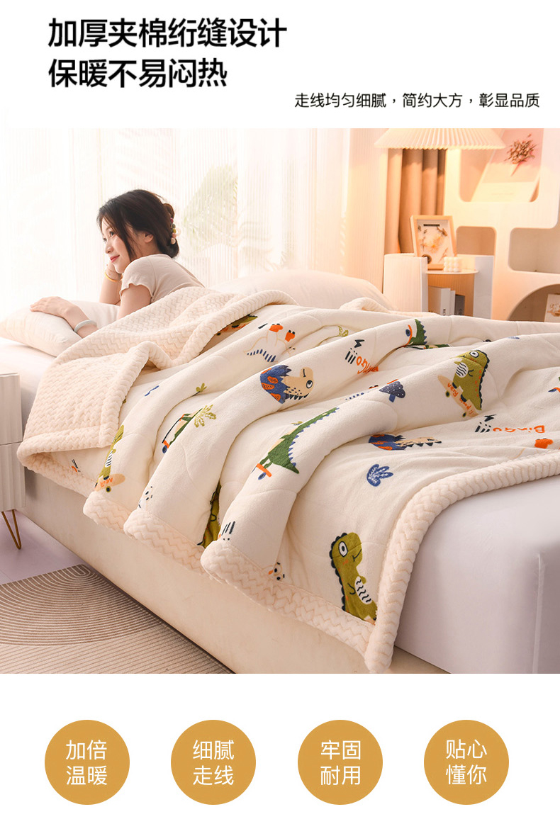 印季家纺 2025新款三层夹棉印花牛奶绒毛毯毯子 趣味恐龙
