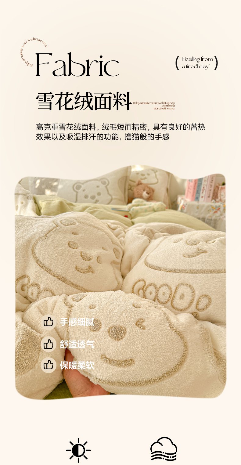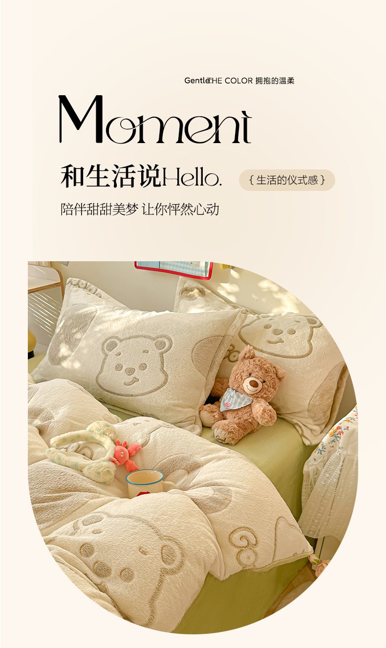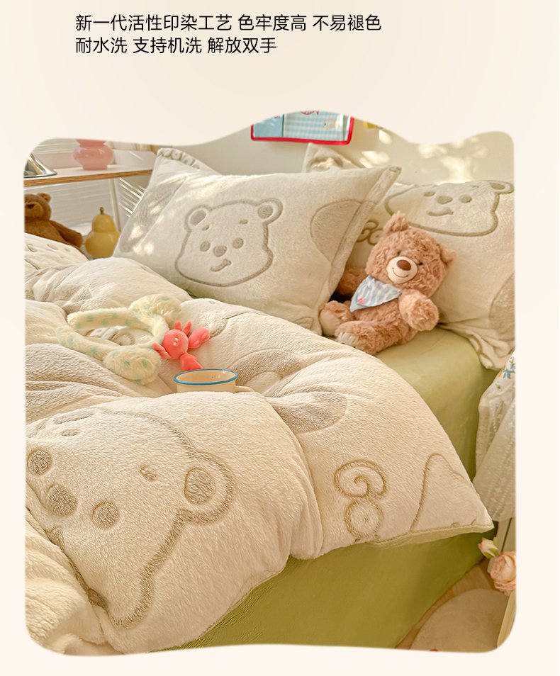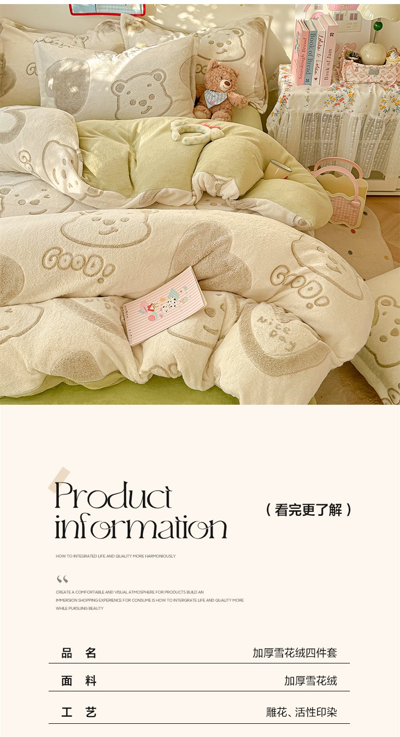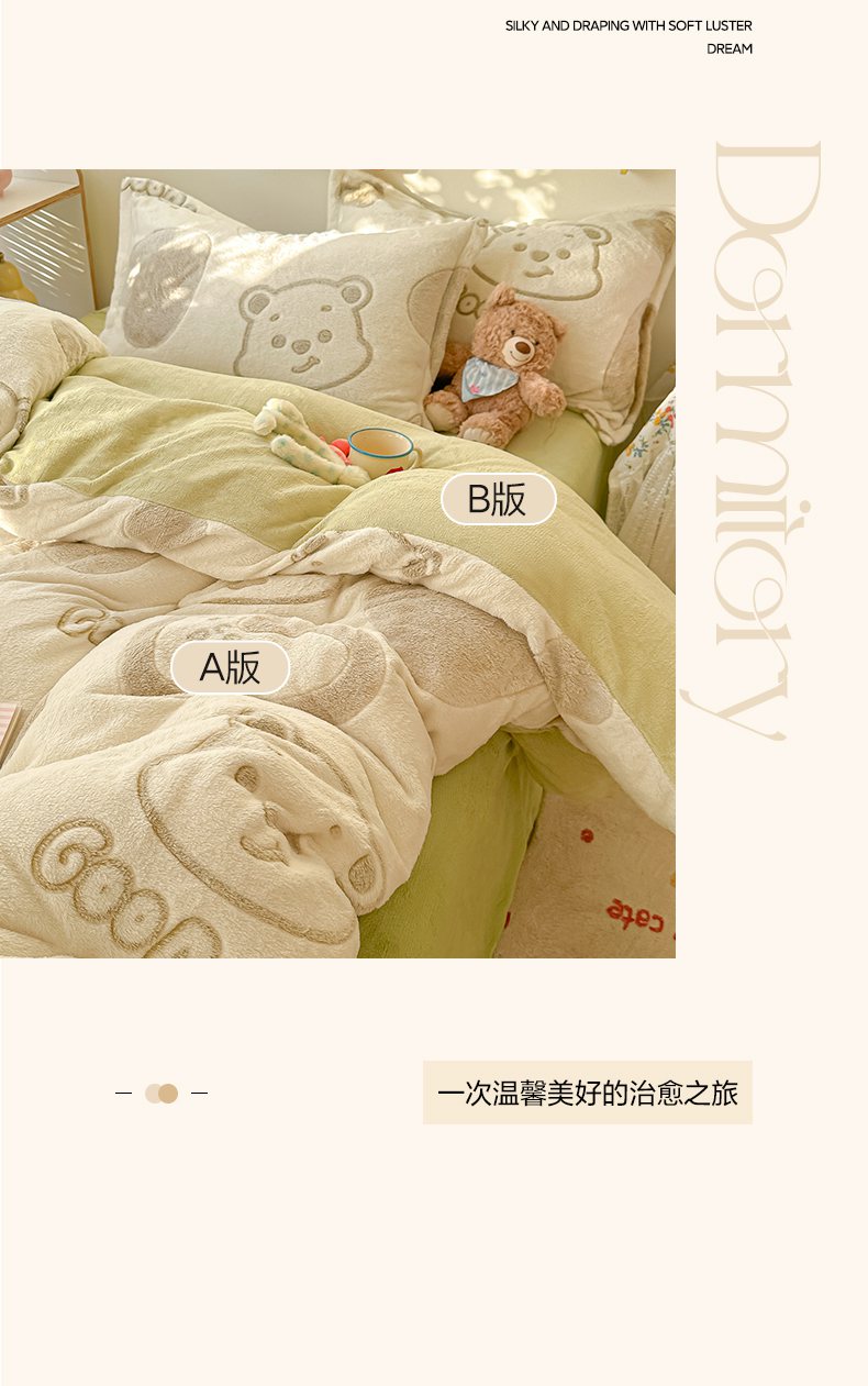 当前位置: 91家纺网 > 商品网购 > 床品套件 > 四件套 > 牛奶绒四件套 > 韩巢家纺 2025新款高克重雪花绒牛奶绒四件套系列 爱心熊(绿)