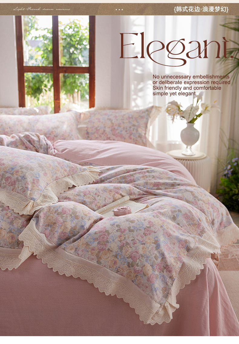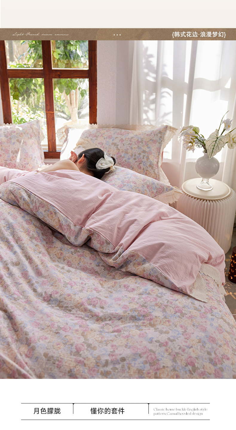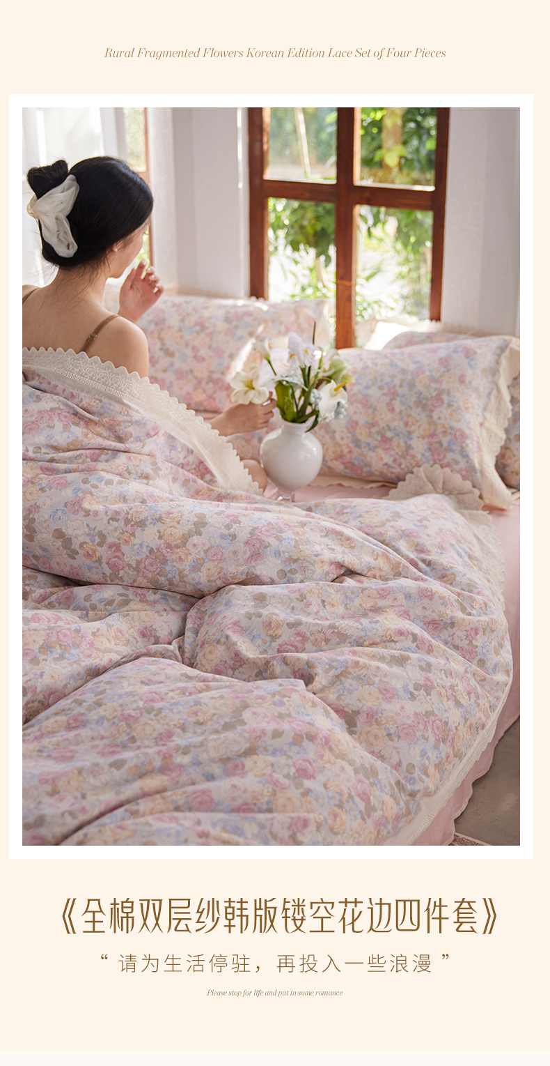 当前位置: 91家纺网 > 商品网购 > 床品套件 > 四件套 > 全棉普通四件套 > 梵克保罗 2026春夏新品韩版全棉纯棉双层纱镂空花边系列四件套 半岛花园-粉