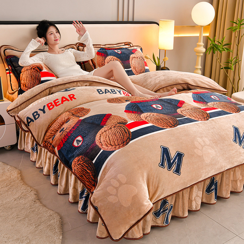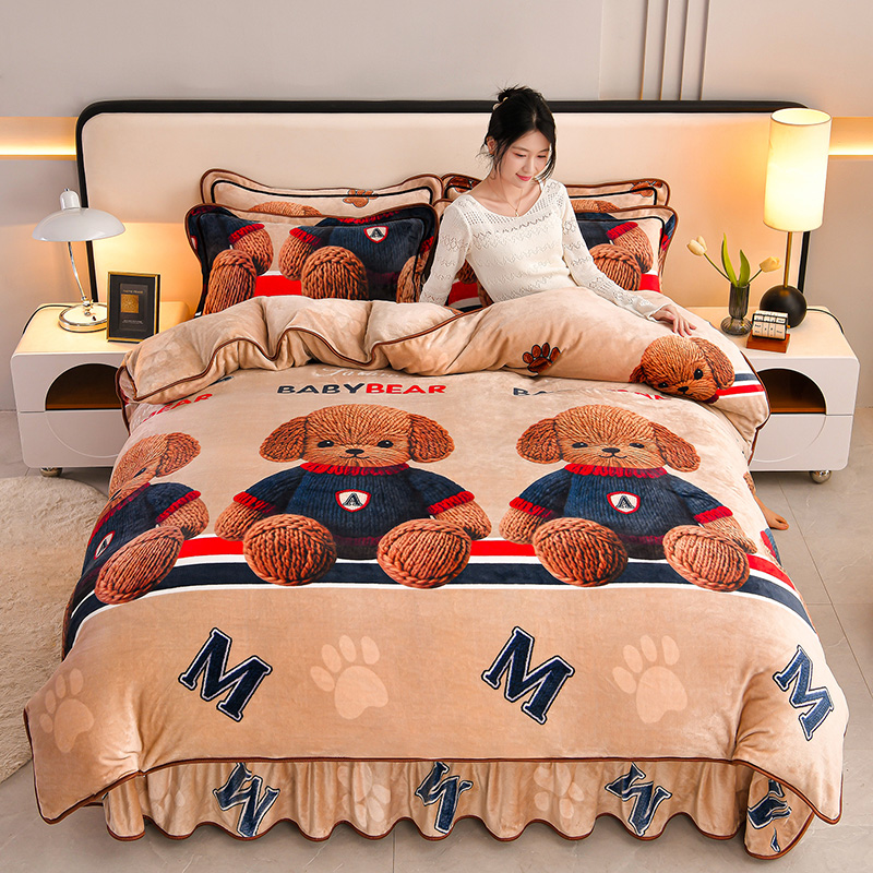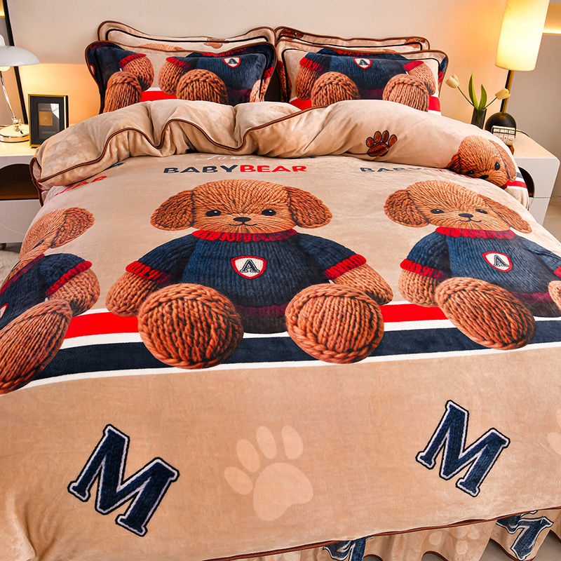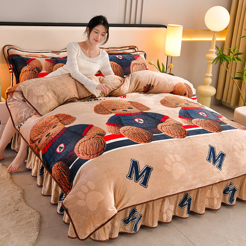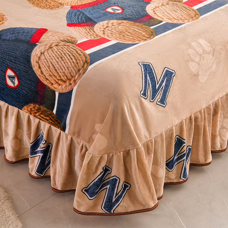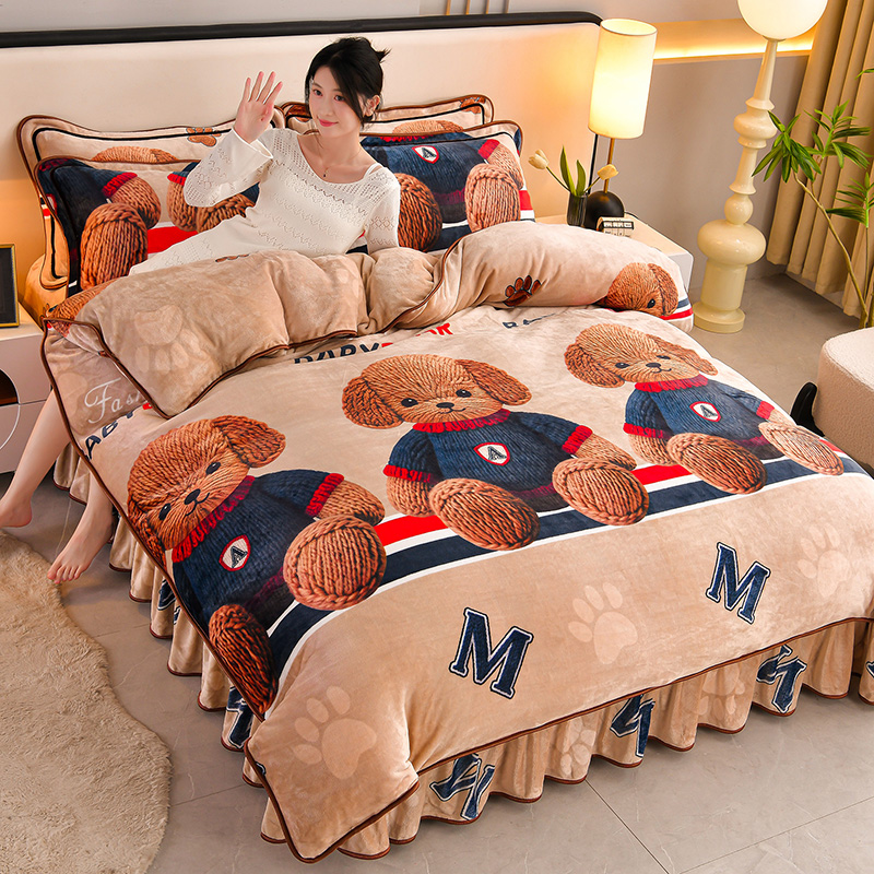 妮恒美 2025新款牛奶绒印花床裙款四件套法莱绒四件套珊瑚金貂绒四件套 酷酷熊