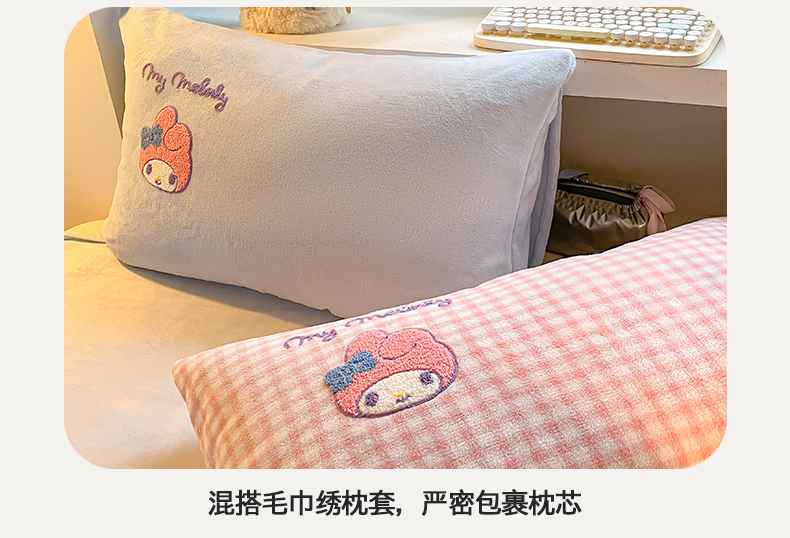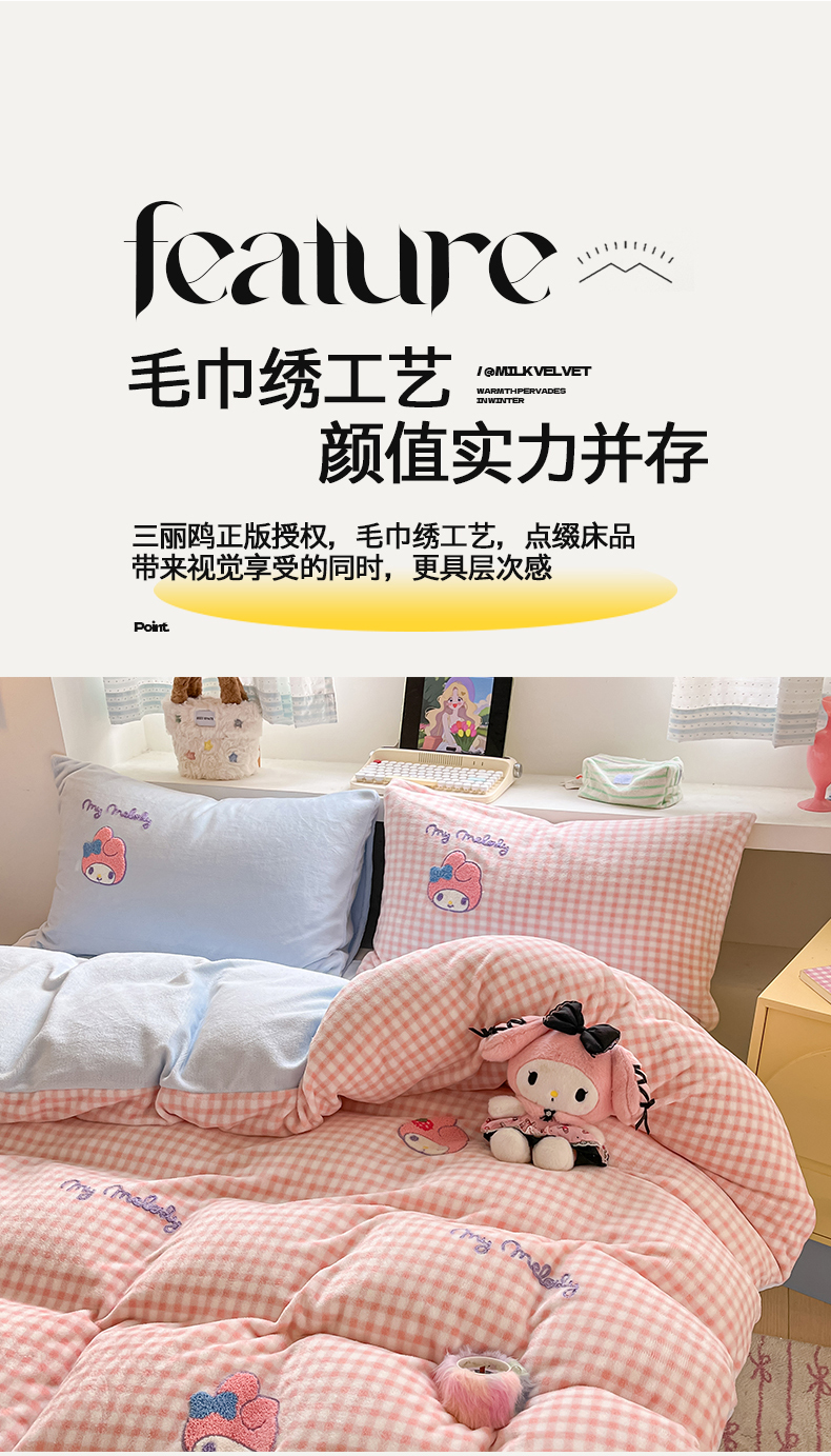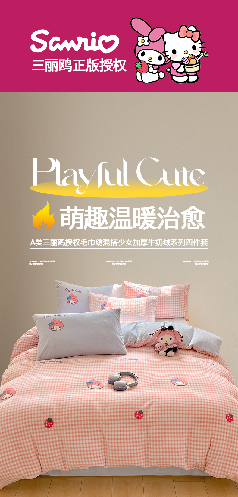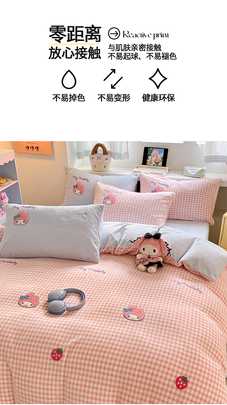 当前位置: 91家纺网 > 商品网购 > 床品套件 > 四件套 > 牛奶绒四件套 > 金爱家 2025新款A类三丽鸥授权毛巾绣混搭少女加厚牛奶绒系列四件套 绒毛巾绣-草莓美乐蒂粉蓝