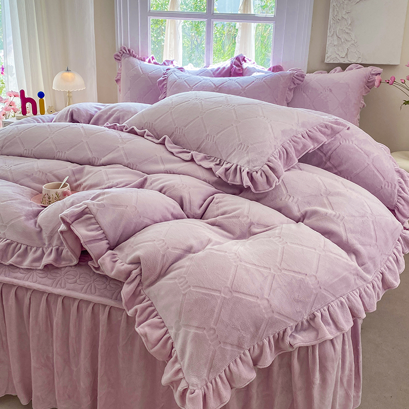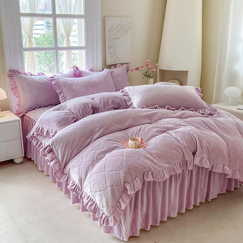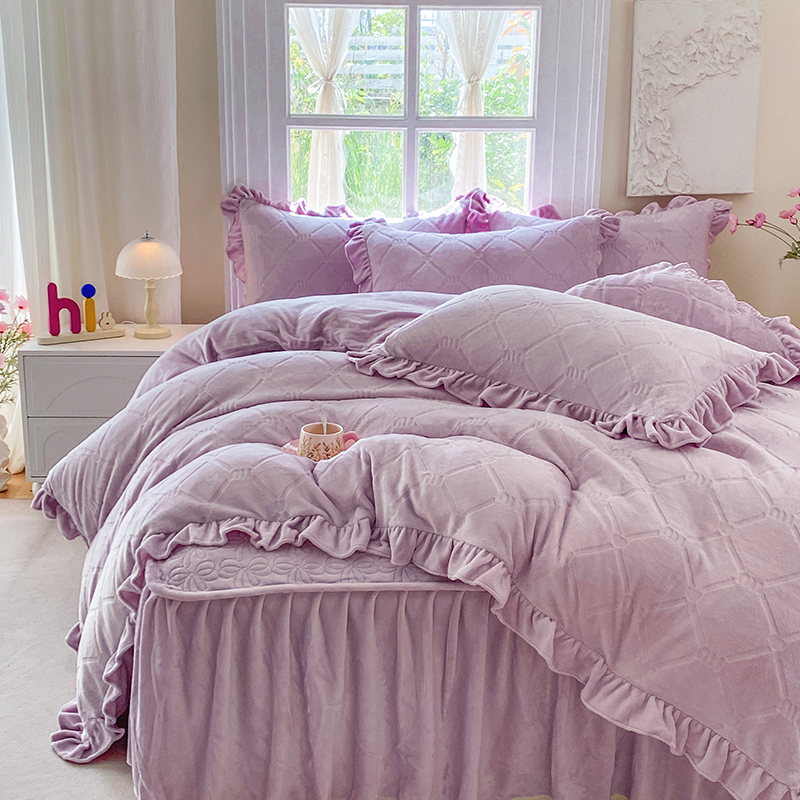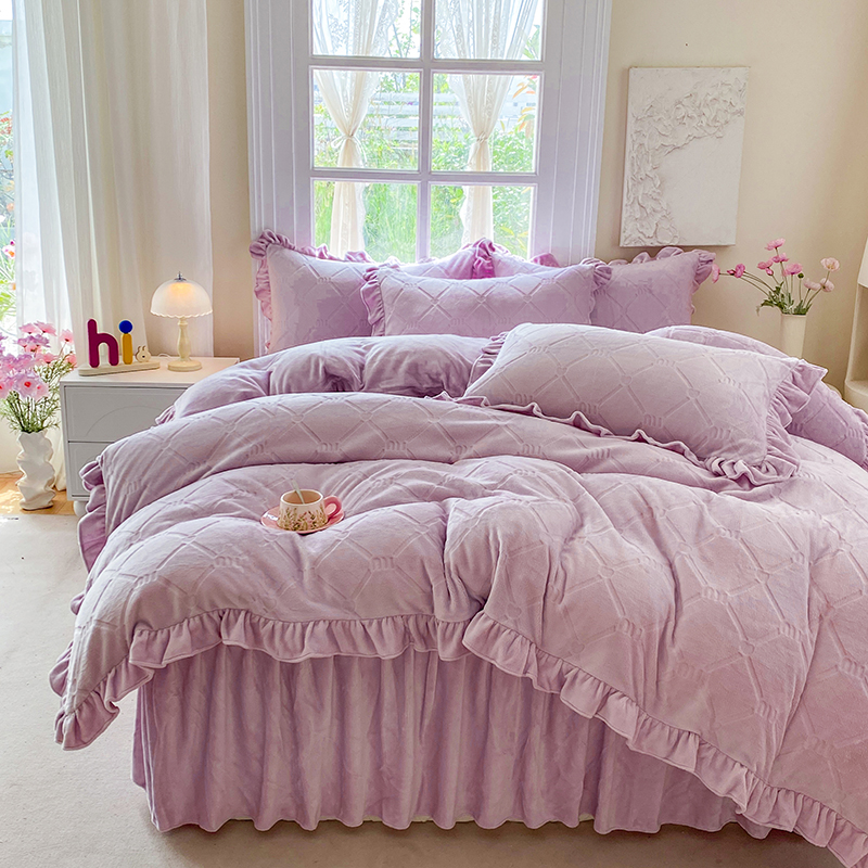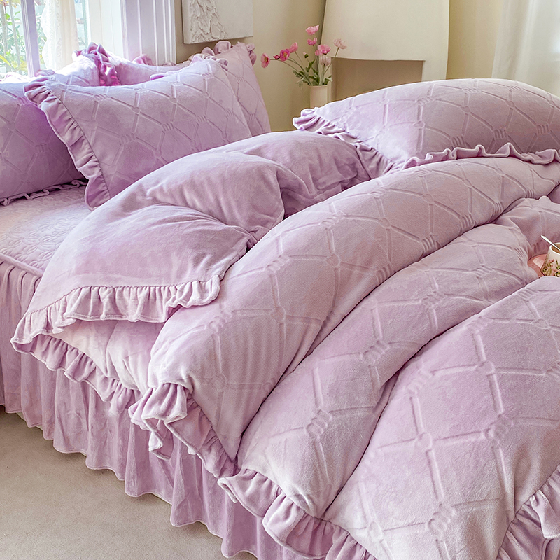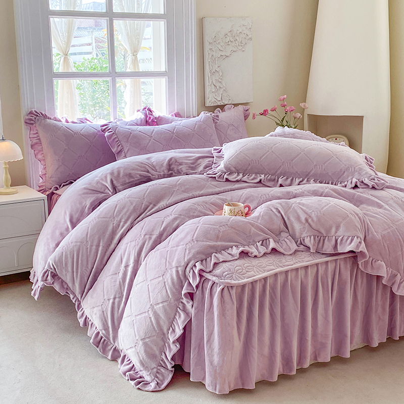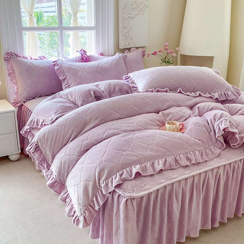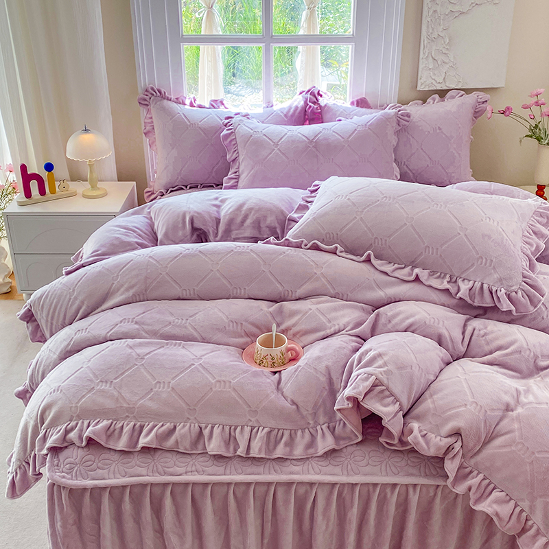 商品名称:乐嘉盈 2025新款雕花牛奶绒床裙款四件套-字母菲菲 字母菲菲-紫色