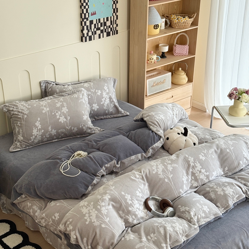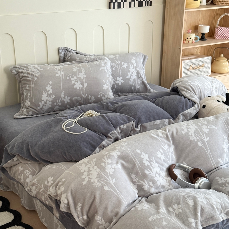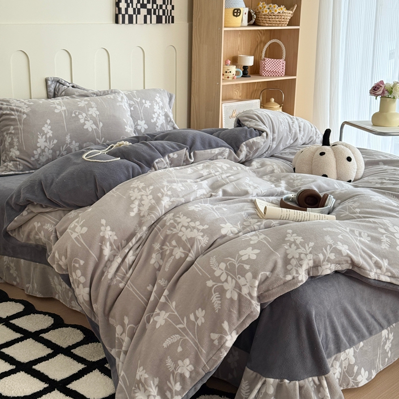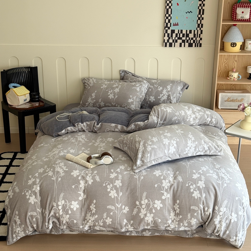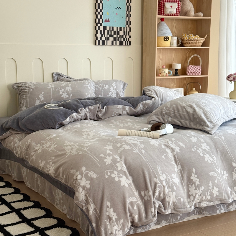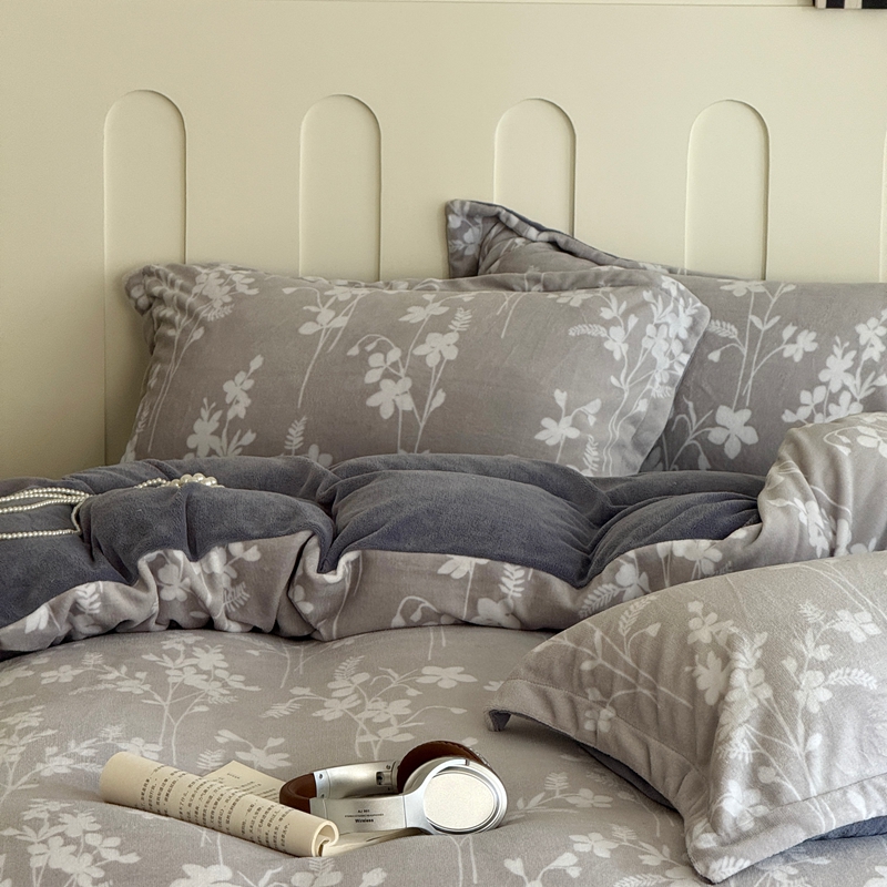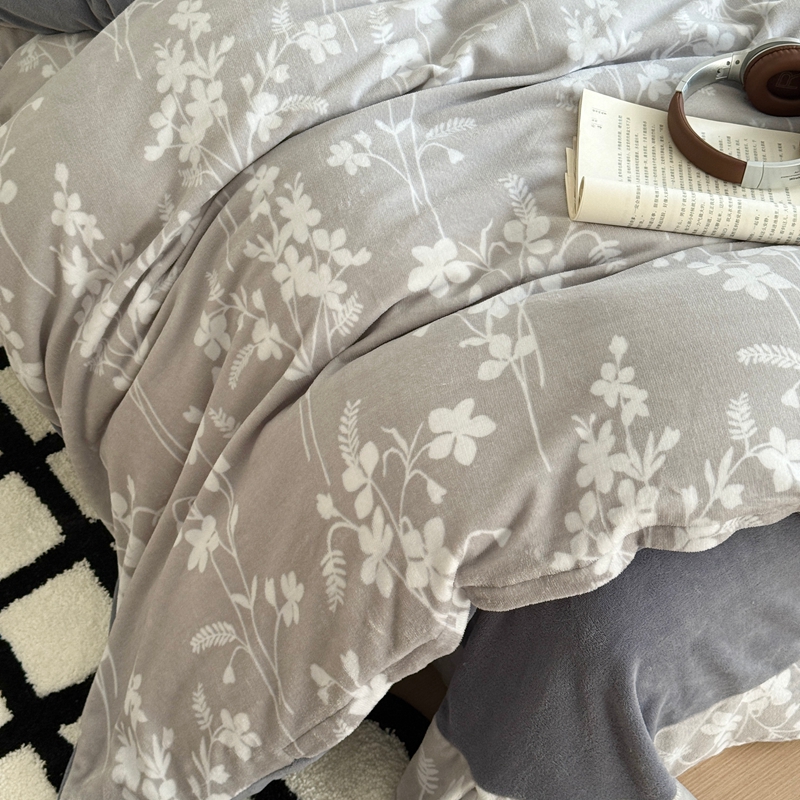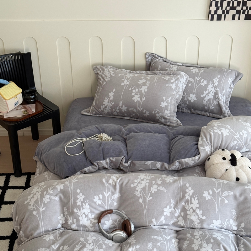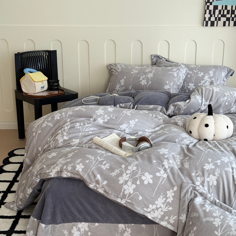 于果 2025新款牛奶绒印花四件套 繁花里灰
