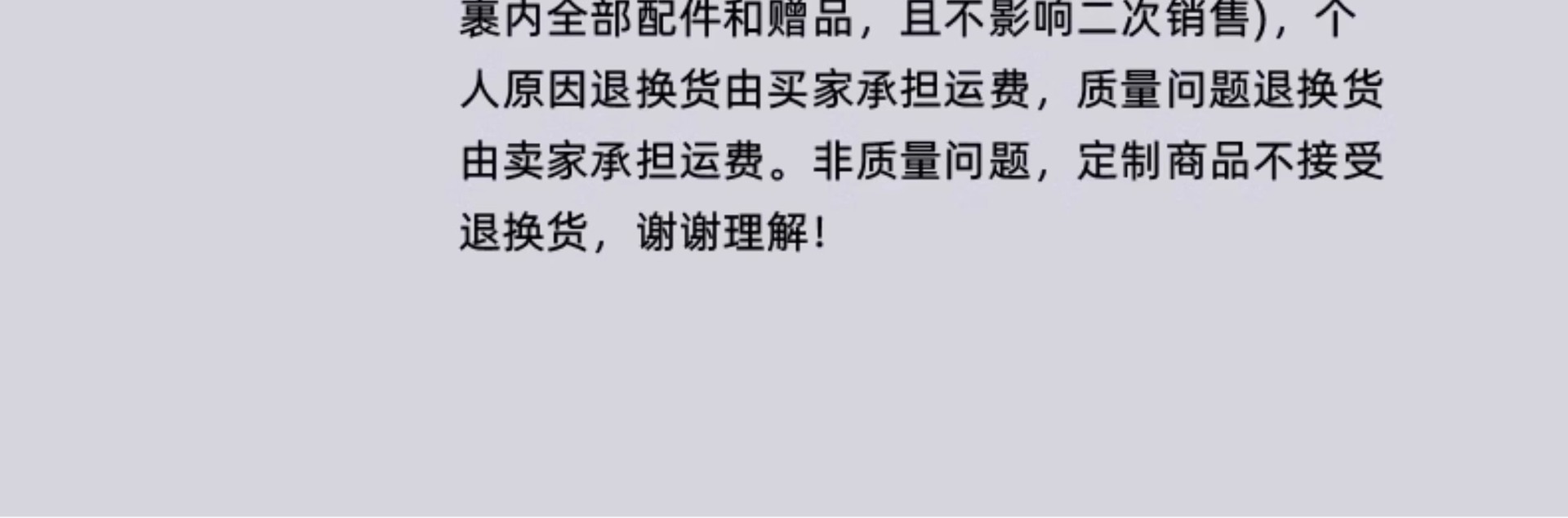 | 非质量问题、不影响二次销售,在30天内支持退换货。 | |
